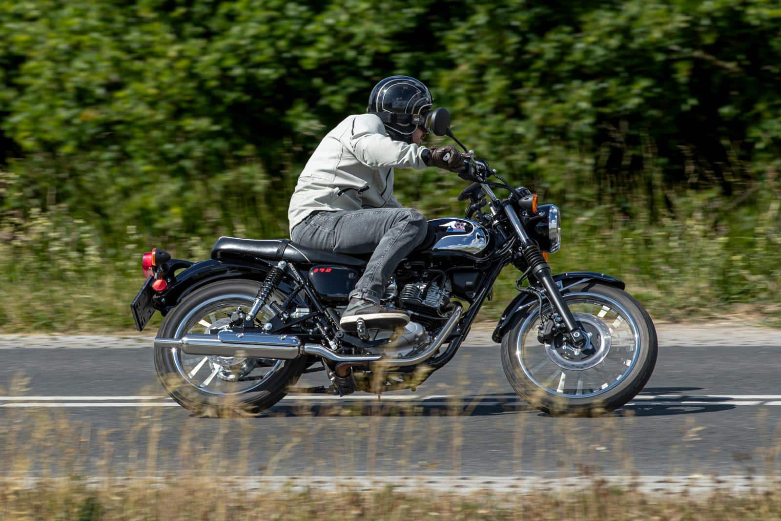 Vandaag zijn we alleen met de Meguro S1 aan de rol, die in zekere zin de luxe-variant is van de Kawasaki W230. De S1 krijgt niet alleen een iets lagere zit (740 vs 745 mm) aangemeten, maar ook een witte bies rond het zadel, een ander kleur qua wijzerplaat, de Ebony-kleurstelling, een gefreesde rand op de koelvinnen van het blok én die waanzinnig mooie chromen tank met Meguro-badge. Ons vermoeden is dat vooral die laatste combinatie verantwoordelijk is voor het enigszins pittige prijsverschil van 700 euro tussen beide machines: 5.499 euro voor de W230, 6.199 euro voor de S1.