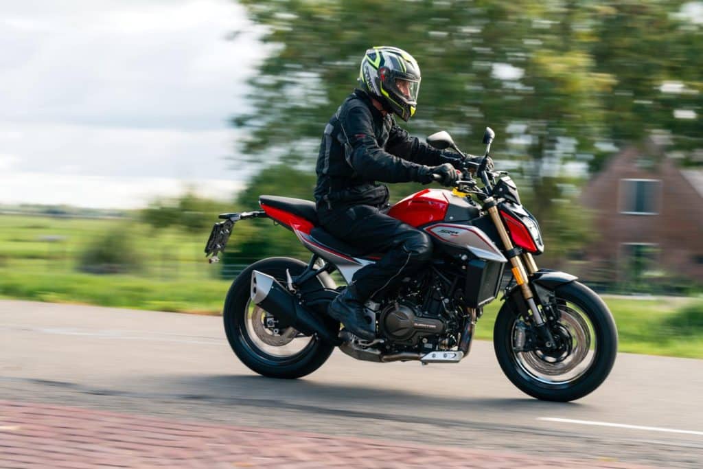 ‘Op de SRK 600 naked bike zit ik het best. Je zit lekker in de motor en je rug is mooi recht. Misschien zelfs wat té recht, waardoor het minder sportief aanvoelt. Bij de 800-viercilinder zit je meer op de motor en daardoor miste ik wat focus op het rijden en het verkeer. Ook de SRK 600 RS beviel me goed qua comfort. De zitpositie is iets sportiever, maar het is nog prima uit te houden.’