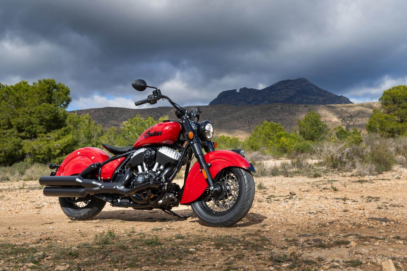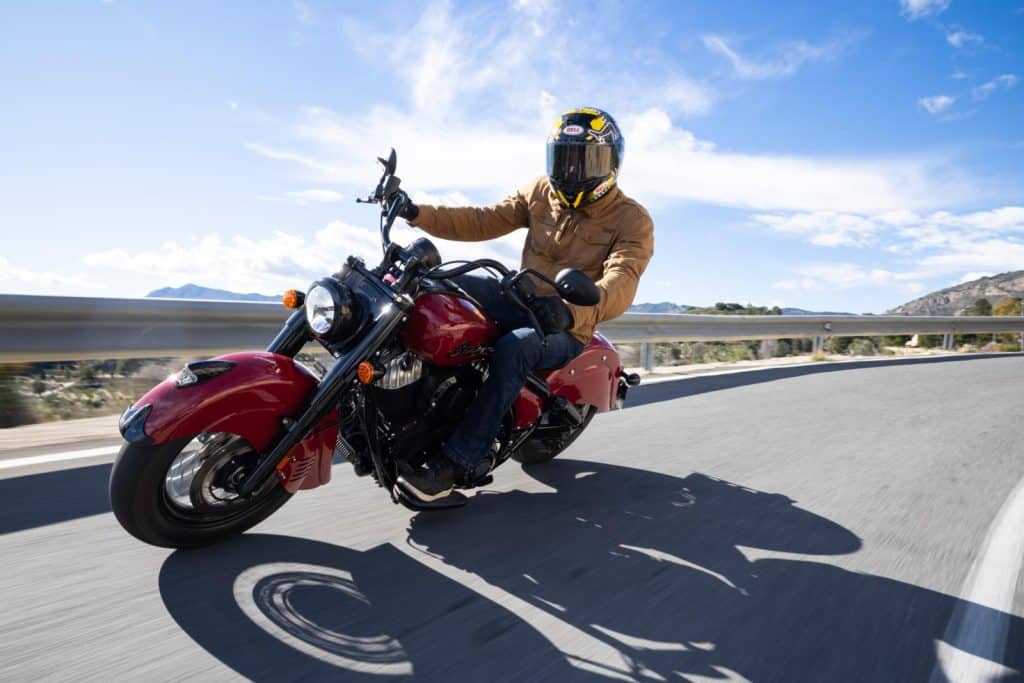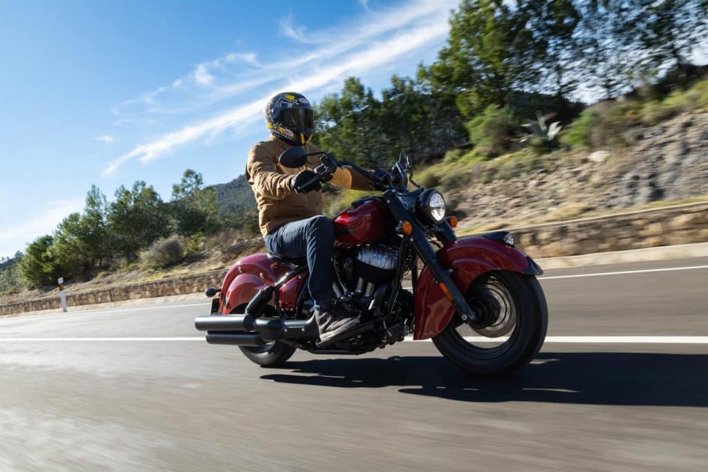 Voor deze test bevinden we ons op een plek waar heel wat mensen rondslenteren die wellicht in de jaren ‘40 geboren zijn: Benidorm. Gelukkig zijn we niet in het drukke centrum – je zou de oudjes zomaar een hartaanval bezorgen met al die motoren – maar trekken we ten zuiden van de kuststad de bergen in. Zeker niet het ideale terrein voor de 327 kg zware Vintage, maar hij laat er zich gewillig door sturen. Om te beginnen zit je comfortabel en ontspannen op de Chief. Je achterwerk op het solozadel, je handen aan het brede stuur en je voeten op de ruime voetplanken. Dit is een positie waarin je het uren kunt uithouden. Let er wel op dat je niet kunt verzitten op het solozadel – de billen waren maar wat blij dat de testdag erop zat. Maar nu lopen we te ver vooruit.