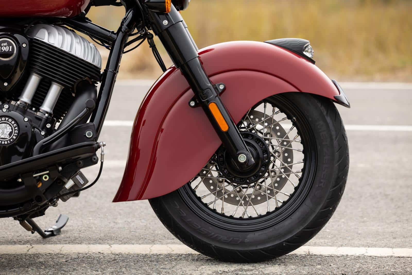 Na de testrit raakten we aan de praat met de designdirecteur van Indian, Ola Stenegärd. De Zweed vertelde ons met veel enthousiasme welke designkenmerken hij het leukst vindt aan de Chief Vintage. ‘Waar ik het meest trots op ben, zijn de spatborden die uit één stuk staal zijn geperst. Bij vorige versies van de Chief Vintage gebruikten we een centraal spatbord, met daaraan gelaste zijspatborden. Nu hebben de ingenieurs een manier gevonden om het uit één stuk te persen. Verder is ook het solozadel interessant. We wilden eerst het zadel van de Scout gebruiken, maar dat was te smal voor de bredere Chief. Daarom bekeken we zadels van oude modellen uit de jaren ‘30 en hebben daarop dit moderne design gemaakt. Het zadelframe is van aluminium en is rechtstreeks gemonteerd op het motorframe, zonder extra vering, omdat het comfortabel genoeg is en het geheel er daardoor ook strakker uitziet.