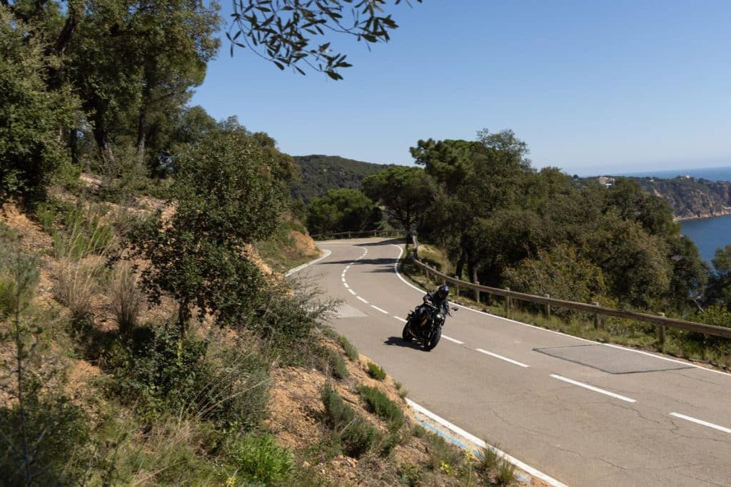 Na een koffie in Tossa de Mar, waar m’n collega even lovend is over de Z, gaat het richting de GI-681. Een vloeiende weg met perfect asfalt en hier trek ik de pin helemaal uit de granaat. Het zijn de eerste-montage Dunlops die hier aangeven dat het welletjes is en ik kan ze geen ongelijk geven, want het tempo dat we rijden hoort eerder bij een sportmotor. Maar het rijwielgedeelte geeft verder geen krimp, dus met een set banden die niet puur op budget zijn gemaakt, kan je met een Z650 vanuit de underdogpositie hoog aangeschreven rijders het vuur aan de schenen leggen. Vraag maar aan Dominique Sarron – als in GP 250-wereldkampioen Dominique Sarron – die bij een Spaanse bandentest op een serieuze sportmotor me met een Z650 op een vergelijkbare weg niet uit z’n spiegels gereden kreeg. Wat voor alle duidelijkheid geen pluim is op mijn hoed, maar die van de Z650 des te meer. Met de Z650S zou het nog makkelijker zijn gegaan.
