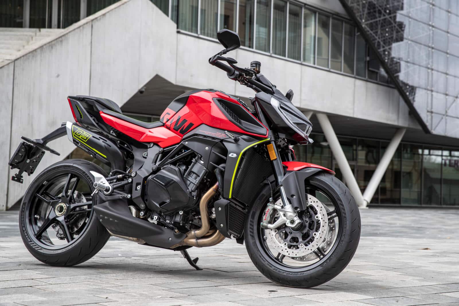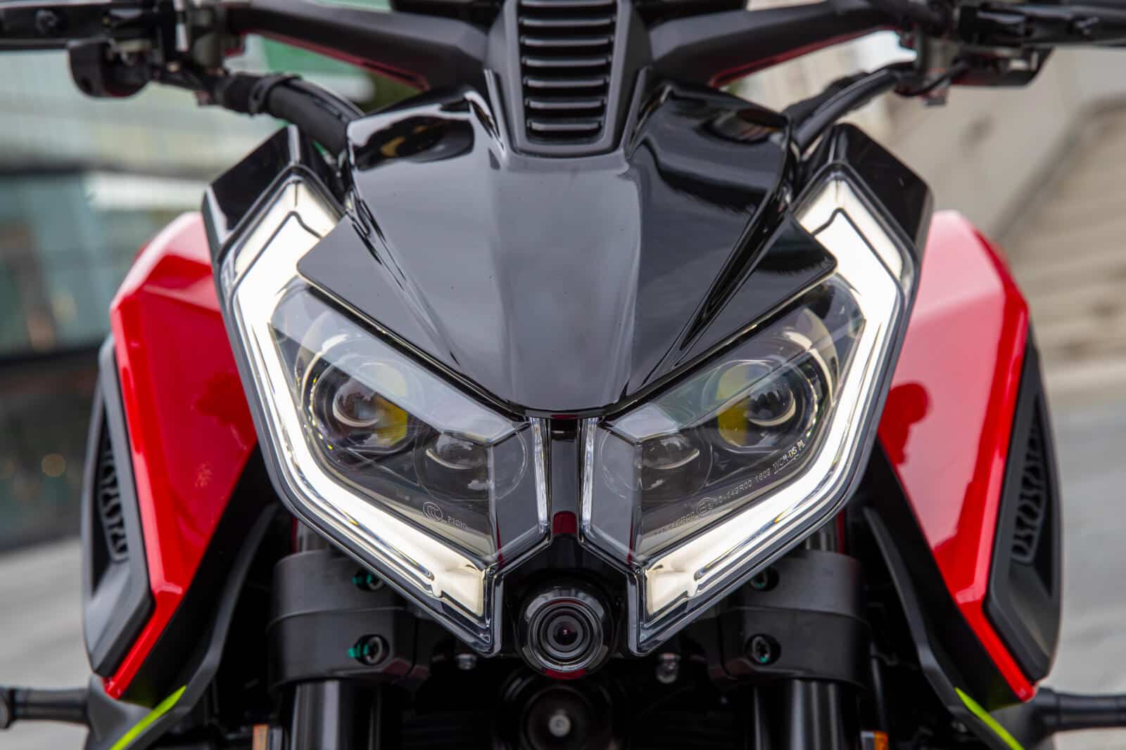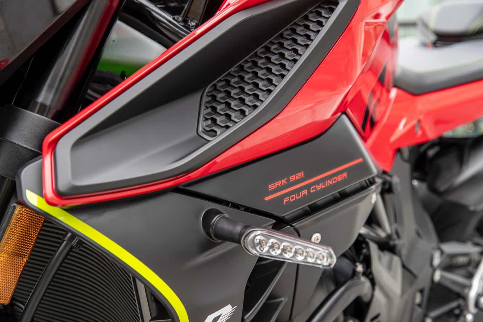 Ik weet het, elk z’n smaak. Maar het is aartsmoeilijk om niet onder de indruk te zijn van de SRK 921 als je ‘m eenmaal voor je neus ziet staan. Van de trotse voorkant met DRL’s als oplichtende jukbeenderen, over de brede, door luchthappers afgezoomde torso, de mooie combinatie van gegoten alu subframe en het trellisframe, de enkelzijdige achterbrug, de split-spoke wielen, tot het erg geslaagde kleuren- (zwart/grijs) en textuurspel (mat/glans) op tank en kuipwerk. Of de in de uitlaatdempers ingewerkte duovoetsteunen, de in kuipwerkvleugels ingewerkte ledverlichting achteraan, de harde koelleiding links die visueel opgaat in het trellisframe, het opvallend gepositioneerde contactslot en de manier waarop de spiegels zijn ingewerkt in de hendelprotectoren… Ik kan nog wel even blijven doorgaan. Het exclusieve niveau van aandacht voor detail en design van een MV, met het prijskaartje van een middenklasser. Mooi!