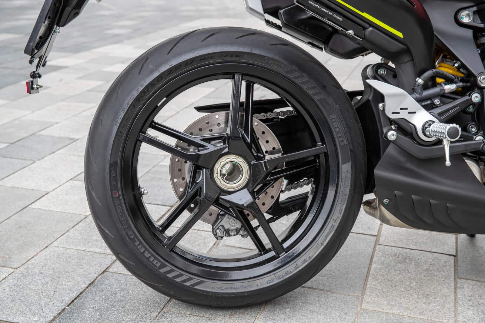 Bovendien leest de meer ‘functionele’ componentenlijst als de catalogus van leveranciers die je normaal gezien een stuk dieper in je portemonnee laten tasten. Radiale Brembo Stylema-monoblocs. Een volledig instelbare 50 mm Marzocchi usd-vork, een monoshock met extern reservoir én een instelbare stuurdemper van dezelfde makelij. Pirelli Diablo Rosso IV’s om de waanzinnig mooie velgen. Om af te sluiten met een 5-inch TFT-scherm met Bluetooth. Namen en specs die de SRK 921 – op papier althans – ruim boven z’n gewichtsklasse laten meeboksen.