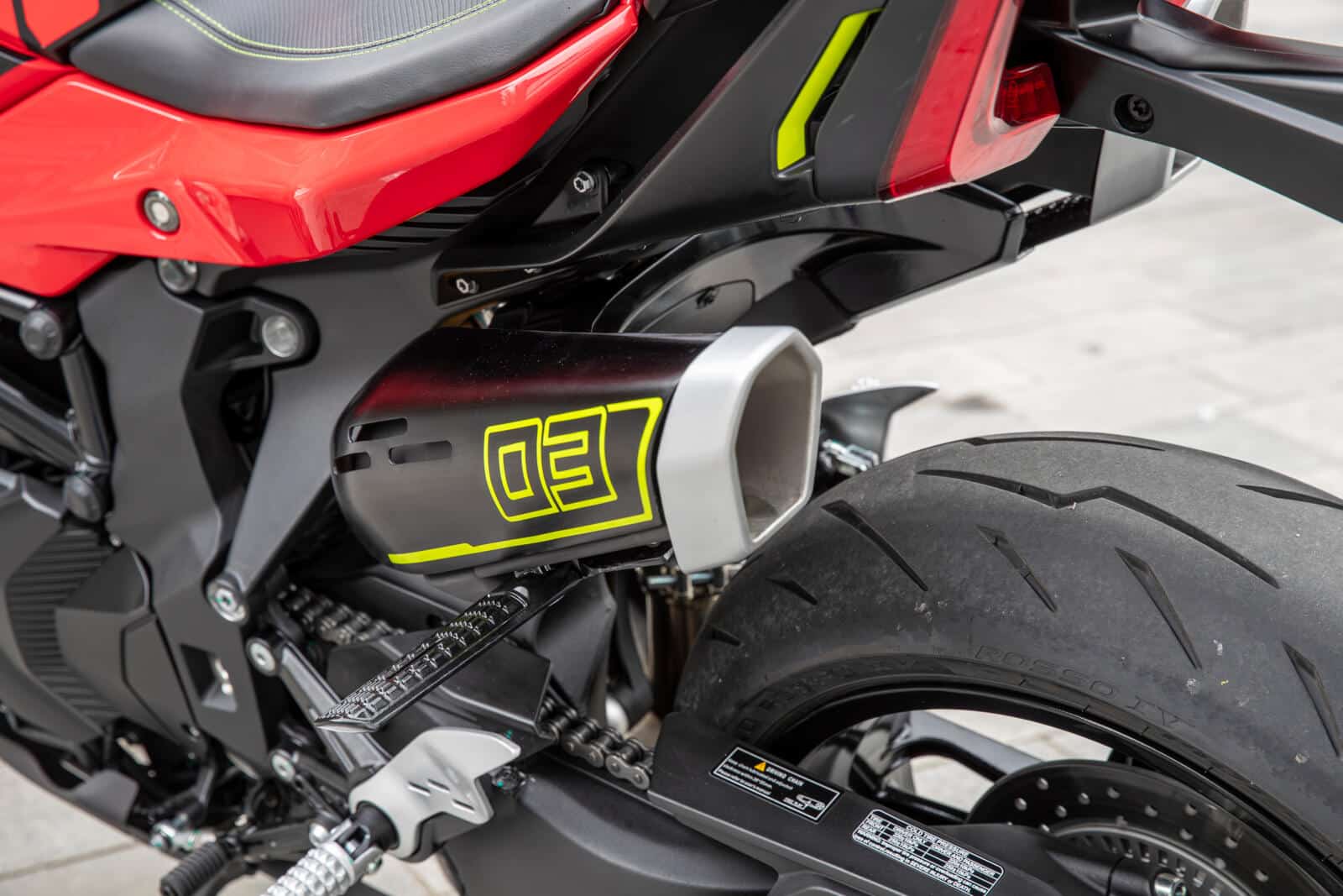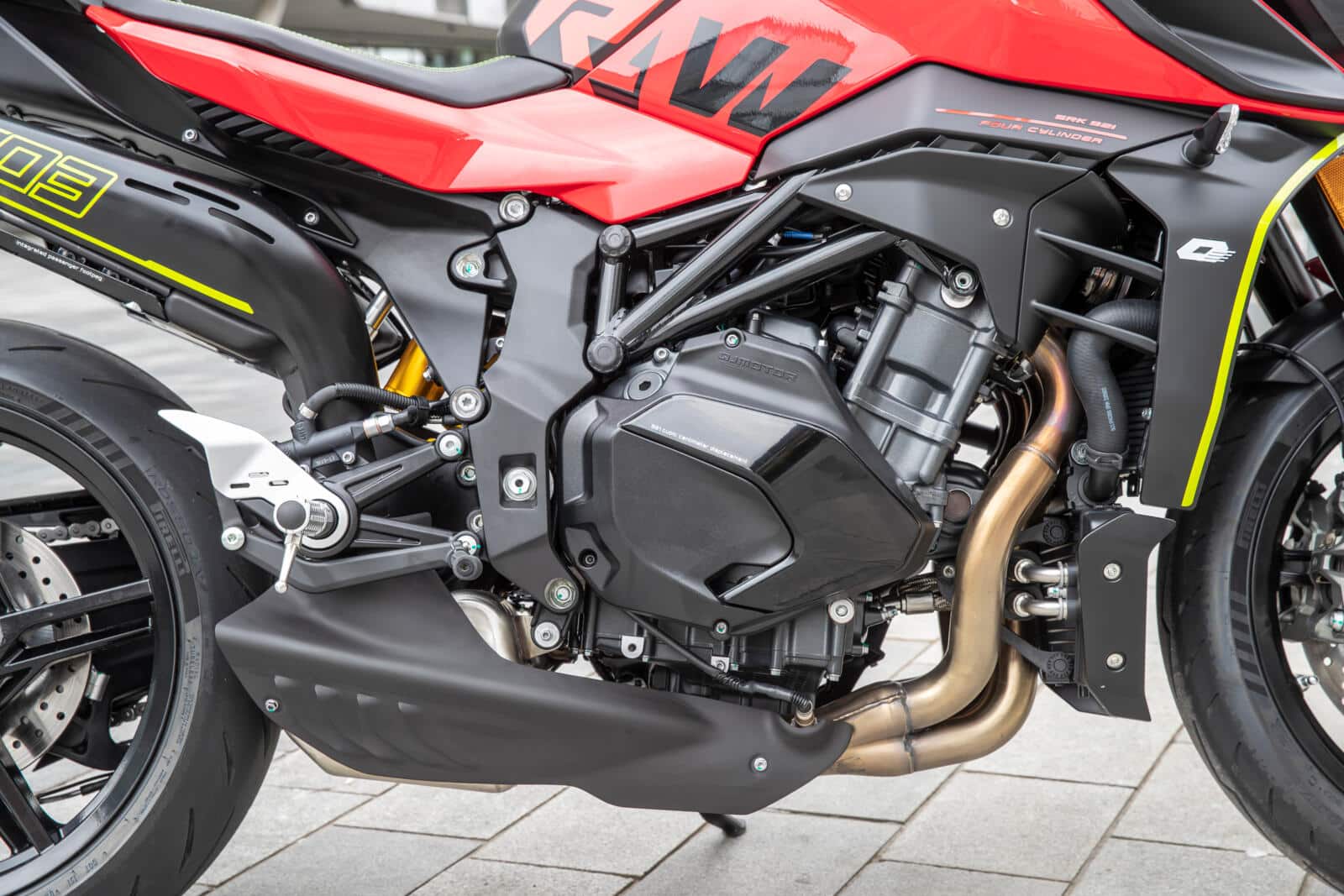 Onder al dat moois huist misschien wel de grootste troef van deze patser: een 921 cc vier-in-lijn met een 73 x 55 mm boring en slag, goed voor 128 pk bij 10.000 tpm en 93 Nm bij 8.000 tpm. Een por op de startknop ontlokt een rauw gegorgel uit de dubbele uitlaatpotten, dat meteen duidelijk maakt dat ook dit krachthonk geen vreemde eend in de bijt is.