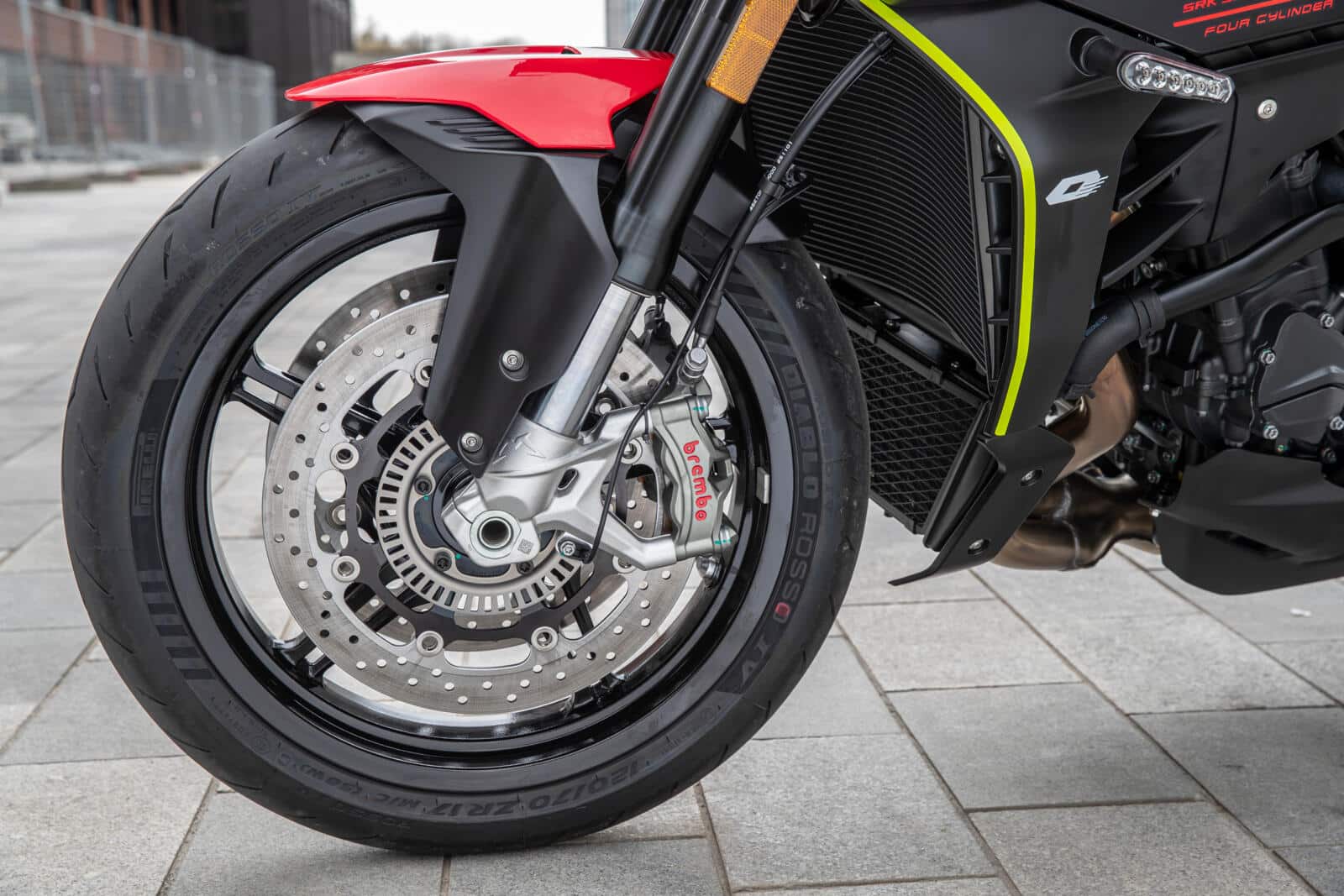 Ook de remmen presteren naar wens: vooraan bijten de Brembo Stylema’s uitstekend. De aanvankelijke bite is beheerst en met één of twee vingers prima doseerbaar, maar wie harder knijpt voelt dat de ankers (gelukkig) ook loeihard kunnen doorhappen. Precies zoals het hoort en op geen moment een reden tot klagen. De Pirelli Diablo Rosso IV’s warmen ook bij bescheiden temperaturen – 10 graden Celsius – snel op, bieden de hele dag door prima grip en geven een vertrouwenwekkende feedback bij steeds gewaagdere hellingshoeken. Alweer geen reden tot klagen. Achteraan biedt de enkele 260 mm-schijf een stuk minder feedback en doortastendheid dan we hadden gehoopt. Zeker als je de achterrem graag gebruikt als correctiemiddel bij het insturen, heb je een zware voet nodig om de SRK 921 achteraan te muilkorven. Zowaar een werkpunt.