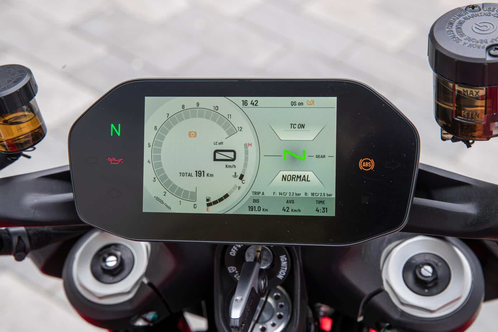QJMotor heeft de SRK 921 niet kaal in de showroom gezet. Eerder vrij – eh – harig. Tractiecontrole, launchcontrol, cornering-ABS met dank aan de zesassige Bosch IMU, cruisecontrol, een bidirectionele quickshifter en drie rijmodi – Sport, Standard en Rain – staan allemaal standaard op de uitrustingslijst. Het 5-inch TFT-scherm met Bluetooth-connectiviteit verklapt je bovendien of je banden op druk blijven (TPMS), maakt navigatie mogelijk via mirroring en toont alle rijgegevens overzichtelijk voor je neus. Dat is een indrukwekkend pakket voor dit prijskaartje – en in de praktijk werken die systemen ook naar behoren. De cornering-ABS en tractiecontrole grijpen subtiel en gepast in, de cruisecontrol houdt z’n snelheid prima vast – afgezien van de hierboven omschreven elasticiteit.