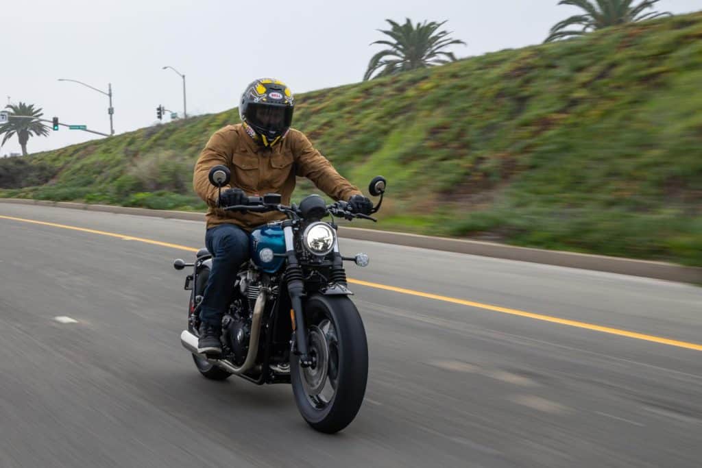 De eenvoud van het design komt terug in de eenvoud van het rijden. Alles gaat soepel en makkelijk, van de motorloop tot het remmen en de vering. Je merkt wel duidelijk meer pit in de paralleltwin ten opzichte van de Bonneville T100, die we eerder reden. 300 cc, 15 pk en 25 Nm extra is ook niet niks, waarmee de T120 uitkomt op 1200 cc, 80 pk en 105 Nm. Zeker geen waarden waar je van achterovervalt, maar die wel voor voldoende plezier zullen zorgen. In de Californische bergen voelt de T120 zich prima thuis. Er zit voldoende gang in om het spannend te houden, terwijl de Brembo-voorrem en KYB-vering voor controle zorgen. Het resultaat is een fijn evenwicht tussen ouderwets, analoog motorrijden en moderne prestaties. Je kunt lekker vlot rijden met de T120, zonder te pushen. Doe je dat wel, rij je al snel tegen de limieten aan qua vermogen en hellingshoek. Het leuke is: de motor daagt je daar nooit voor uit.