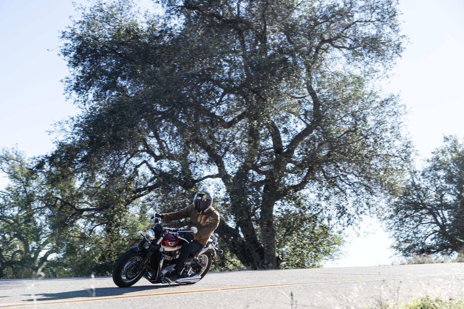 De eenvoud van het design komt terug in de eenvoud van het rijden. Alles gaat soepel en makkelijk, van de motorloop tot het remmen en de vering. Je merkt wel duidelijk meer pit in de paralleltwin ten opzichte van de Bonneville T100, die we eerder reden. 300 cc, 15 pk en 25 Nm extra is ook niet niks, waarmee de T120 uitkomt op 1200 cc, 80 pk en 105 Nm. Zeker geen waarden waar je van achterovervalt, maar die wel voor voldoende plezier zullen zorgen. In de Californische bergen voelt de T120 zich prima thuis. Er zit voldoende gang in om het spannend te houden, terwijl de Brembo-voorrem en KYB-vering voor controle zorgen. Het resultaat is een fijn evenwicht tussen ouderwets, analoog motorrijden en moderne prestaties. Je kunt lekker vlot rijden met de T120, zonder te pushen. Doe je dat wel, rij je al snel tegen de limieten aan qua vermogen en hellingshoek. Het leuke is: de motor daagt je daar nooit voor uit.