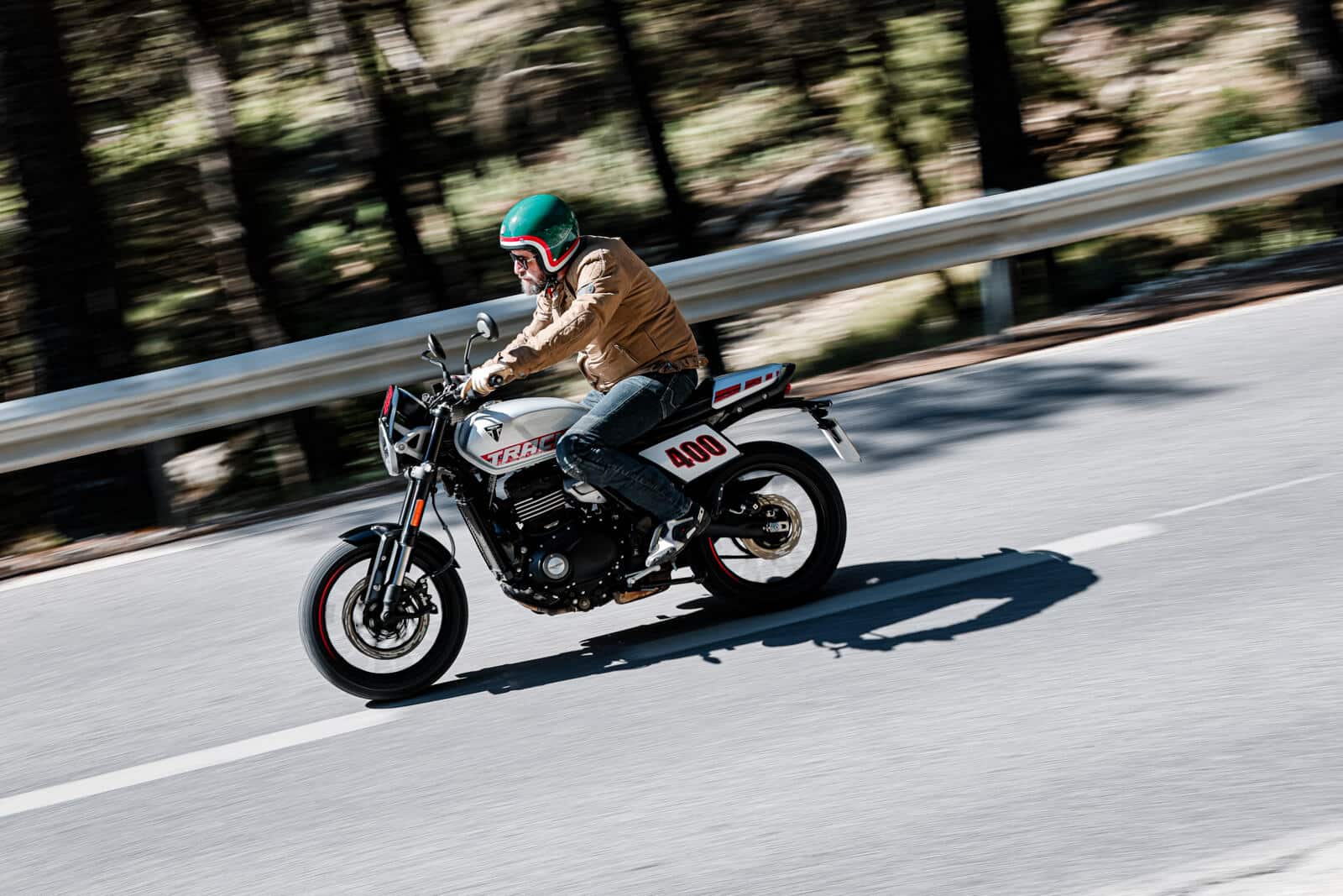 Dat de naam ‘Tracker’ van flattrack komt, iets waar Triumph in de jaren ‘60 niet zonder succes bleek met klinkende namen als Gene Romero, toont de Tracker 400 wanneer we een stuk spekglad asfalt voor de wielen krijgen. De achterkant breekt spontaan twee keer uit, maar het rijwielgedeelte, het ABS en een beetje flattrack-ervaring redt mijn ego. Zulke ongein smeedt meteen een band met een motorfiets, zeg maar.