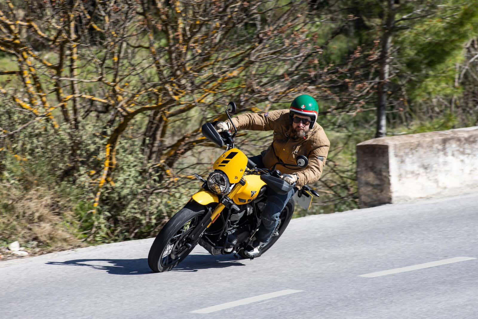 Op de Spaanse slingerwegen houden we vlotjes een behoorlijk illegale 110 à 120 km/u aan, zonder dat de éénpitter er moeite mee lijkt te hebben. In wezen kan het blok zeker de maximale 48 pk aan die de A2-regelgeving toelaat, maar Triumph heeft bewust voor een meer koppelrijk aanvoelend blok gekozen. En dat lijkt me de beste keuze. Bij dat soort snelheden voel je dat de vering het stilaan welletjes gaan vinden, maar ze houden het kranig vol. Het maakt dat ik andermaal het gevoel krijg met een erg volwassen motor te rijden.
