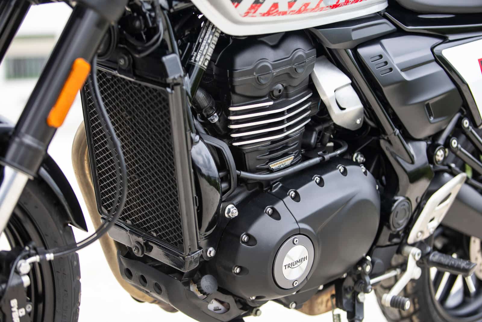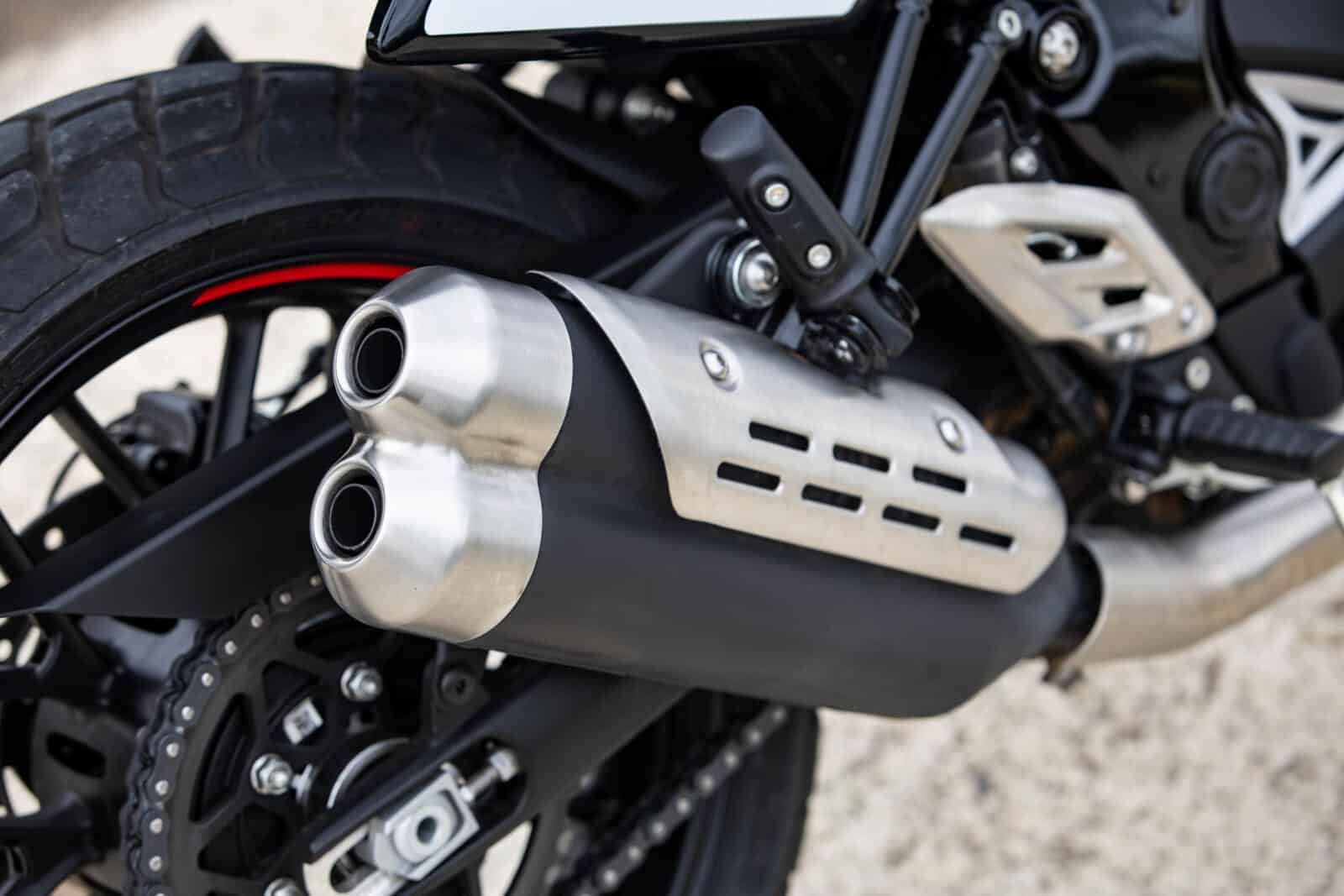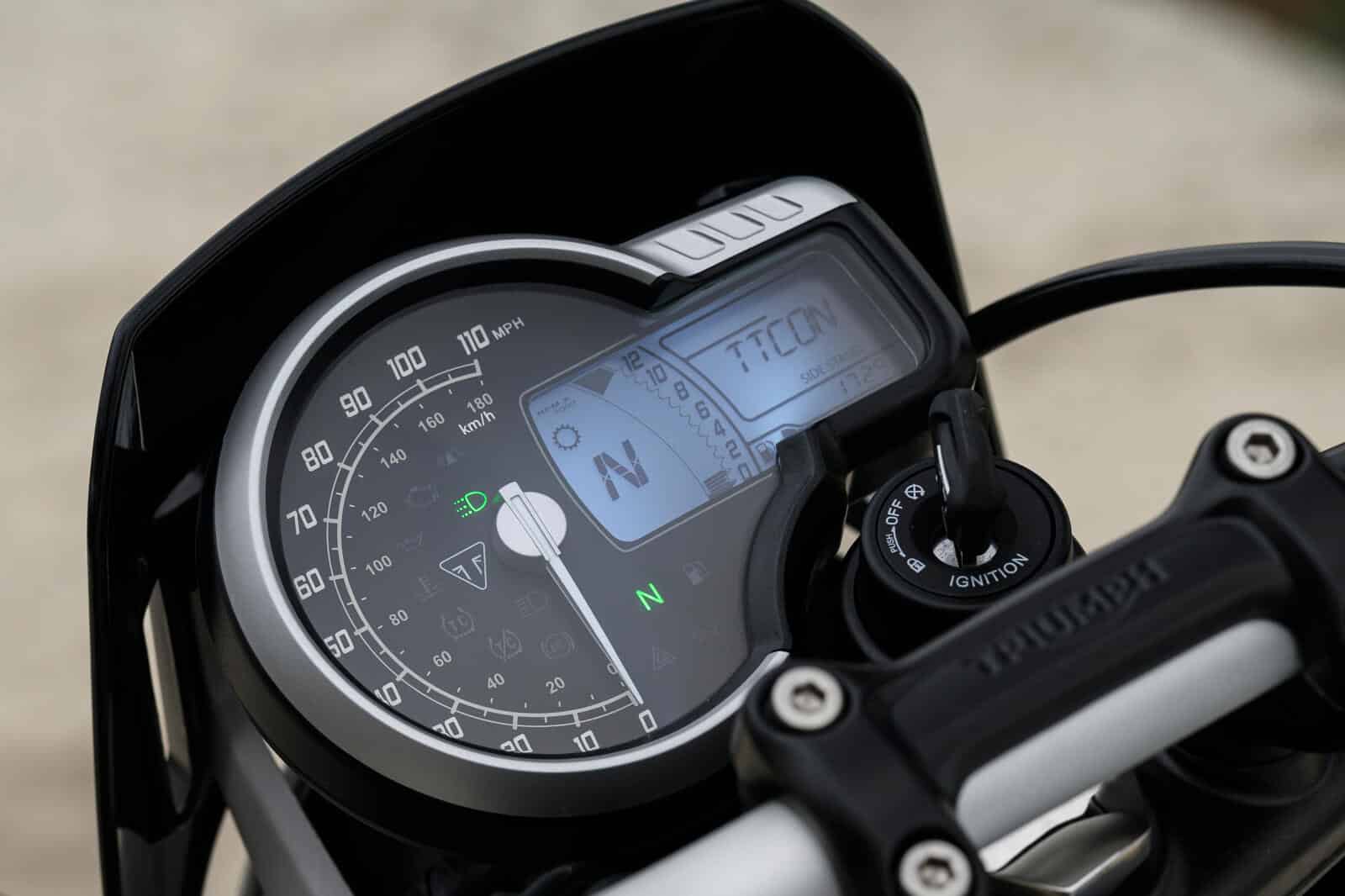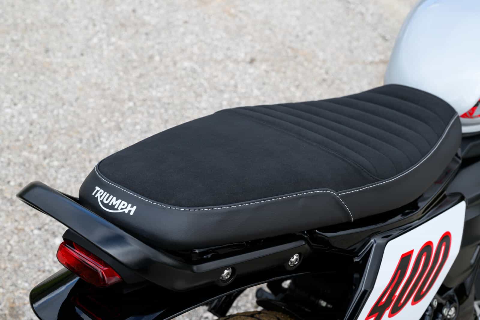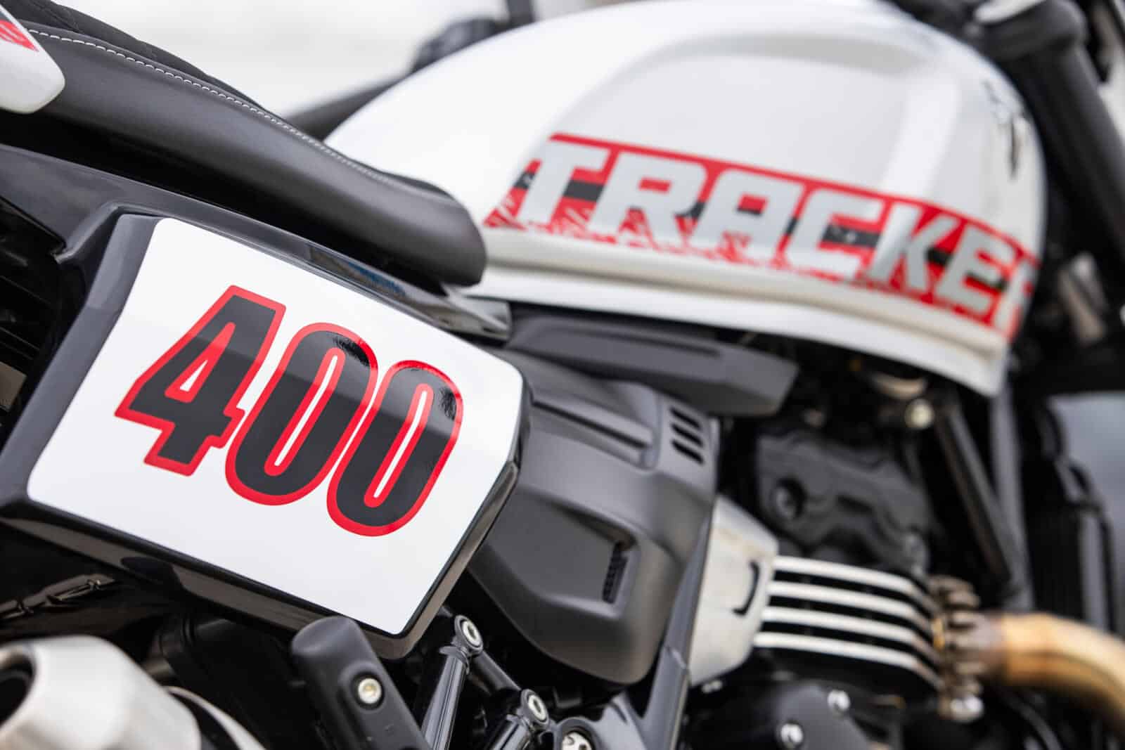De cilinderinhoud en boring en slag (89 x 64 mm) blijven ongewijzigd, maar een nieuwe nokkenas en aangepaste timing krikken het piekvermogen van de Tracker op tot 41,4 pk bij 9.000 tpm, met hetzelfde koppel van 37,5 Nm bij 7.500 tpm. Beide vermogenscijfers liggen duizend toeren hoger dan bij de Speed en Scrambler 400, wat meteen een sportievere inborst verraadt, zeker in combinatie met een zesbak. De Tracker krijgt met 1.371 mm de kortste wielbasis van alle Triumph 400’s en wordt afgerond met Pirelli MT60 RS-banden. Een ByBre-vierzuigerremklauw bijt in een 300mm-schijf en zit gemonteerd op een volwassen 43 mm usd-voorvork. En daarnaast heb je ook ride-by-wire, uitschakelbare tractiecontrole en tweekanaals ABS.