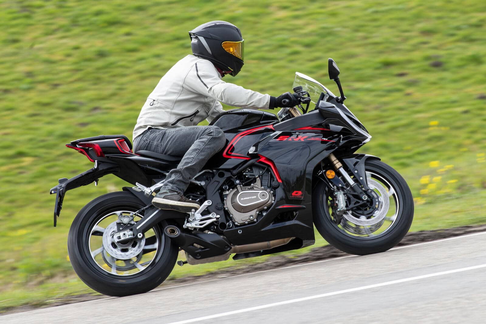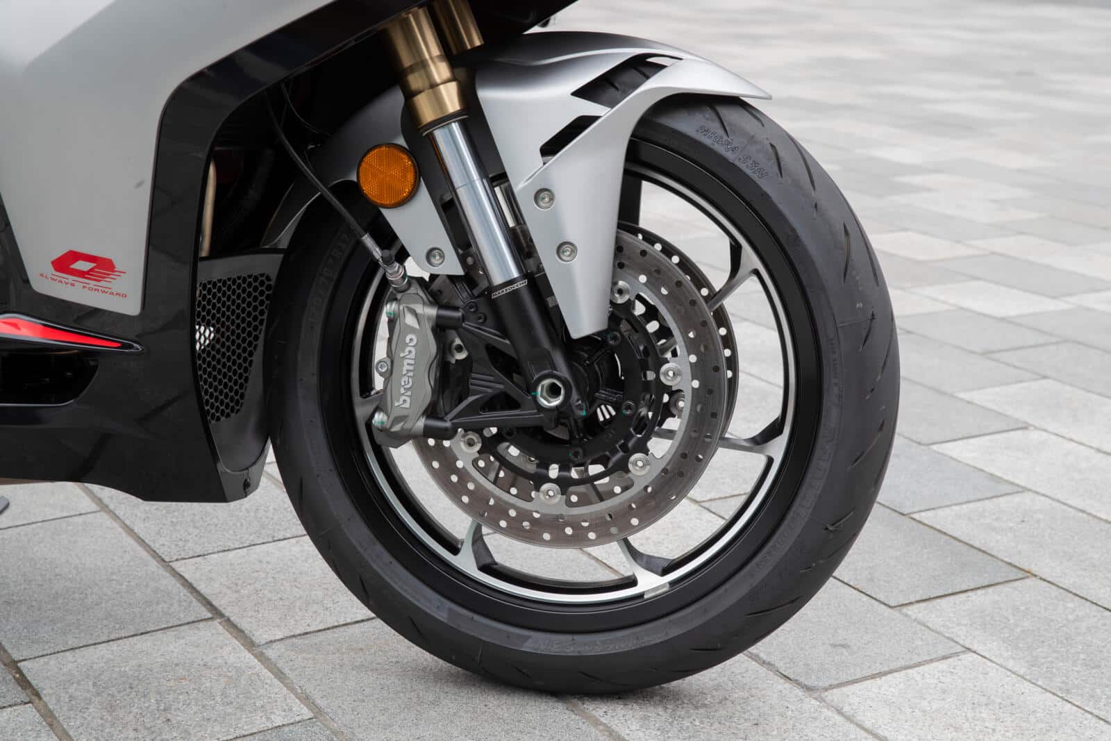 De SRK 421 RR staat op CST-rubber, met een 160/60-ZR17-achterband die mooi past bij het lichte, vinnige karakter van de motor. Op de droge wegen die we vandaag aandoen, bieden de banden voldoende grip en vooral een voorspelbaar gevoel. Waardoor je de QJ met vertrouwen op lijn kunt zetten en vlot van hellingshoek kunt laten wisselen. Ze missen misschien de uitgesproken scherpte en het absolute vertrouwen van premiumsportrubber wanneer het tempo echt fors omhooggaat, maar binnen het normale tot sportieve straatgebruik doen ze netjes wat ze moeten doen: geen drama, geen verrassingen, gewoon degelijk passend bij het totaalpakket.