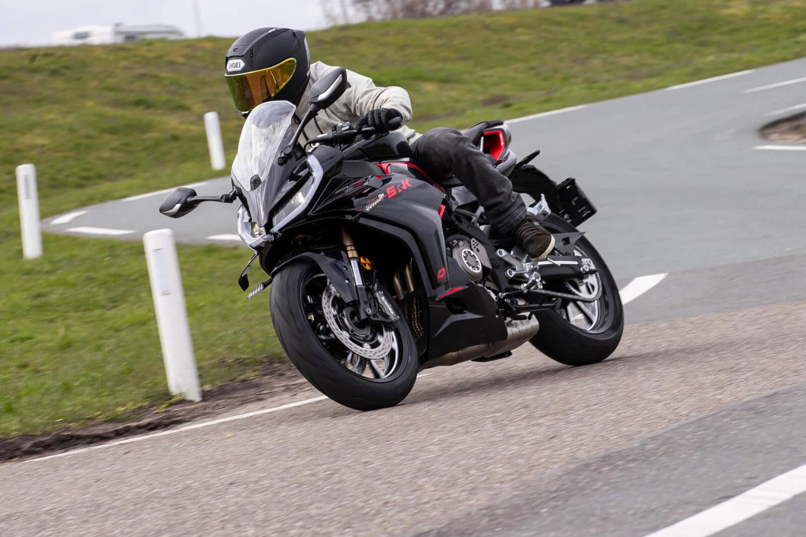 In bochten laat de SRK 421 RR vooral een degelijk en geruststellend stuurgedrag zien. Het rijwielgedeelte voelt mooi in balans aan, waardoor de motor zich vlot van de ene naar de andere hellingshoek laat begeleiden zonder onrustig of nerveus te worden. Ook wanneer het asfalt minder strak is, blijft het geheel behoorlijk homogeen aanvoelen, met voldoende precisie aan de voorkant om vertrouwen te houden. Wanneer het tempo echt omhooggaat, merk je wel dat de 37 mm Marzocchi-voorvork sneller haar limieten bereikt dan je met dit blok zou hopen. Daardoor verliest de SRK 421 RR een stukje scherpte zodra je ’m harder begint aan te vallen, maar in normaal tot vlot straatgebruik blijft het stuurgedrag coherent, voorspelbaar en aangenaam. Kortom: een goed afgesteld pakket dat op straat prima werkt en bij sportievere ambities nog volop stelmogelijkheden in reserve heeft.