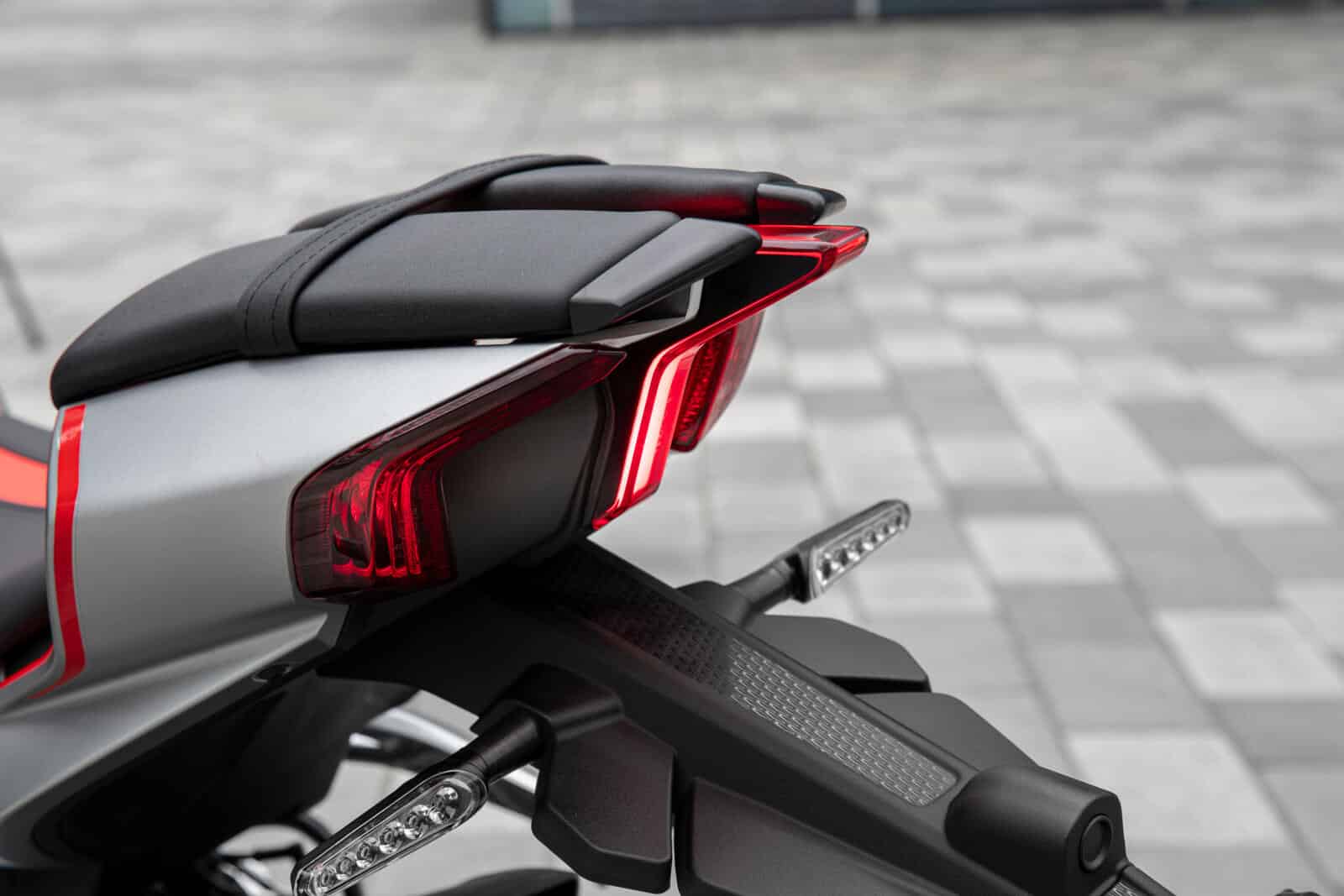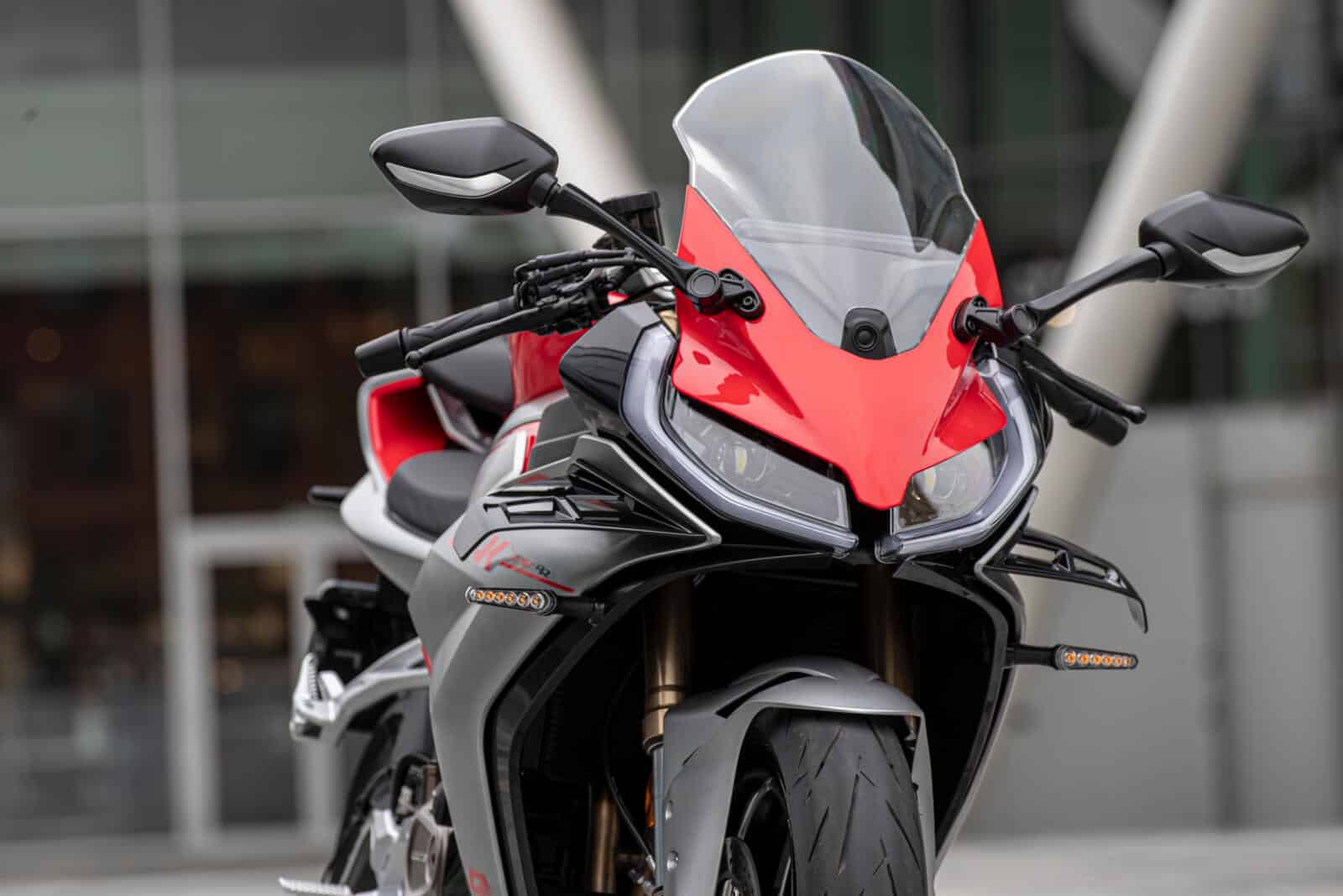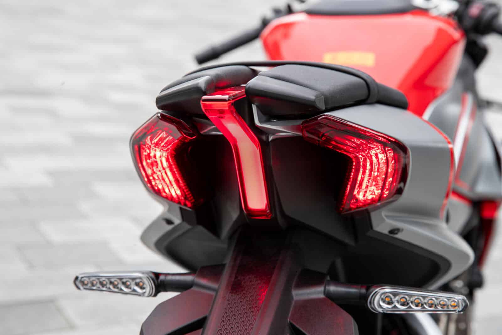 Onder het kuipwerk huist een 421 cc vier-in-lijn met een boring en slag van 57 x 41,2 mm, goed voor 78 pk bij 14.000 tpm en 39 Nm bij 13.000 tpm. Indrukwekkende waarden voor dit formaat – en in de praktijk lost het blok de verwachtingen netjes in. Het kabelbediende gashendel heeft wat vrije slag voor de gaskleppen daadwerkelijk reageren, maar eenmaal dat drempeltje gepasseerd verloopt alles heerlijk soepel. Onderin is de 421 RR niet de meest koppelrijke – dat hoef je van een hoogtoerende viercilinder in dit formaat ook niet te verwachten – maar de opbouw verloopt van onderin netjes en voorspelbaar. Bij 3.000 tpm door het verkeer tuffen? Geen enkel probleem. Vanaf 6.000 tpm begint de machine pas echt z’n ware aard te tonen: de vierpitter sleurt met verve door de toeren richting rode zone, en pas voorbij de 14.000 tpm komt de begrenzer tussenbeide. Een blok dat beloont wie de moeite doet om het hoog in de toeren te houden. En dat doet het met een heerlijke soundtrack. Van het inlaatgesnuif tot de uitlaatnoot klinkt de 421 RR opvallend potent voor z’n formaat. De uitlaatdemper zit netjes onder het blok weggewerkt en oogt bescheiden, maar is een gevalletje ‘wolf in schaapsvacht’. Heerlijk.