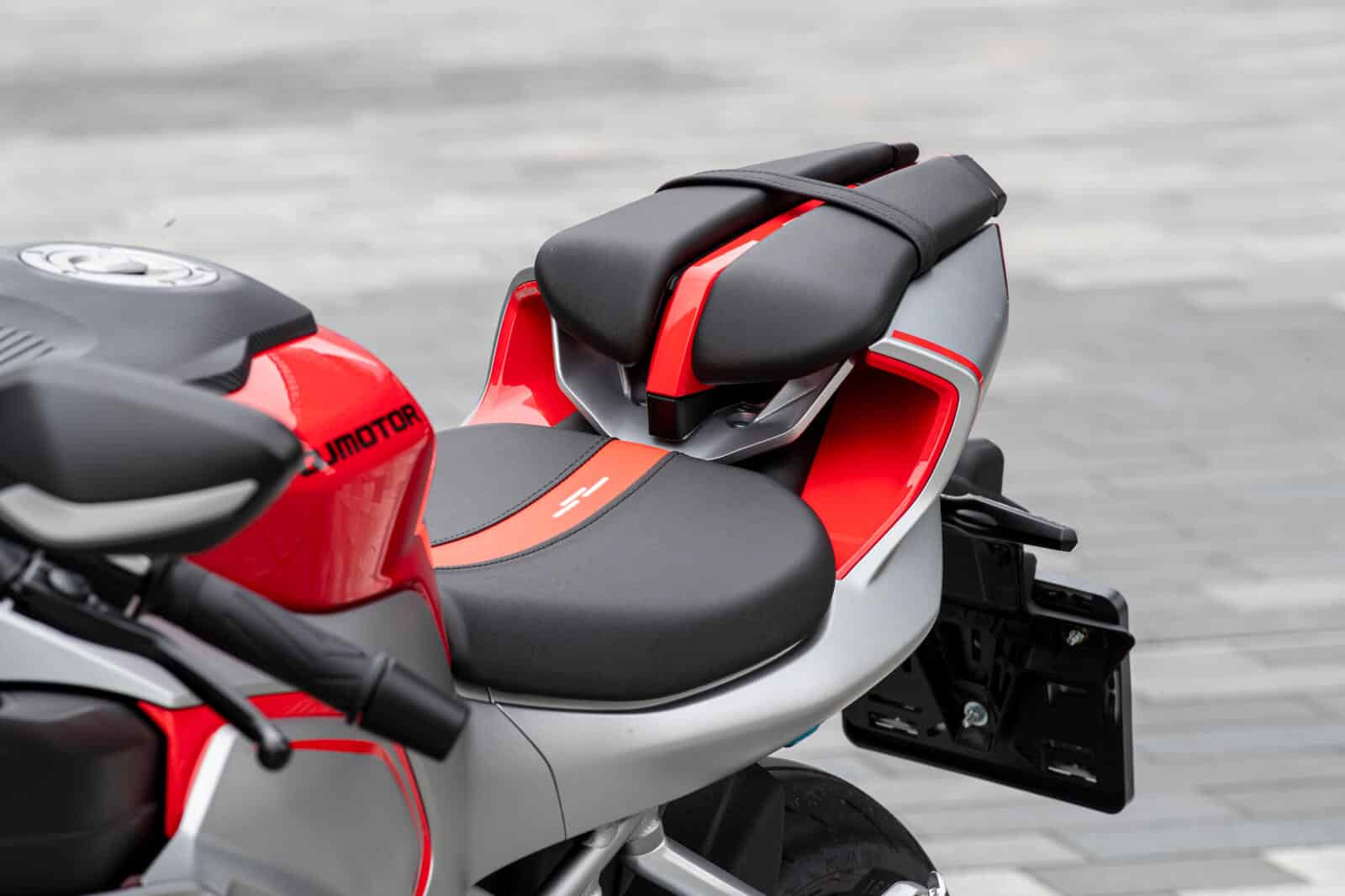 Van afstand is duidelijk dat QJMotor ook hier duchtig over de schutting heeft gekeken in de richting van Varese en Borgo Panigale. De SRK 421 RR is een visueel uitgesproken machine die haar sportieve ambities op geen enkel moment verbergt. Het kuipwerk oogt strak en goed geproportioneerd, de DRL’s zijn netjes geïntegreerd in de neus en de luchthappers onder de duozit geven de staartsectie net dat tikkeltje extra diepte. Leuk detail: het gesplitste duozadel heeft een ingewerkte ledstrip van het achterlicht die optisch doorloopt in het zadel zelf – een knipoog die je pas bij een tweede blik volledig apprecieert. Het opgeschuurde aluminium op motorblok, swingarm en spaakwiel geeft de 421 RR een premiumuitstraling die haar prijskaartje ver overstijgt.