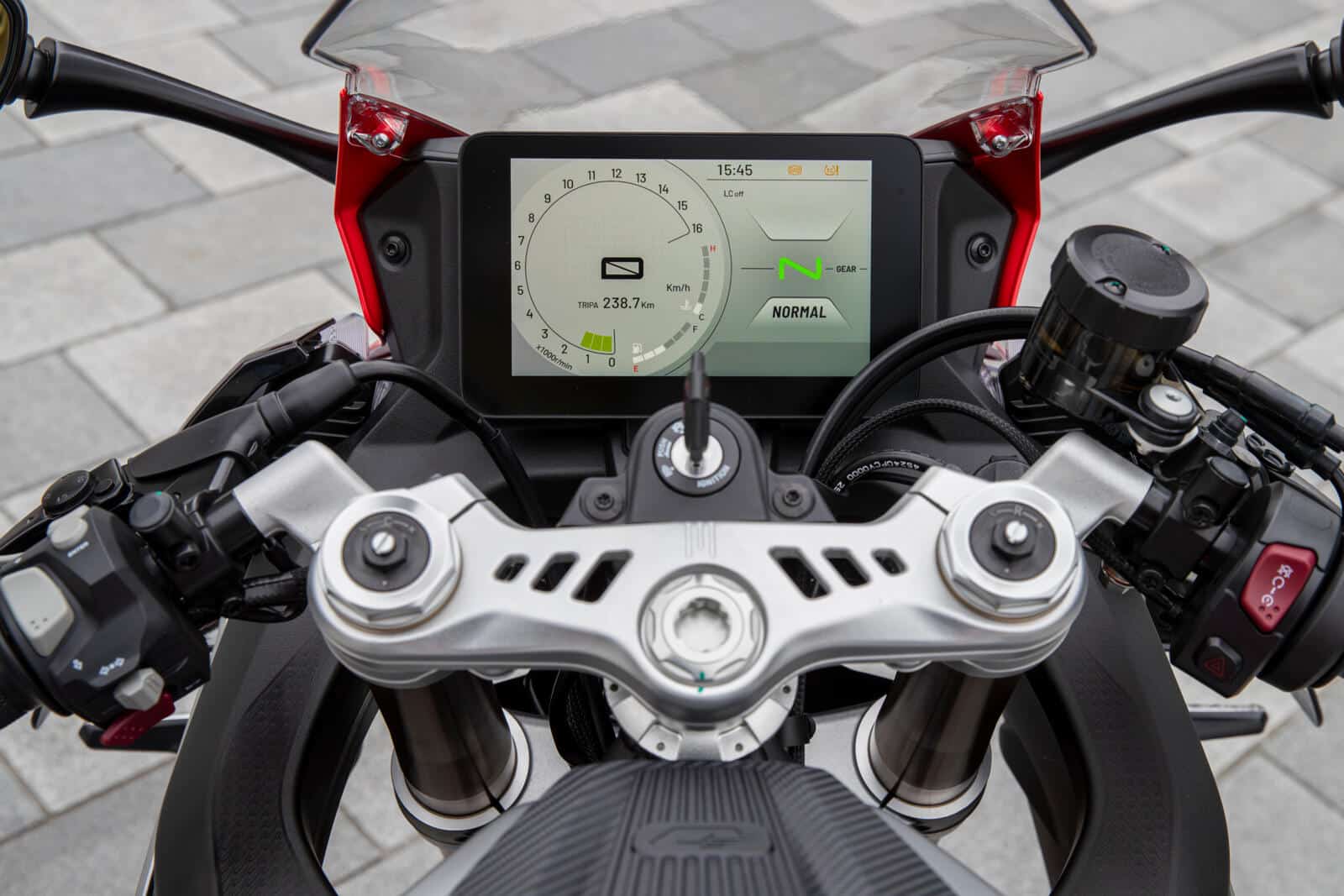 De remmen verdienen een genuanceerd verhaal. Vooraan zijn er twee 300 mm-schijven met radiale Brembo-vierzuigerklauwen, achteraan een 240 mm-schijf met eveneens een Brembo-klauw. De namen kloppen, maar het aanvankelijke gevoel is een andere zaak. Je moet een stuk vrije slag voorbij alvorens de remmen daadwerkelijk beginnen in te grijpen. Dat vereist wat gewenning, zeker als je – zoals wij – net van de SRK 921 overstapt, waarop de Stylema’s meteen met volle overtuiging toehappen. Gelukkig, als je eenmaal die drempel gepasseerd bent, bijten de Brembo’s van de 421 RR wél met verve. Zowel voor- als achteraan is er voldoende remkracht aanwezig, en ook de doseerbaarheid is keurig. Maar de initiële respons vraagt aanpassing.