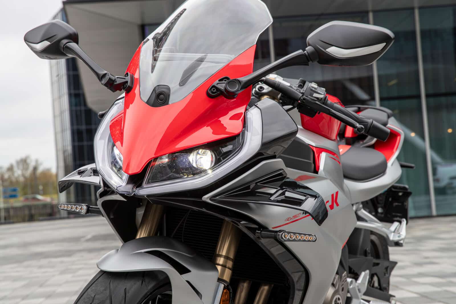 Het ontwerp is geen toeval. De SRK 421 RR is het werk van het Italiaanse bureau C-Creative, geleid door Adrian Morton – voormalig hoofdontwerper bij MV Agusta en Benelli. De ‘mecha’-geïnspireerde stijl met scherpe lijnen, geometrische sneden en robotachtige optica is bewust gekozen als visuele handtekening voor toekomstige QJMotor-modellen. De neus herbergt bovendien een Ram Air-inlaat die tegelijk als sierlijk visueel element fungeert én voor efficiëntere verbranding op hogere snelheden moet zorgen. De winglets op de snuit zijn in deze klasse misschien wat ambitieus als aerodynamisch hulpmiddel, maar als optisch statement werken ze uitstekend.