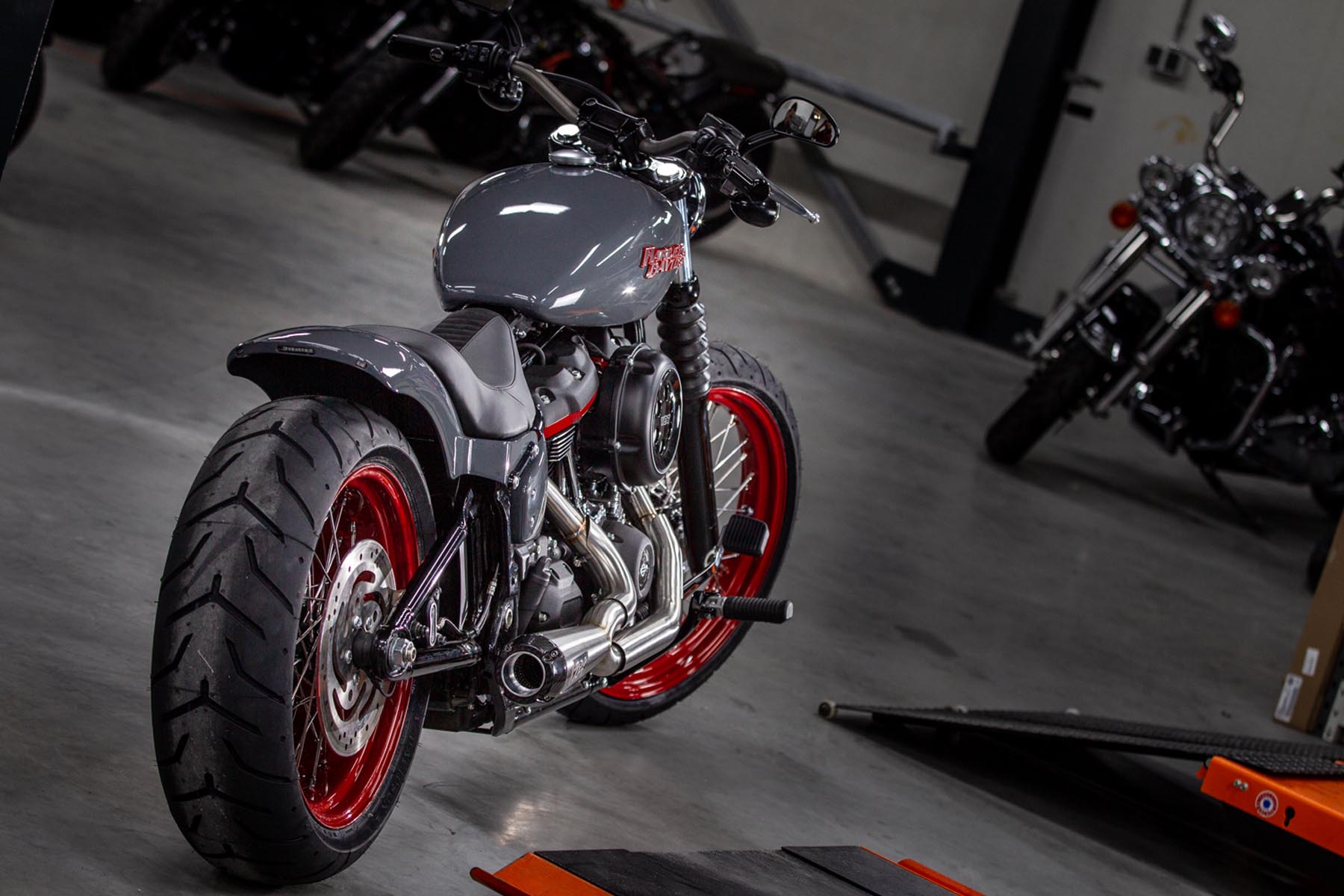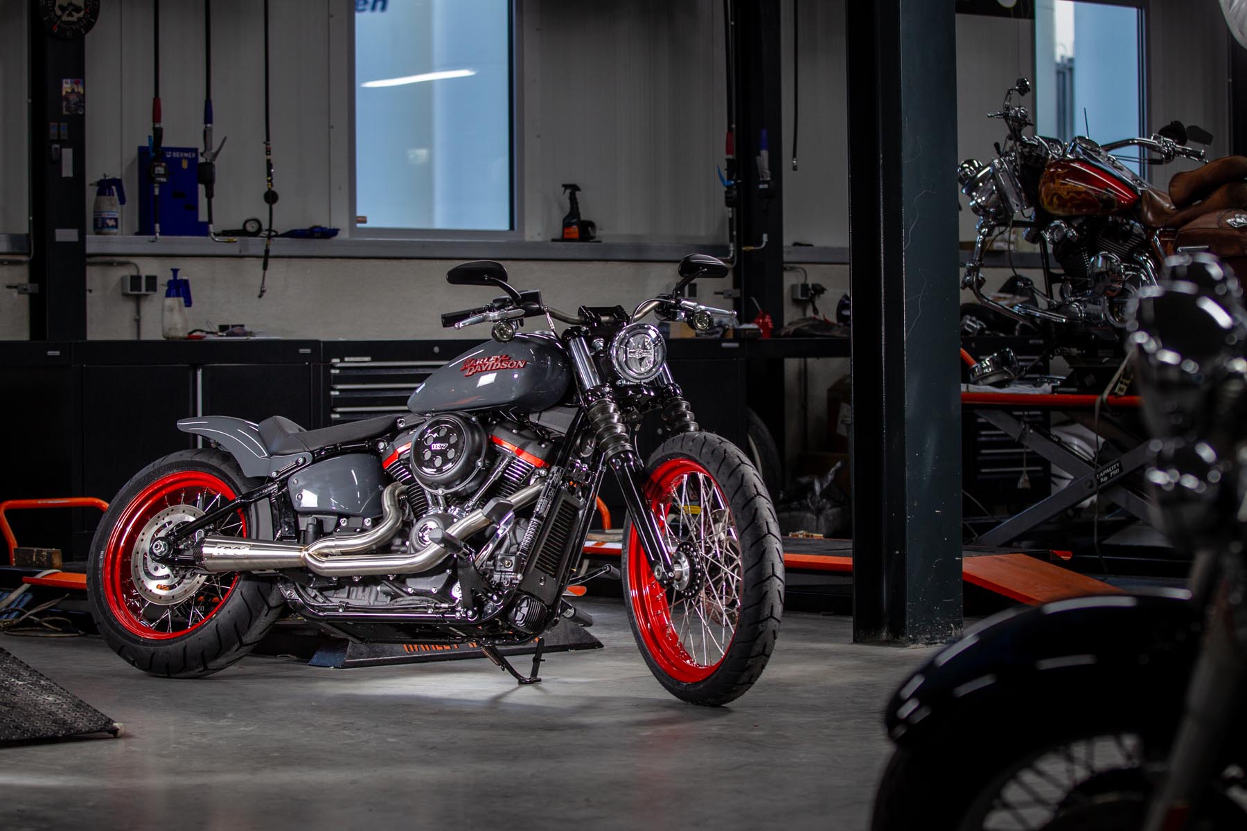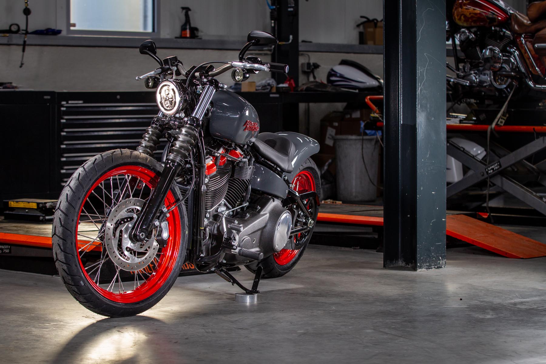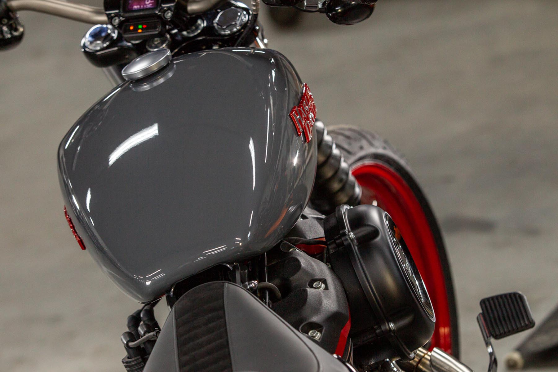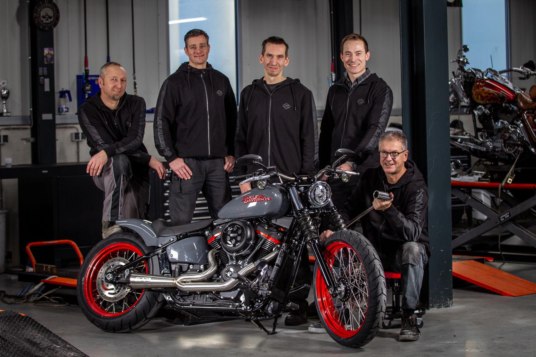 Big Rivers H-D uit Heteren er opnieuw van de partij. Met hun creatie ‘The Gunship’, op basis van een Harley-Davidson Street Bob, verwachten ze hoge ogen te gaan gooien. After Sales Manager Huubke van Boldrik vertelt: ‘De inspiratie voor deze build kwam van de Harley-Davidson CVO-lijn. Deze zeer exclusieve lijn heeft een afwerkingsniveau dat ongeëvenaard is in de motorbranche, met waanzinnige kleurstellingen. Uiteindelijk besloten we de look & feel van de CVO modellijn door te vertalen naar het Softail platform. De kleur van die machine heet Gunship Grey, en zo ontstond de naam – The Gunship – en het bijpassende concept: een agressieve chopper met een indrukwekkende, stoere stance.’ Het team ging aan de slag en voerde nogal wat modificaties door. Zo kreeg de Street Bob een custom achterspatbord, een ander stuur, gewijzigde spaakwielen en een custom zadel. De mid-controls werden naar voren verplaatst en de achterzijde van de machine ging een paar centimeter omlaag. Uit de P&A catalogus kwamen o.a. nieuwe spiegels en handvatten en tenslotte werd er een custom TBR 2-in-1 uitlaatsysteem gemonteerd. Een royale laag hoogglanzende Gunship Grey lak met bordeauxrode accenten en velgen maakte het project compleet. Van Boldrik, met nauwelijks verholen trots: ‘We hebben er keihard aan gewerkt, maar dat zie je er volgens ons ook echt aan af. We zijn als team erg trots op het resultaat. Laat die stemmen maar komen!’