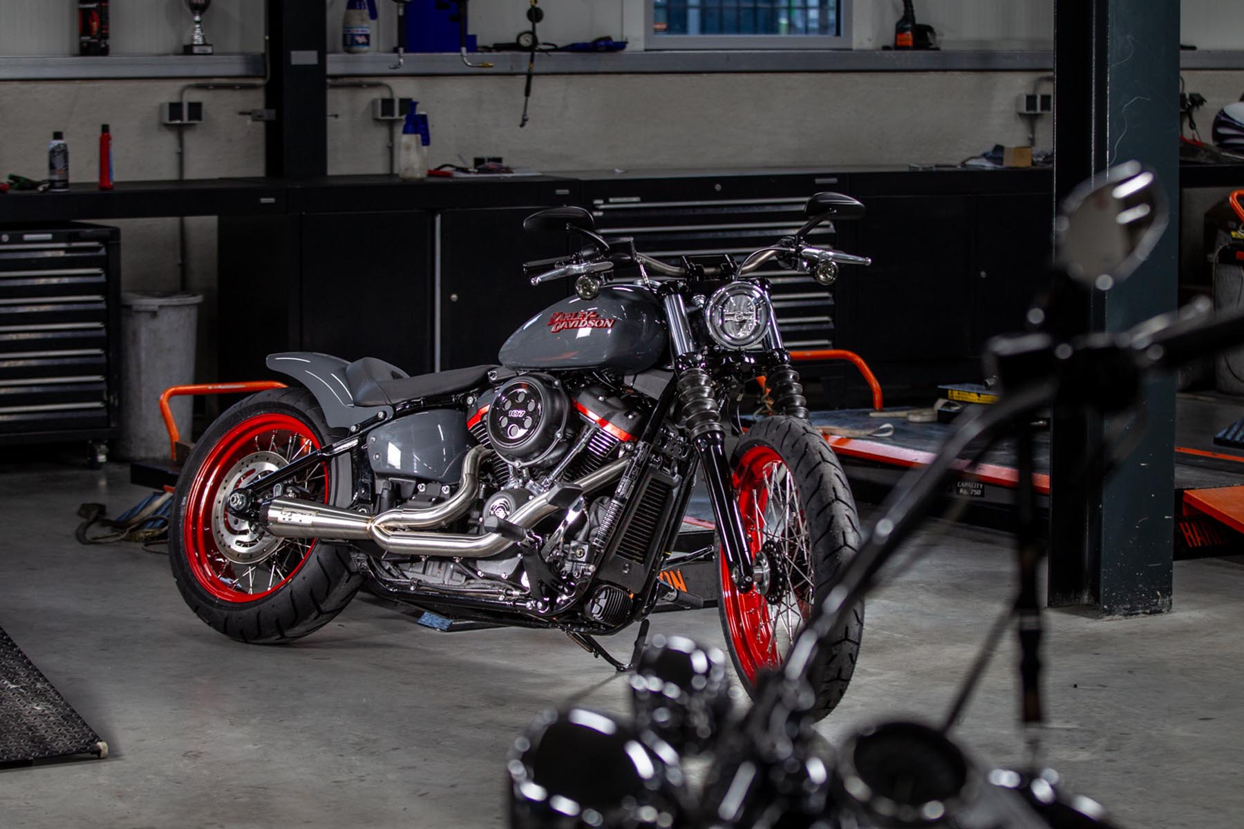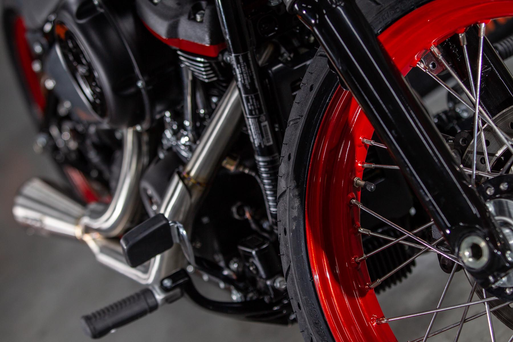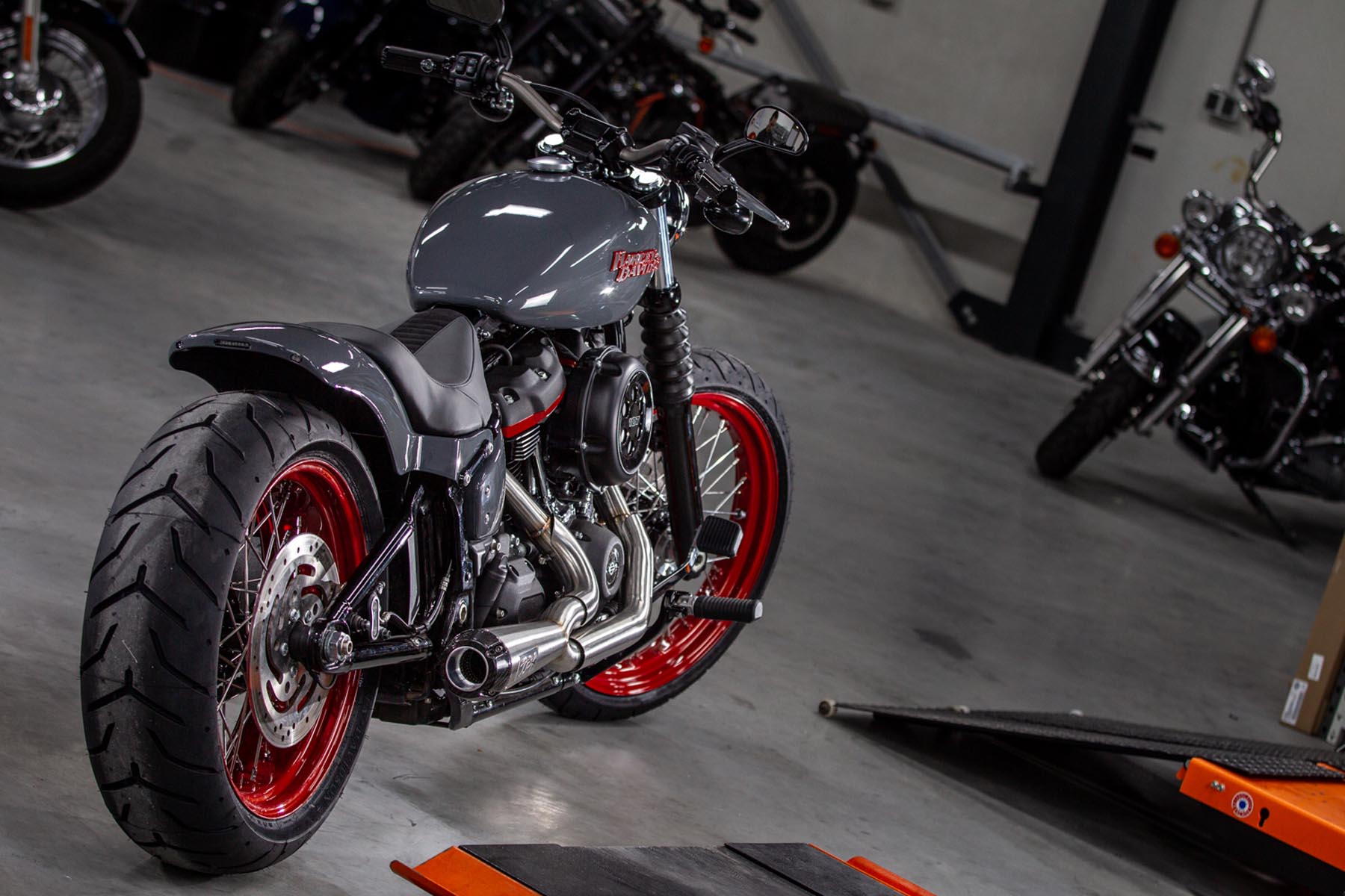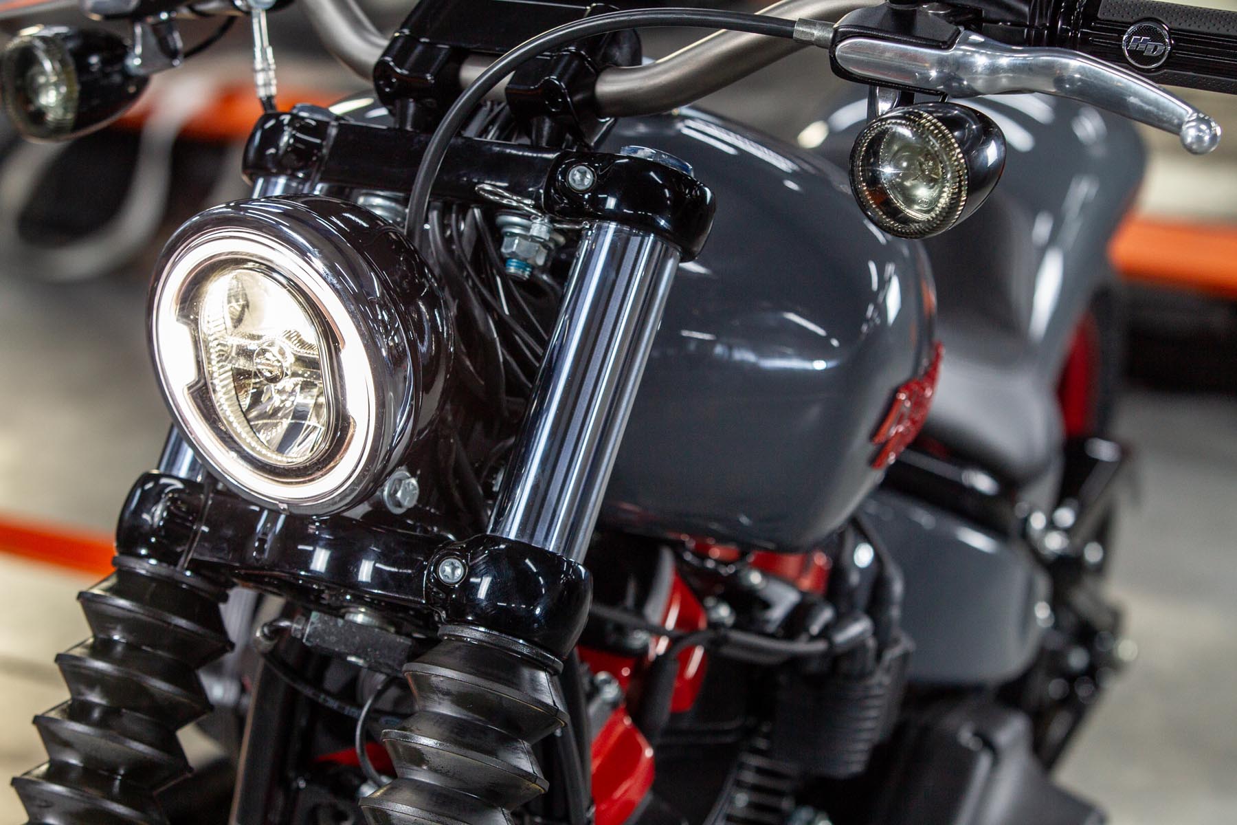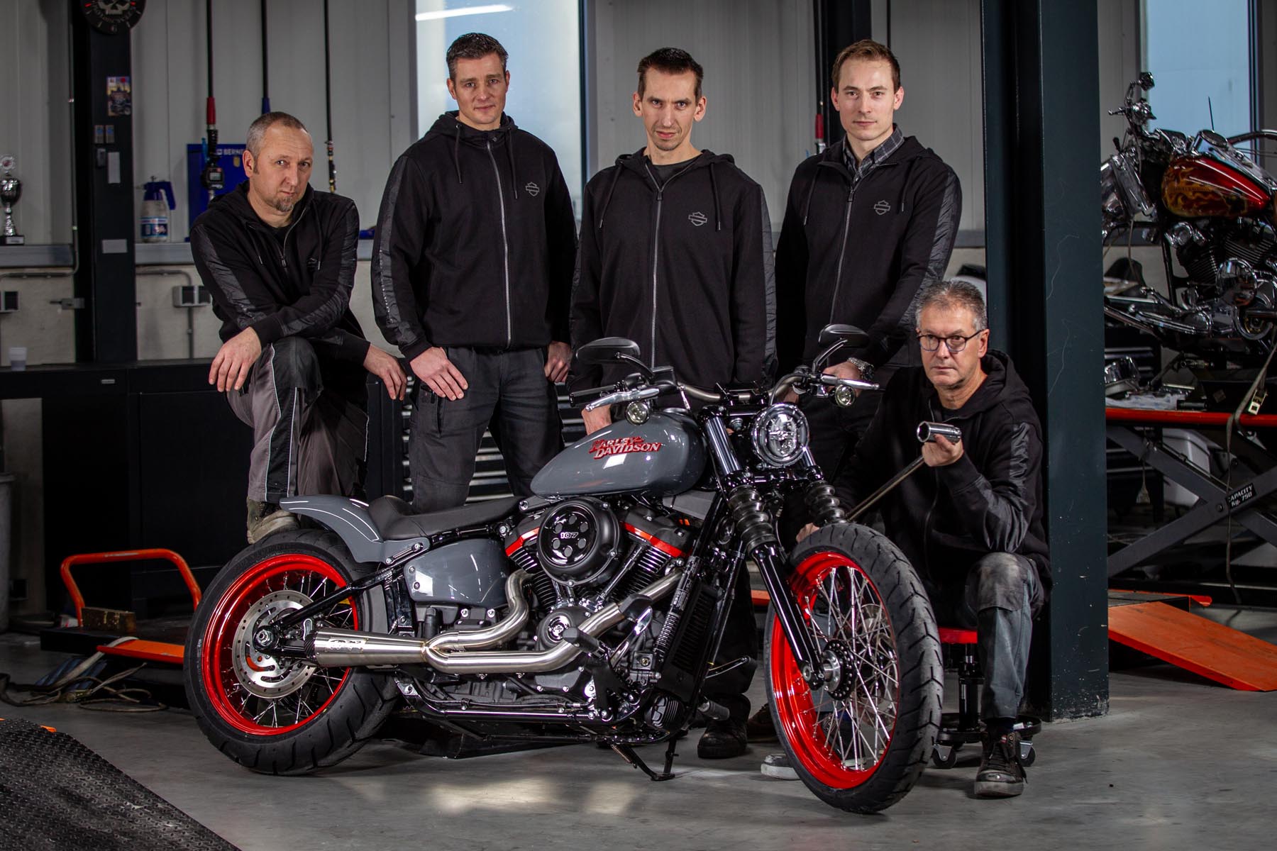 Big Rivers H-D uit Heteren er opnieuw van de partij. Met hun creatie ‘The Gunship’, op basis van een Harley-Davidson Street Bob, verwachten ze hoge ogen te gaan gooien. After Sales Manager Huubke van Boldrik vertelt: ‘De inspiratie voor deze build kwam van de Harley-Davidson CVO-lijn. Deze zeer exclusieve lijn heeft een afwerkingsniveau dat ongeëvenaard is in de motorbranche, met waanzinnige kleurstellingen. Uiteindelijk besloten we de look & feel van de CVO modellijn door te vertalen naar het Softail platform. De kleur van die machine heet Gunship Grey, en zo ontstond de naam – The Gunship – en het bijpassende concept: een agressieve chopper met een indrukwekkende, stoere stance.’ Het team ging aan de slag en voerde nogal wat modificaties door. Zo kreeg de Street Bob een custom achterspatbord, een ander stuur, gewijzigde spaakwielen en een custom zadel. De mid-controls werden naar voren verplaatst en de achterzijde van de machine ging een paar centimeter omlaag. Uit de P&A catalogus kwamen o.a. nieuwe spiegels en handvatten en tenslotte werd er een custom TBR 2-in-1 uitlaatsysteem gemonteerd. Een royale laag hoogglanzende Gunship Grey lak met bordeauxrode accenten en velgen maakte het project compleet. Van Boldrik, met nauwelijks verholen trots: ‘We hebben er keihard aan gewerkt, maar dat zie je er volgens ons ook echt aan af. We zijn als team erg trots op het resultaat. Laat die stemmen maar komen!’