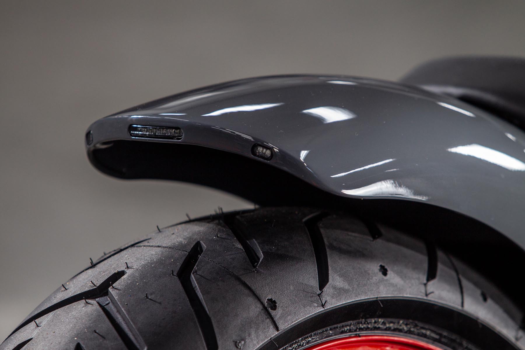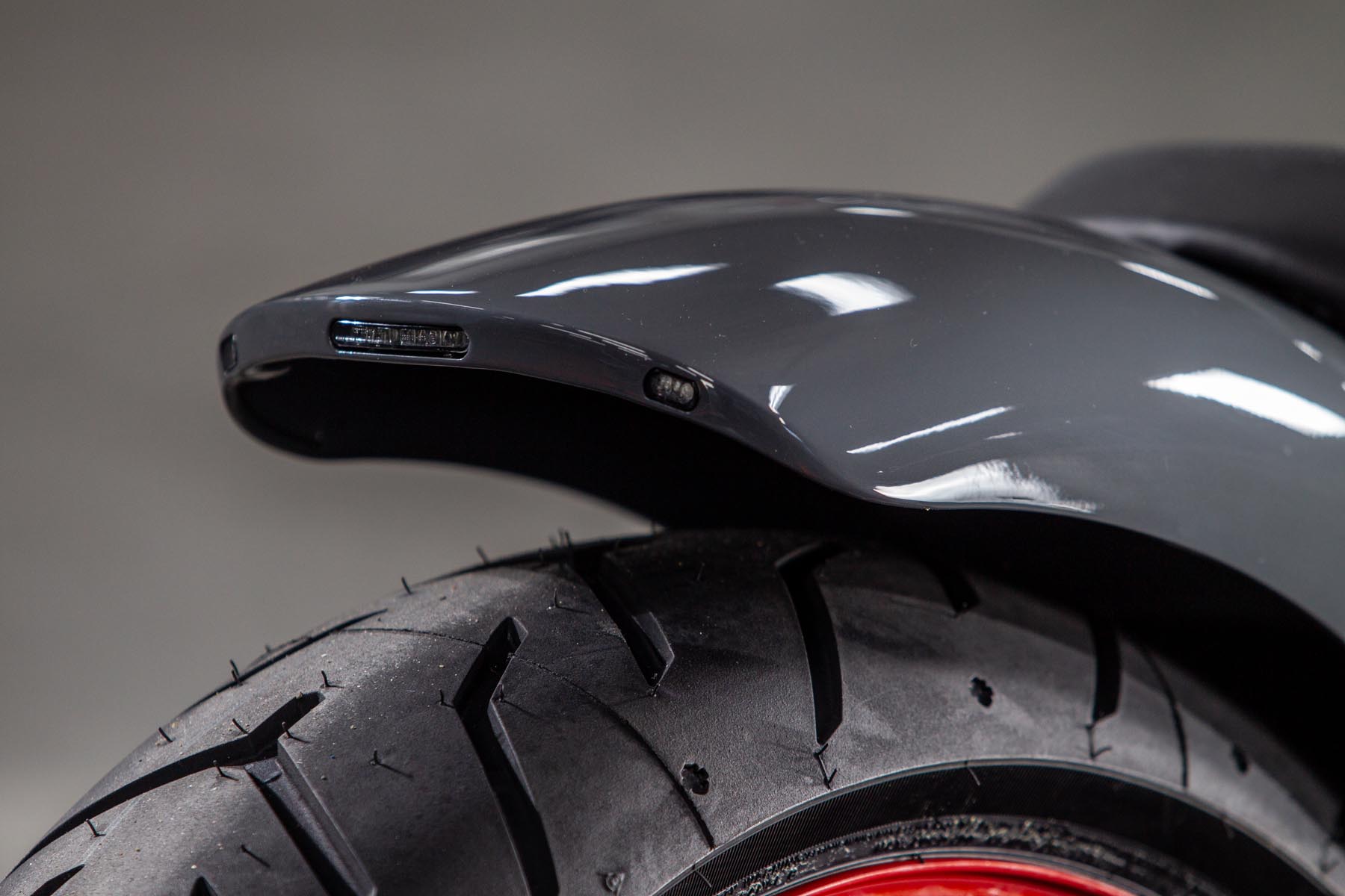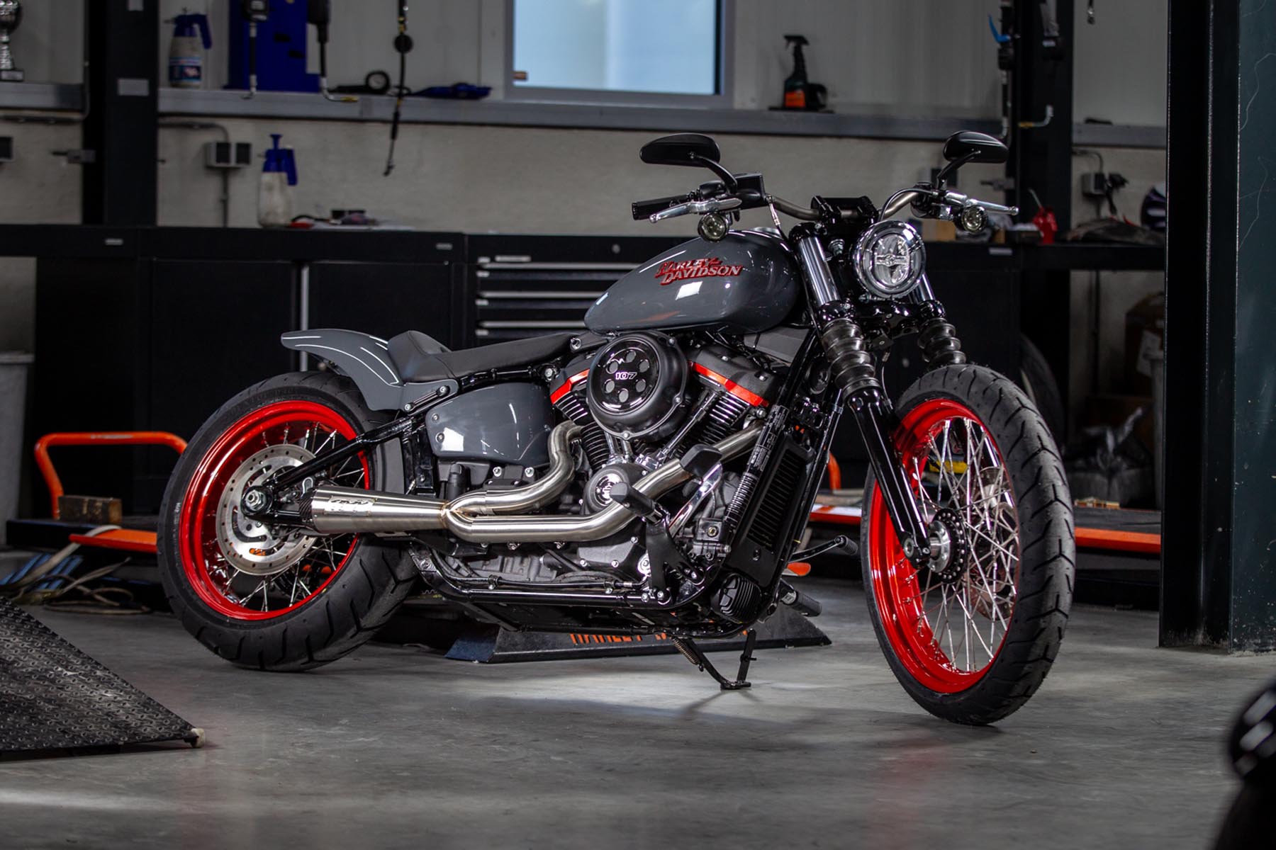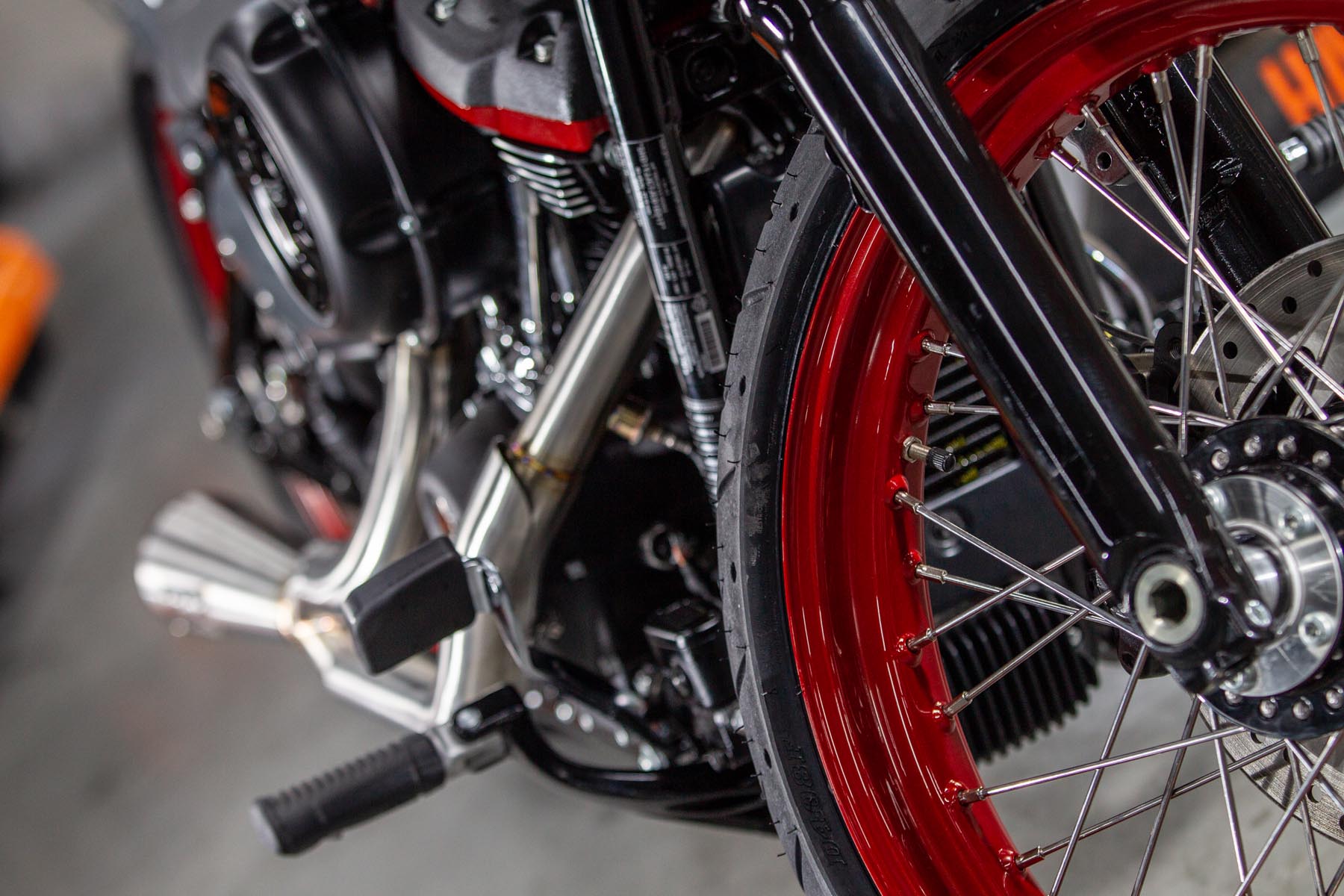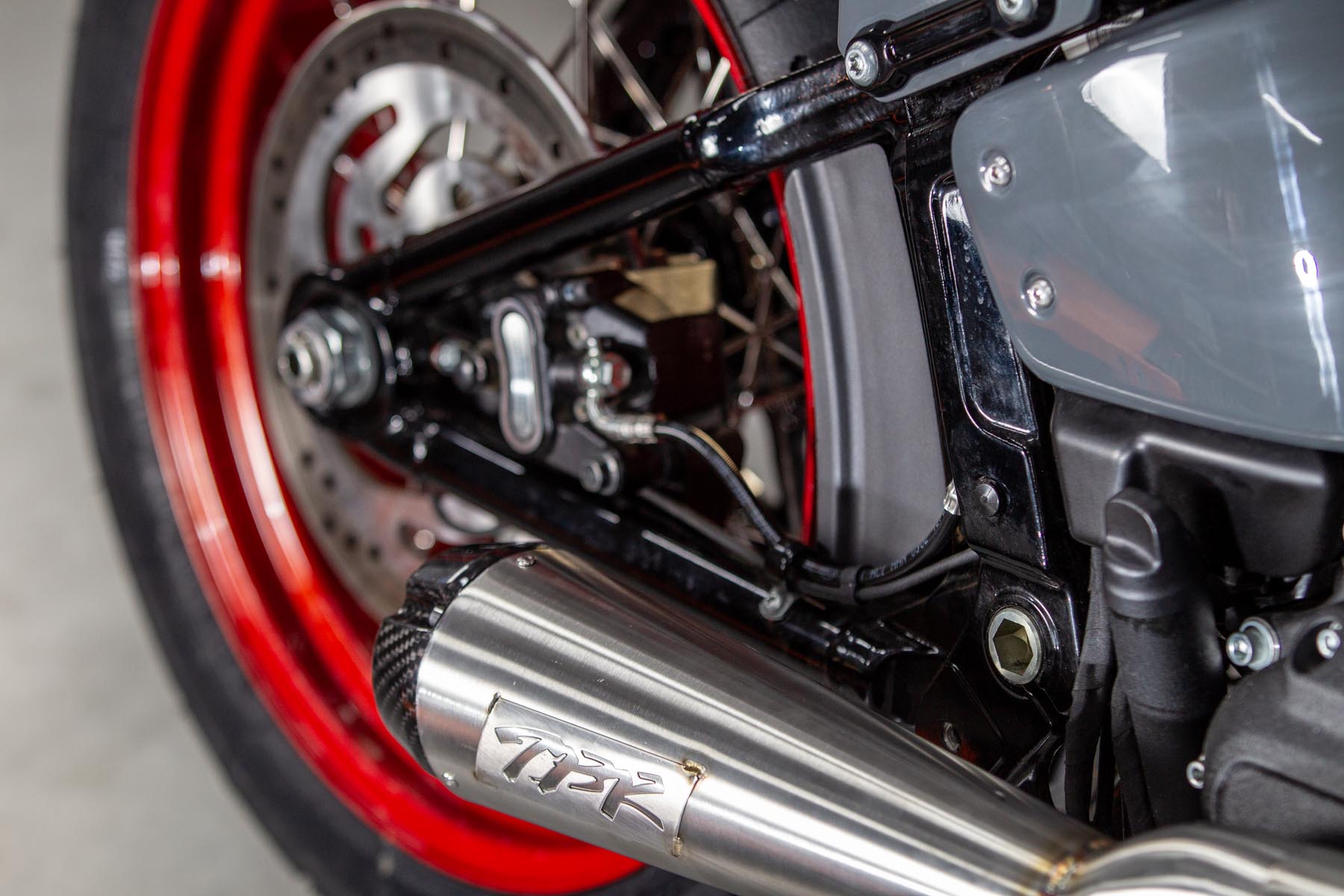 Big Rivers H-D uit Heteren er opnieuw van de partij. Met hun creatie ‘The Gunship’, op basis van een Harley-Davidson Street Bob, verwachten ze hoge ogen te gaan gooien. After Sales Manager Huubke van Boldrik vertelt: ‘De inspiratie voor deze build kwam van de Harley-Davidson CVO-lijn. Deze zeer exclusieve lijn heeft een afwerkingsniveau dat ongeëvenaard is in de motorbranche, met waanzinnige kleurstellingen. Uiteindelijk besloten we de look & feel van de CVO modellijn door te vertalen naar het Softail platform. De kleur van die machine heet Gunship Grey, en zo ontstond de naam – The Gunship – en het bijpassende concept: een agressieve chopper met een indrukwekkende, stoere stance.’ Het team ging aan de slag en voerde nogal wat modificaties door. Zo kreeg de Street Bob een custom achterspatbord, een ander stuur, gewijzigde spaakwielen en een custom zadel. De mid-controls werden naar voren verplaatst en de achterzijde van de machine ging een paar centimeter omlaag. Uit de P&A catalogus kwamen o.a. nieuwe spiegels en handvatten en tenslotte werd er een custom TBR 2-in-1 uitlaatsysteem gemonteerd. Een royale laag hoogglanzende Gunship Grey lak met bordeauxrode accenten en velgen maakte het project compleet. Van Boldrik, met nauwelijks verholen trots: ‘We hebben er keihard aan gewerkt, maar dat zie je er volgens ons ook echt aan af. We zijn als team erg trots op het resultaat. Laat die stemmen maar komen!’