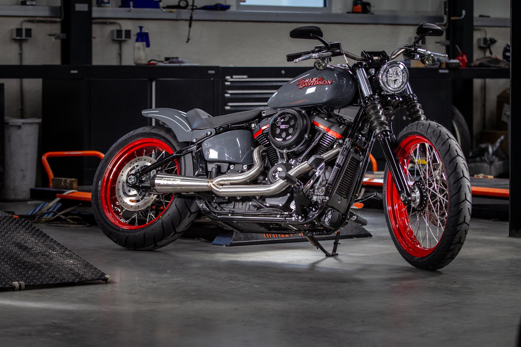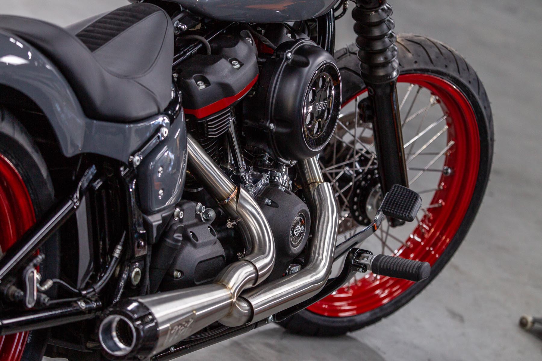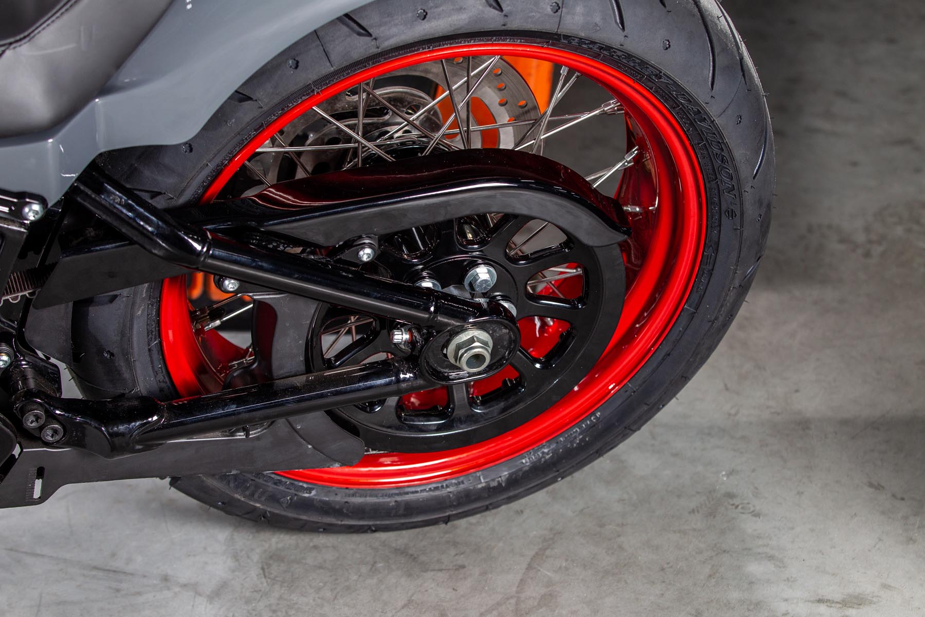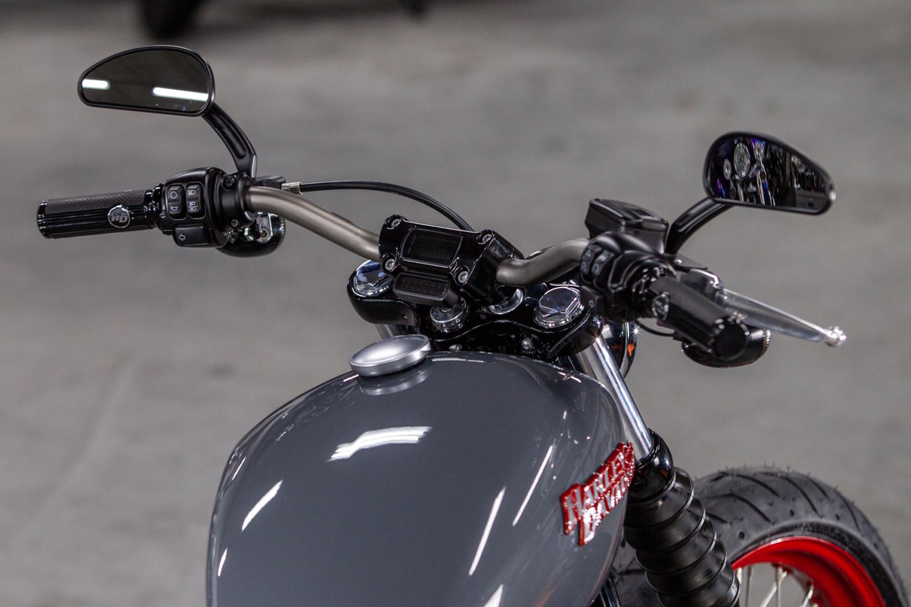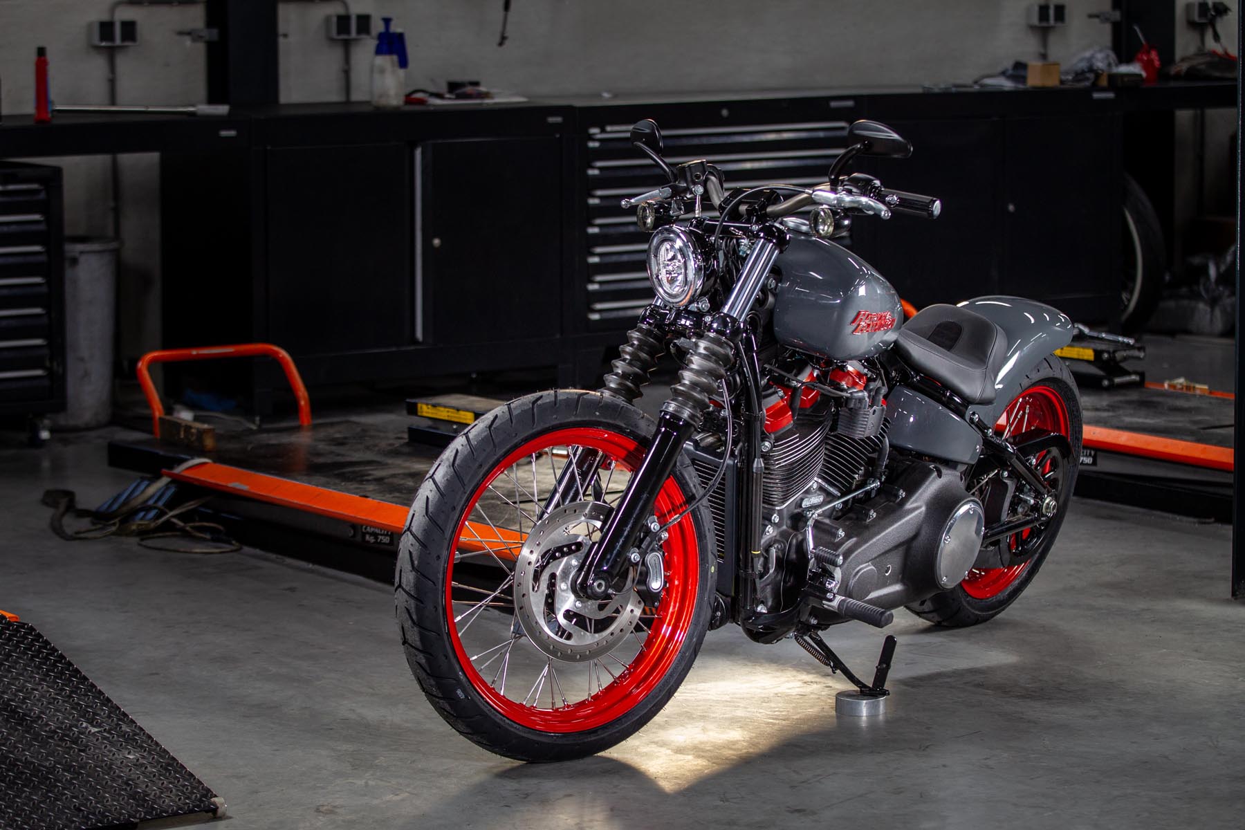 Big Rivers H-D uit Heteren er opnieuw van de partij. Met hun creatie ‘The Gunship’, op basis van een Harley-Davidson Street Bob, verwachten ze hoge ogen te gaan gooien. After Sales Manager Huubke van Boldrik vertelt: ‘De inspiratie voor deze build kwam van de Harley-Davidson CVO-lijn. Deze zeer exclusieve lijn heeft een afwerkingsniveau dat ongeëvenaard is in de motorbranche, met waanzinnige kleurstellingen. Uiteindelijk besloten we de look & feel van de CVO modellijn door te vertalen naar het Softail platform. De kleur van die machine heet Gunship Grey, en zo ontstond de naam – The Gunship – en het bijpassende concept: een agressieve chopper met een indrukwekkende, stoere stance.’ Het team ging aan de slag en voerde nogal wat modificaties door. Zo kreeg de Street Bob een custom achterspatbord, een ander stuur, gewijzigde spaakwielen en een custom zadel. De mid-controls werden naar voren verplaatst en de achterzijde van de machine ging een paar centimeter omlaag. Uit de P&A catalogus kwamen o.a. nieuwe spiegels en handvatten en tenslotte werd er een custom TBR 2-in-1 uitlaatsysteem gemonteerd. Een royale laag hoogglanzende Gunship Grey lak met bordeauxrode accenten en velgen maakte het project compleet. Van Boldrik, met nauwelijks verholen trots: ‘We hebben er keihard aan gewerkt, maar dat zie je er volgens ons ook echt aan af. We zijn als team erg trots op het resultaat. Laat die stemmen maar komen!’