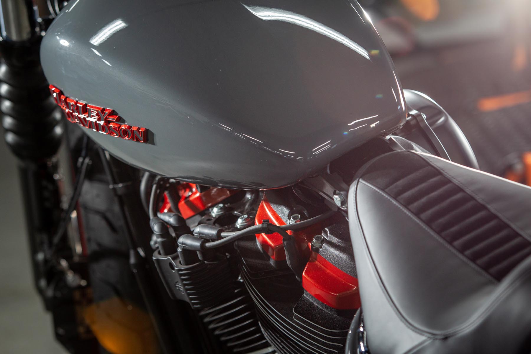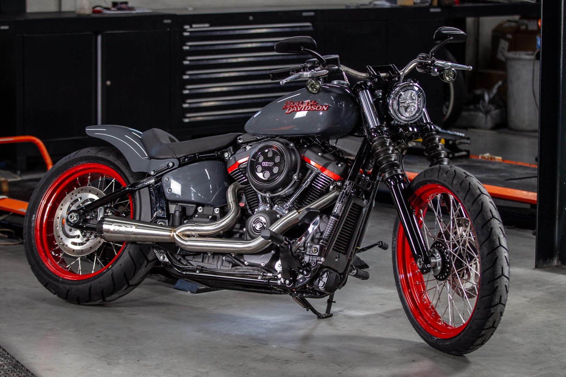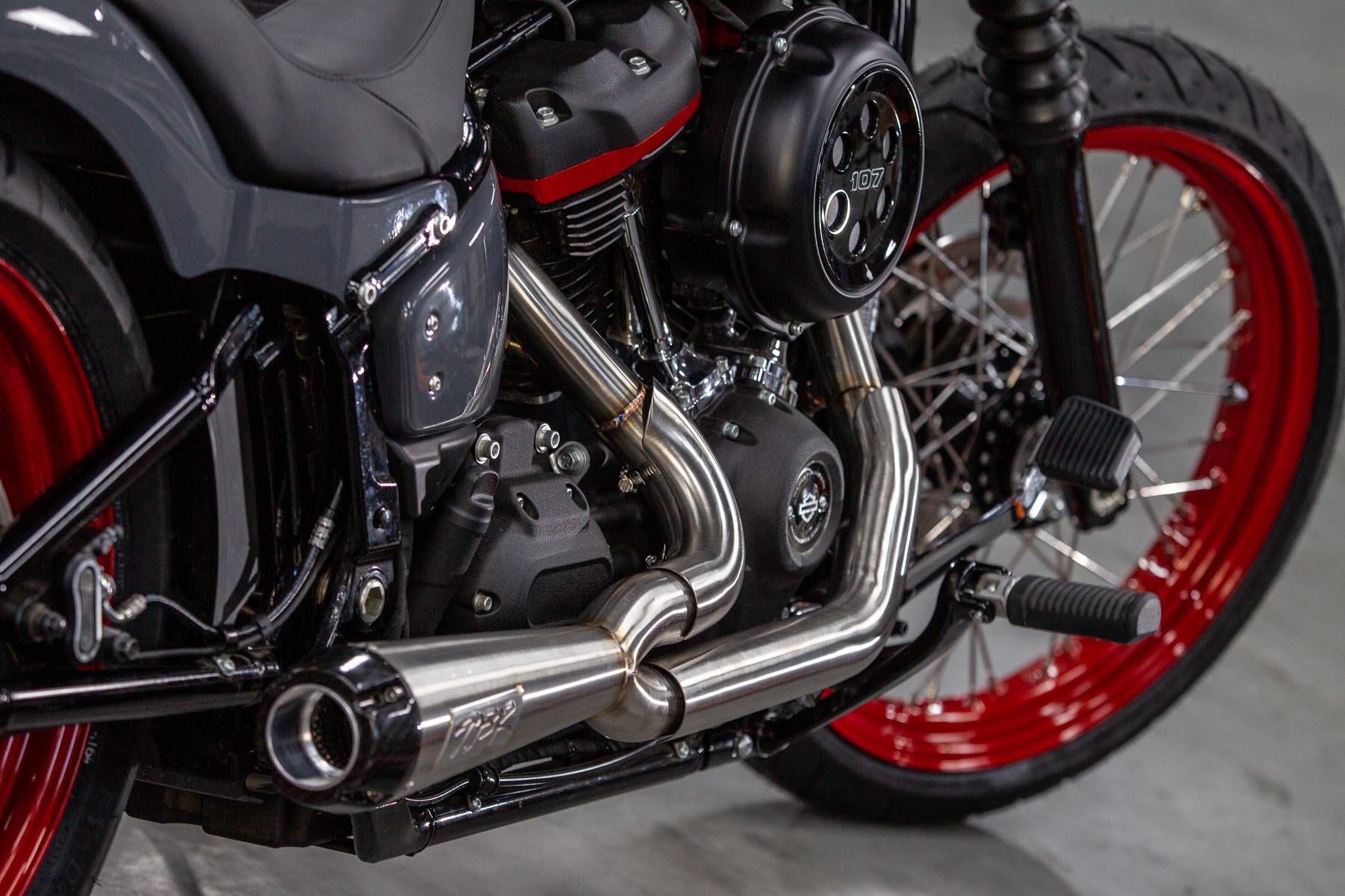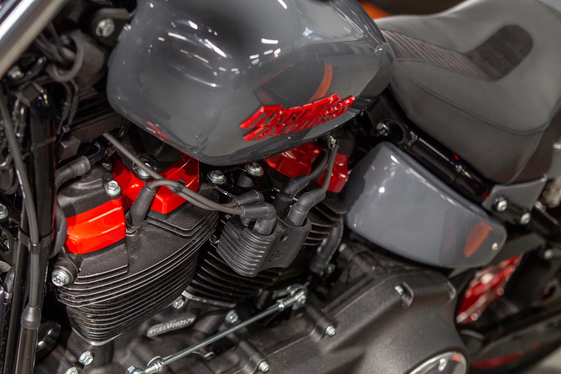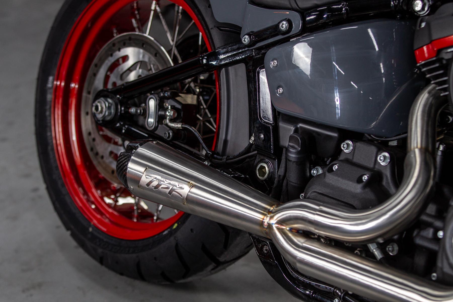 Big Rivers H-D uit Heteren er opnieuw van de partij. Met hun creatie ‘The Gunship’, op basis van een Harley-Davidson Street Bob, verwachten ze hoge ogen te gaan gooien. After Sales Manager Huubke van Boldrik vertelt: ‘De inspiratie voor deze build kwam van de Harley-Davidson CVO-lijn. Deze zeer exclusieve lijn heeft een afwerkingsniveau dat ongeëvenaard is in de motorbranche, met waanzinnige kleurstellingen. Uiteindelijk besloten we de look & feel van de CVO modellijn door te vertalen naar het Softail platform. De kleur van die machine heet Gunship Grey, en zo ontstond de naam – The Gunship – en het bijpassende concept: een agressieve chopper met een indrukwekkende, stoere stance.’ Het team ging aan de slag en voerde nogal wat modificaties door. Zo kreeg de Street Bob een custom achterspatbord, een ander stuur, gewijzigde spaakwielen en een custom zadel. De mid-controls werden naar voren verplaatst en de achterzijde van de machine ging een paar centimeter omlaag. Uit de P&A catalogus kwamen o.a. nieuwe spiegels en handvatten en tenslotte werd er een custom TBR 2-in-1 uitlaatsysteem gemonteerd. Een royale laag hoogglanzende Gunship Grey lak met bordeauxrode accenten en velgen maakte het project compleet. Van Boldrik, met nauwelijks verholen trots: ‘We hebben er keihard aan gewerkt, maar dat zie je er volgens ons ook echt aan af. We zijn als team erg trots op het resultaat. Laat die stemmen maar komen!’
