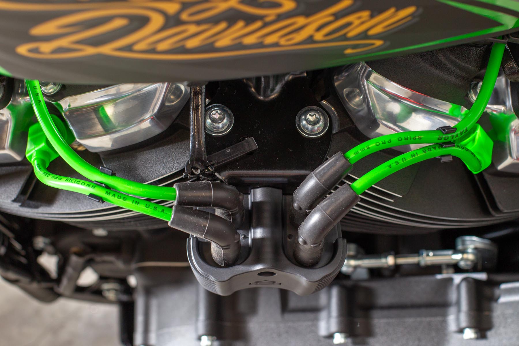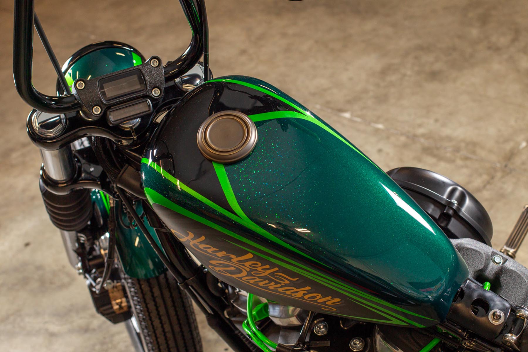 Ook de upswept uitlaten zijn zelf gemaakt en vervolgens getapet. De hele machine ging 3 cm omlaag en kreeg klassieke ballonbanden, met aan de achterkant een dicht achterwiel. Een apehanger-stuur en optisch zwevend zadel maakten het verhaal compleet, waarna de lakspecialisten van Paint Atelier de vrije hand kregen om de creatie van kleur te voorzien. Het werd een combinatie van groene metal flake lak en matzwart, wat de machine een klassieke look met een modern randje geeft. Ronald Bernearts: ‘Het resultaat mag er zijn, toch? Wij kunnen niet wachten om de Green Splitter aan het publiek te presenteren. We kijken uit naar een mooie Battle!’