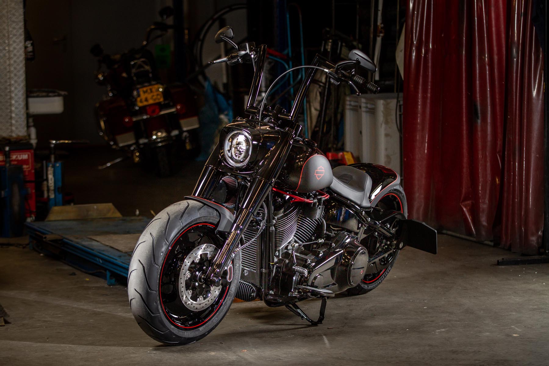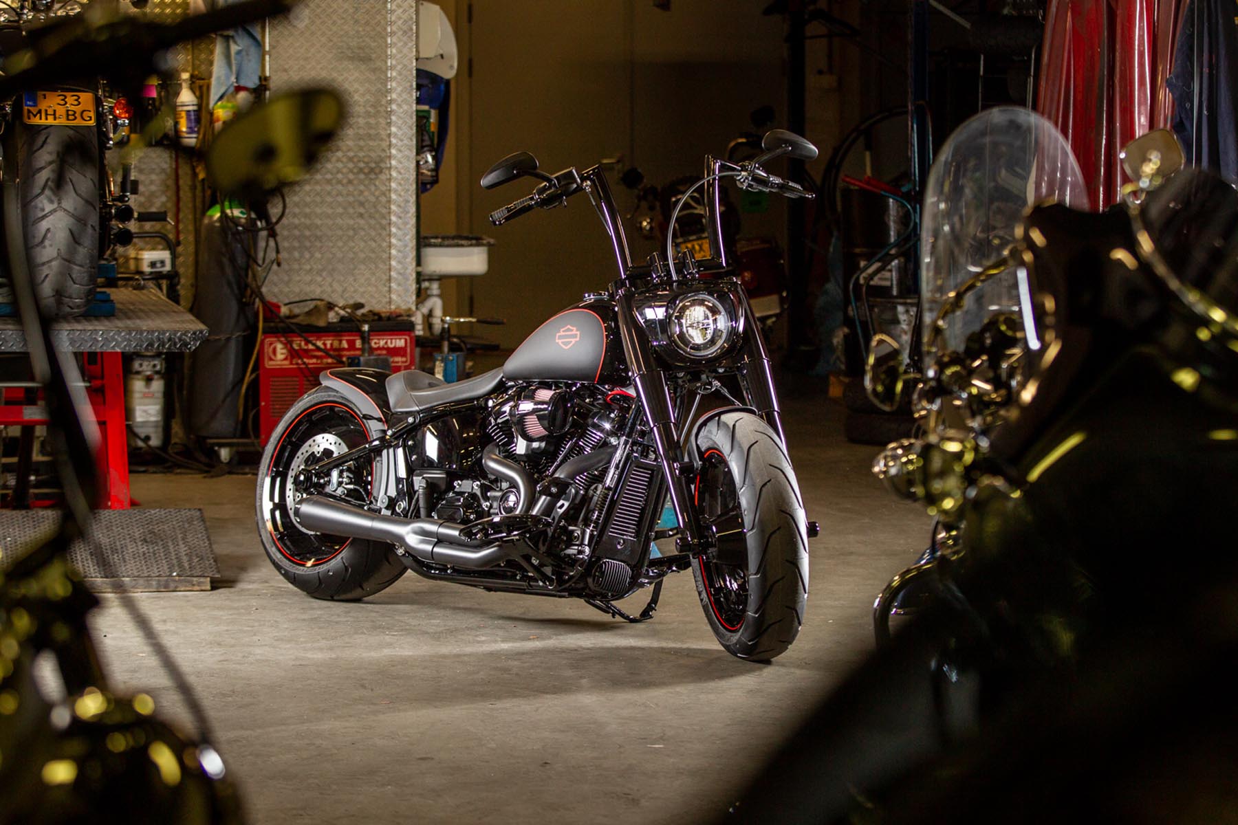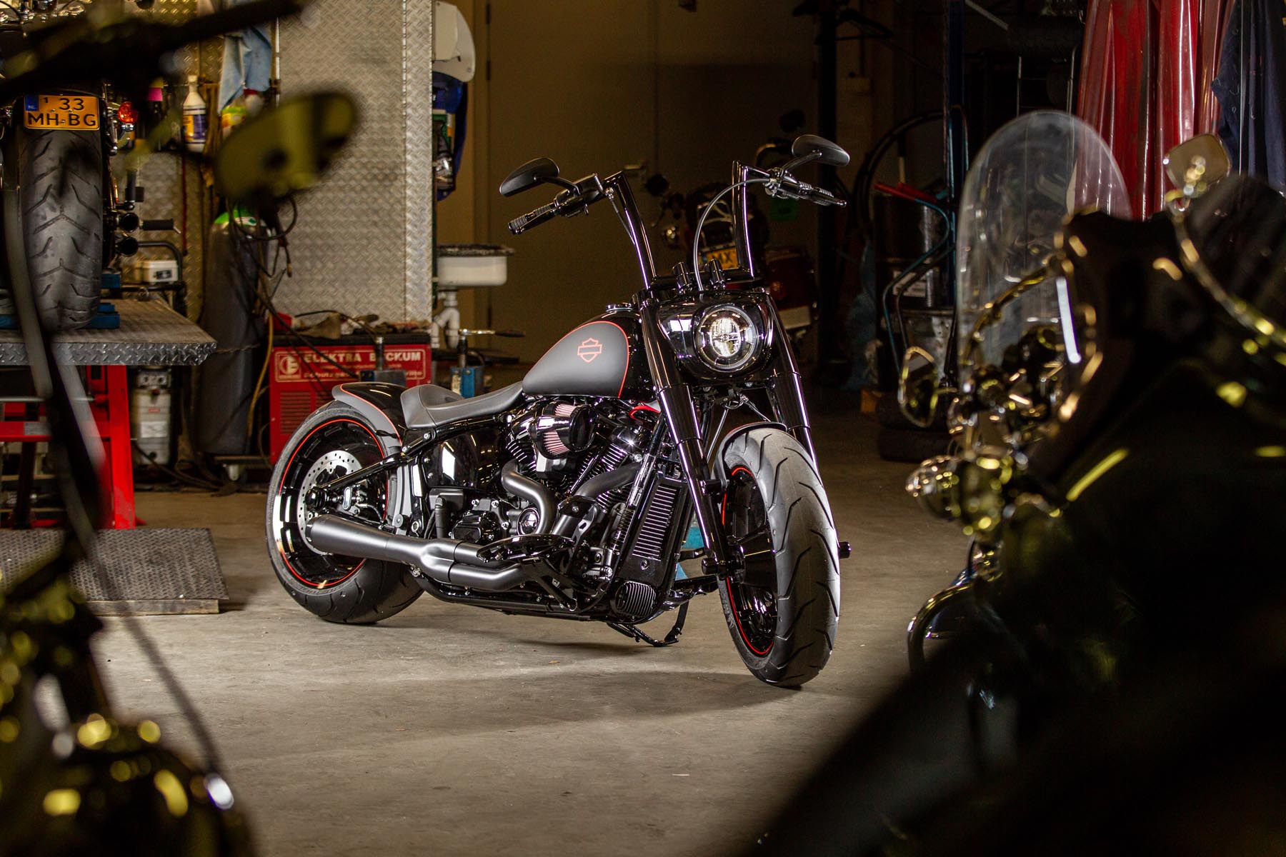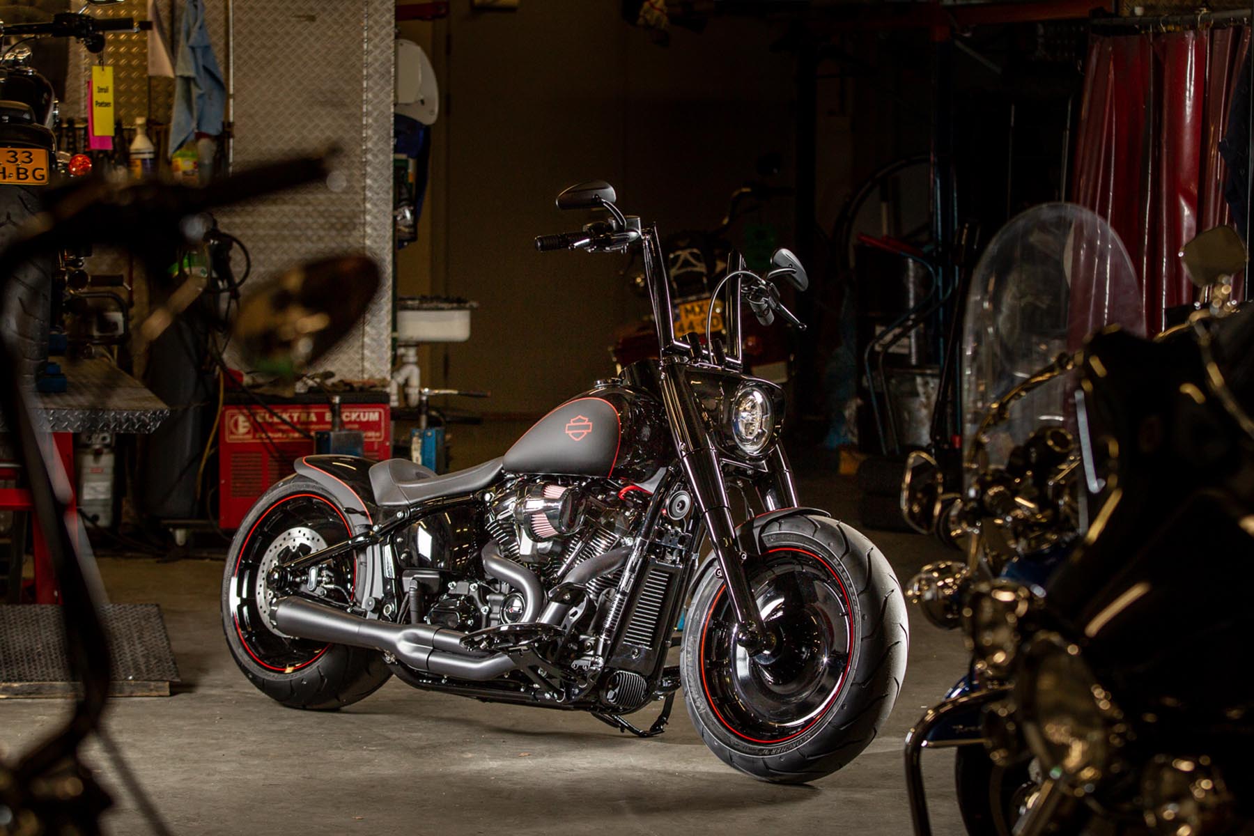 De Amersfoortse H-D dealer Motor Saloon is van de partij met hun ‘Fat & Black’. De custom is gebouwd op basis van een Harley-Davidson Fat Boy Special. Motor Saloon verwacht hoge ogen te gooien. Eigenaar Marco van Velzen vertelt: ‘We hadden al snel de naam ‘Fat & Black’ in ons hoofd en dat is precies wat we gebouwd hebben.’ Nou is de Fat Boy Special van zichzelf al geen bescheiden motorfiets, maar Van Velzen en zijn team bestaande uit Koen Wijgergangs en Mark van der Laar hebben er nog een paar flinke scheppen bovenop gedaan. Zo zijn zowel voor als achter de spatborden flink gechopt, kreeg de machine een ‘fat-mini-apehanger’ stuur en een custom Bassani 2-in-1 uitlaat. Voor wat extra f*ck you kreeg hij een Heavy Breather luchtfilter en werd er aan de achterkant luchtvering geïnstalleerd, waardoor de motorfiets bij stilstand extreem laag op het achterwiel zakt. Vervolgens werd alles (‘echt, alles!’) diep, donker zwart gemaakt. Het resultaat: een indrukwekkende zwarte bruut, die zijn naam Fat & Black dubbel en dwars eer aan doet. Marco van Velzen: ‘We zijn heel trots op het resultaat en hebben veel vertrouwen in een succesvolle Battle. Laat de concurrentie maar komen!’