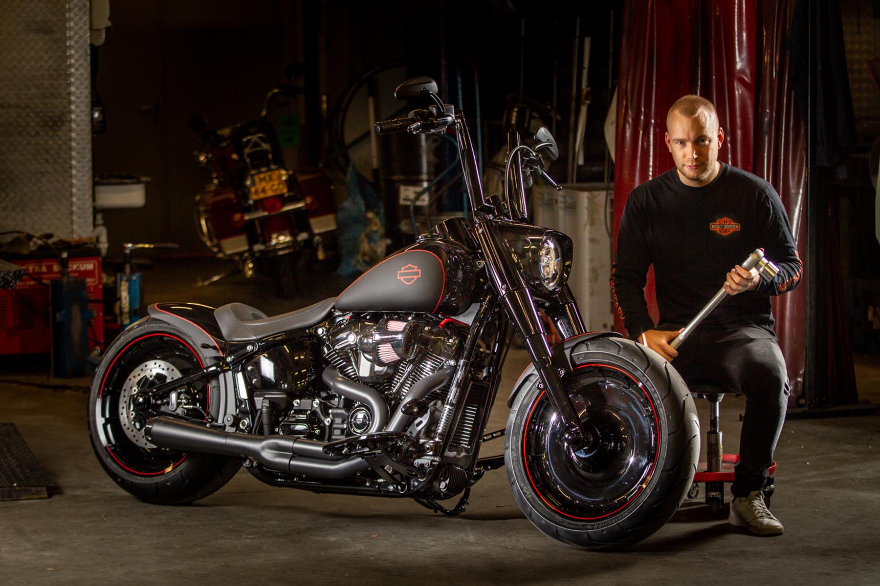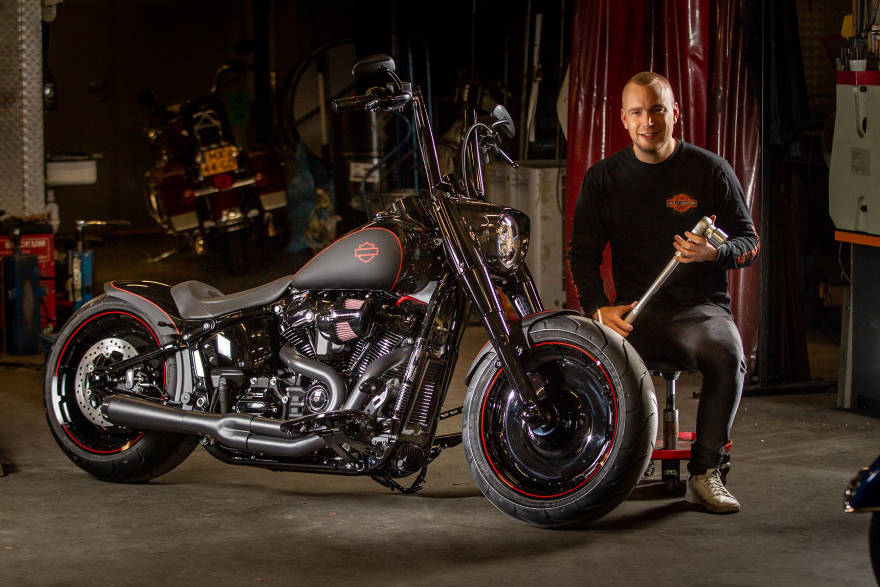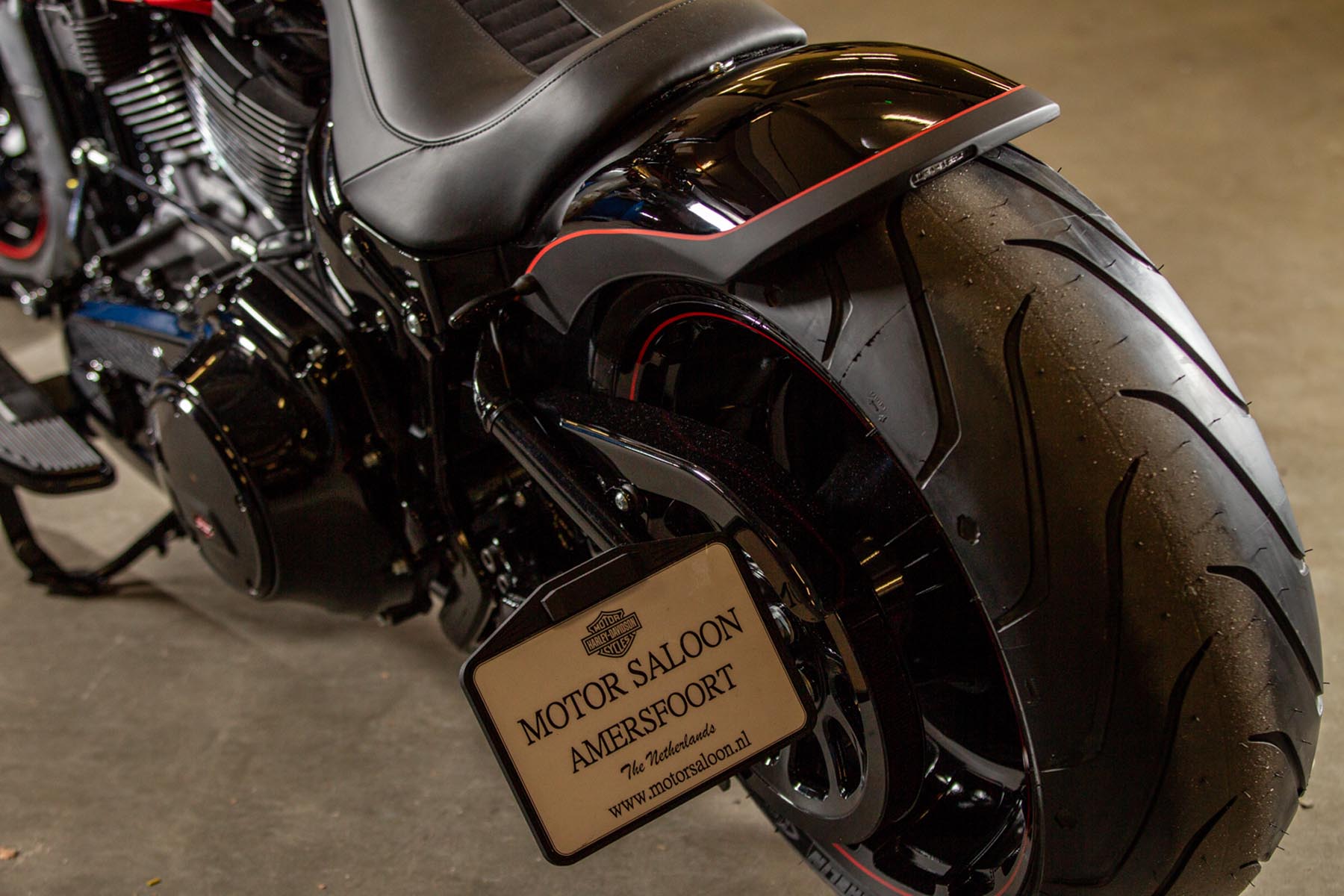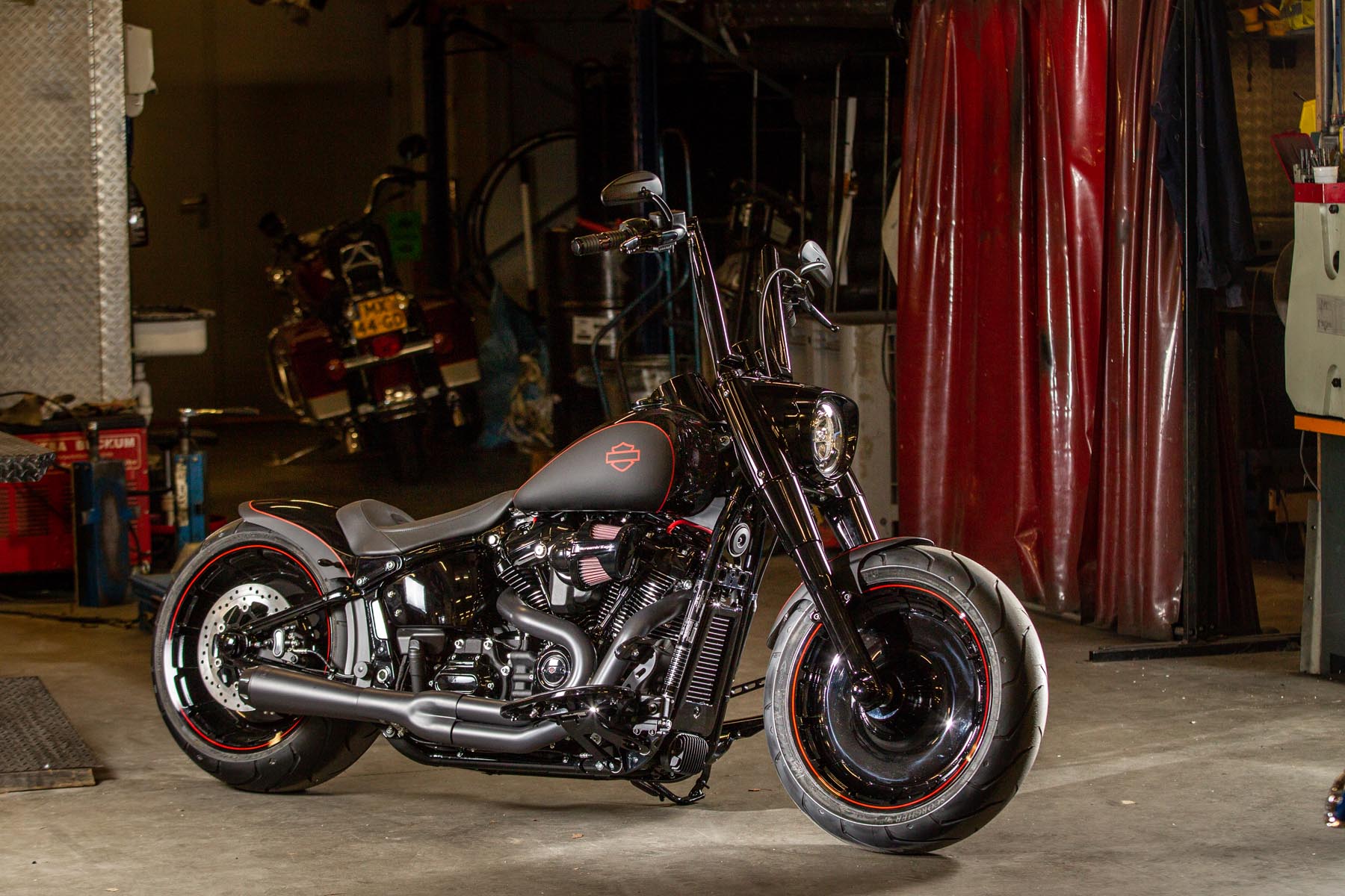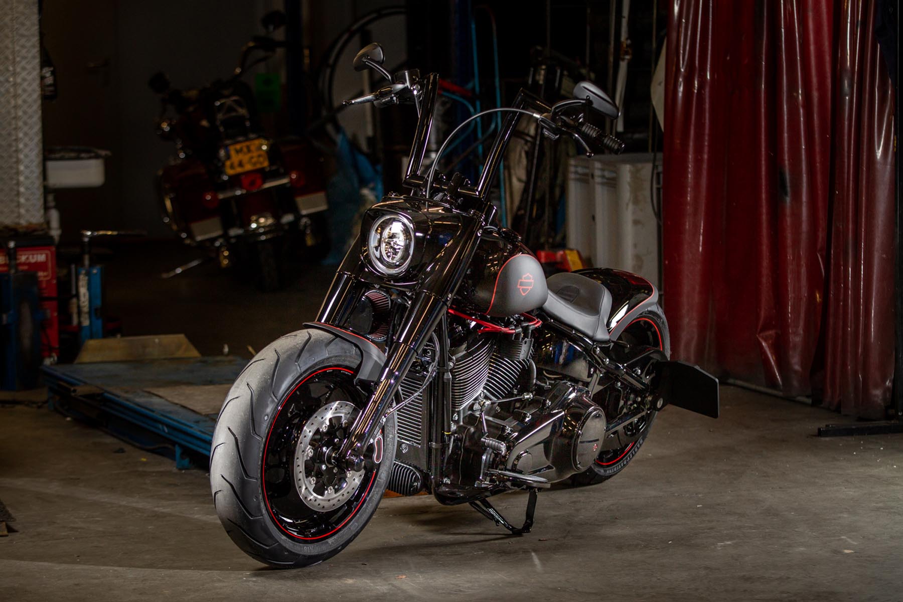 De Amersfoortse H-D dealer Motor Saloon is van de partij met hun ‘Fat & Black’. De custom is gebouwd op basis van een Harley-Davidson Fat Boy Special. Motor Saloon verwacht hoge ogen te gooien. Eigenaar Marco van Velzen vertelt: ‘We hadden al snel de naam ‘Fat & Black’ in ons hoofd en dat is precies wat we gebouwd hebben.’ Nou is de Fat Boy Special van zichzelf al geen bescheiden motorfiets, maar Van Velzen en zijn team bestaande uit Koen Wijgergangs en Mark van der Laar hebben er nog een paar flinke scheppen bovenop gedaan. Zo zijn zowel voor als achter de spatborden flink gechopt, kreeg de machine een ‘fat-mini-apehanger’ stuur en een custom Bassani 2-in-1 uitlaat. Voor wat extra f*ck you kreeg hij een Heavy Breather luchtfilter en werd er aan de achterkant luchtvering geïnstalleerd, waardoor de motorfiets bij stilstand extreem laag op het achterwiel zakt. Vervolgens werd alles (‘echt, alles!’) diep, donker zwart gemaakt. Het resultaat: een indrukwekkende zwarte bruut, die zijn naam Fat & Black dubbel en dwars eer aan doet. Marco van Velzen: ‘We zijn heel trots op het resultaat en hebben veel vertrouwen in een succesvolle Battle. Laat de concurrentie maar komen!’