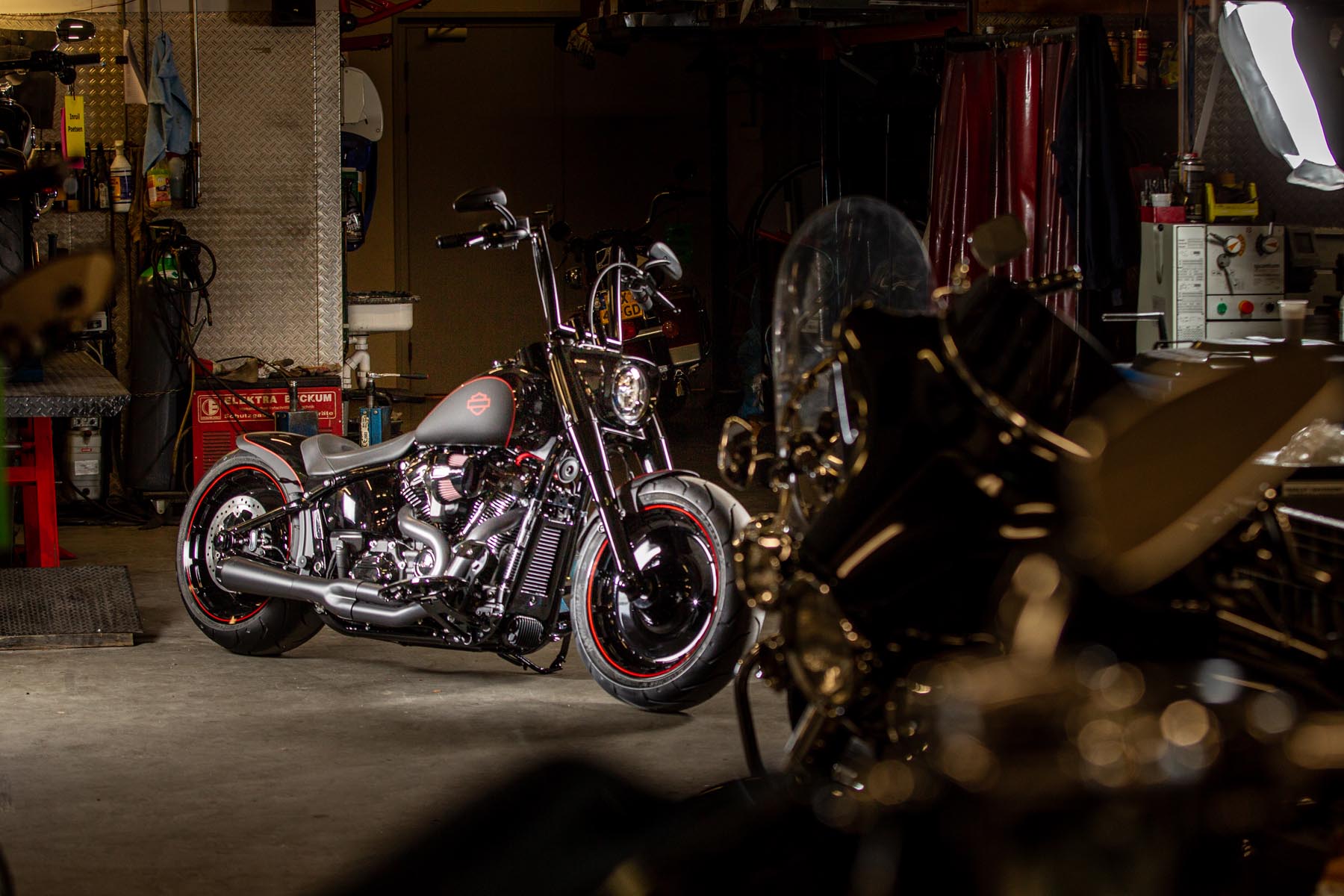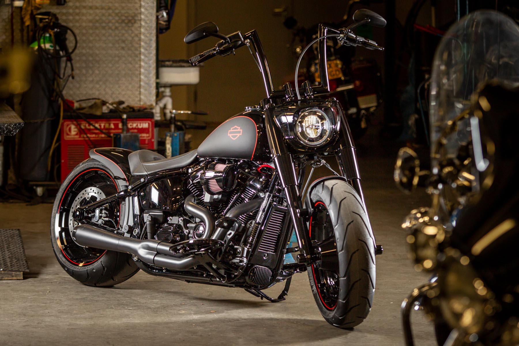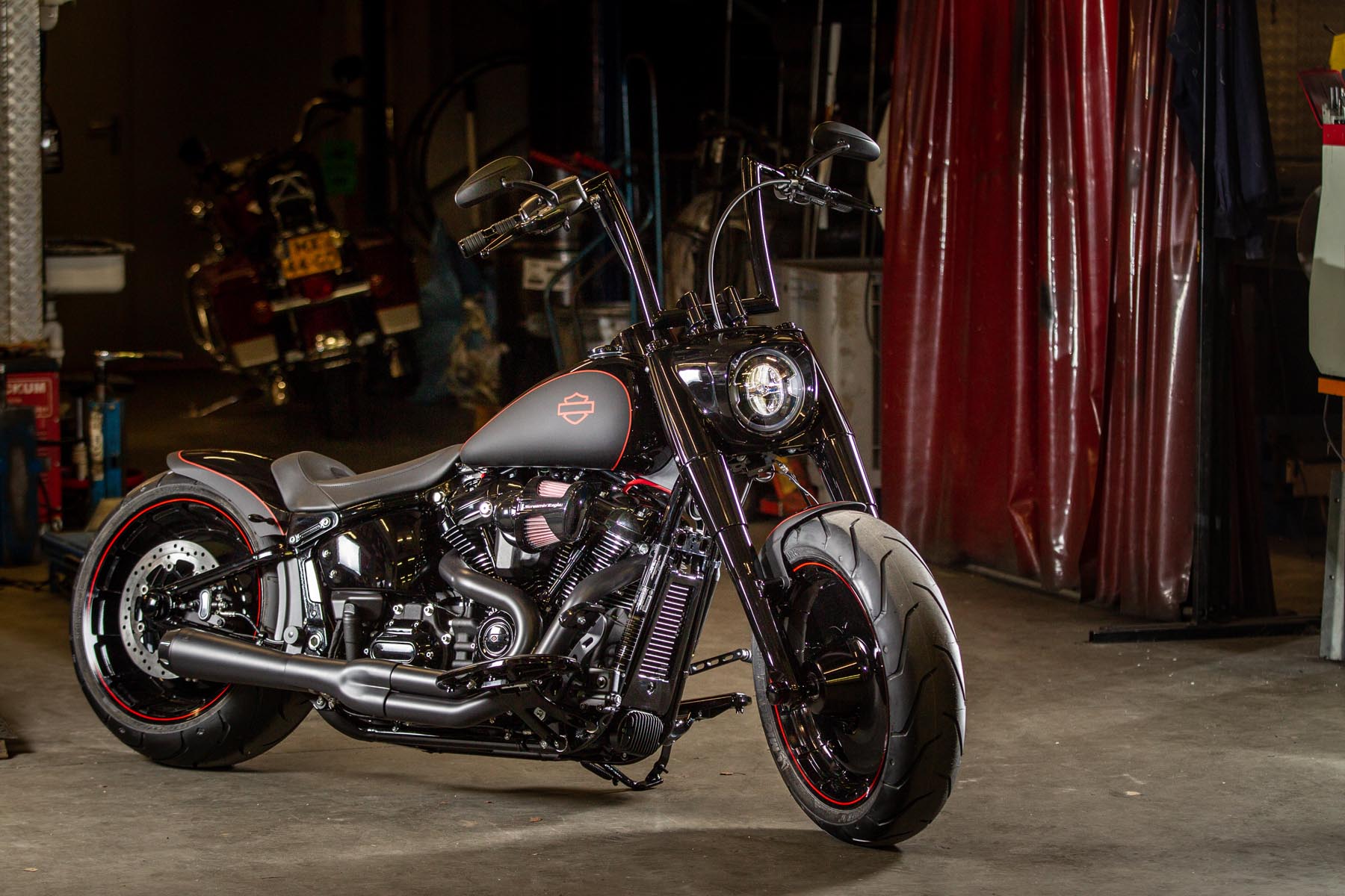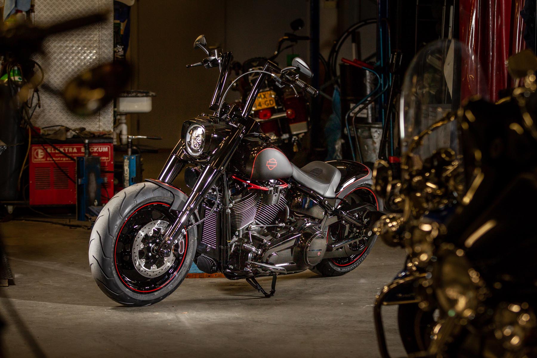 De Amersfoortse H-D dealer Motor Saloon is van de partij met hun ‘Fat & Black’. De custom is gebouwd op basis van een Harley-Davidson Fat Boy Special. Motor Saloon verwacht hoge ogen te gooien. Eigenaar Marco van Velzen vertelt: ‘We hadden al snel de naam ‘Fat & Black’ in ons hoofd en dat is precies wat we gebouwd hebben.’ Nou is de Fat Boy Special van zichzelf al geen bescheiden motorfiets, maar Van Velzen en zijn team bestaande uit Koen Wijgergangs en Mark van der Laar hebben er nog een paar flinke scheppen bovenop gedaan. Zo zijn zowel voor als achter de spatborden flink gechopt, kreeg de machine een ‘fat-mini-apehanger’ stuur en een custom Bassani 2-in-1 uitlaat. Voor wat extra f*ck you kreeg hij een Heavy Breather luchtfilter en werd er aan de achterkant luchtvering geïnstalleerd, waardoor de motorfiets bij stilstand extreem laag op het achterwiel zakt. Vervolgens werd alles (‘echt, alles!’) diep, donker zwart gemaakt. Het resultaat: een indrukwekkende zwarte bruut, die zijn naam Fat & Black dubbel en dwars eer aan doet. Marco van Velzen: ‘We zijn heel trots op het resultaat en hebben veel vertrouwen in een succesvolle Battle. Laat de concurrentie maar komen!’