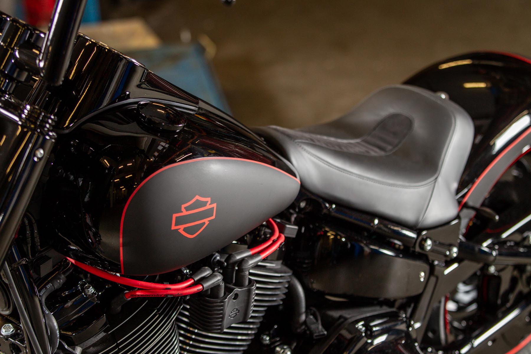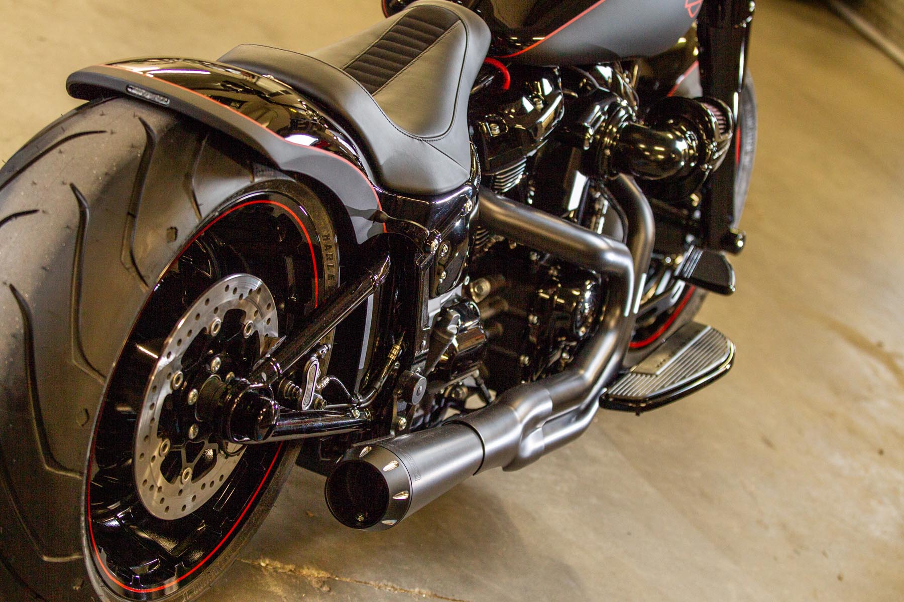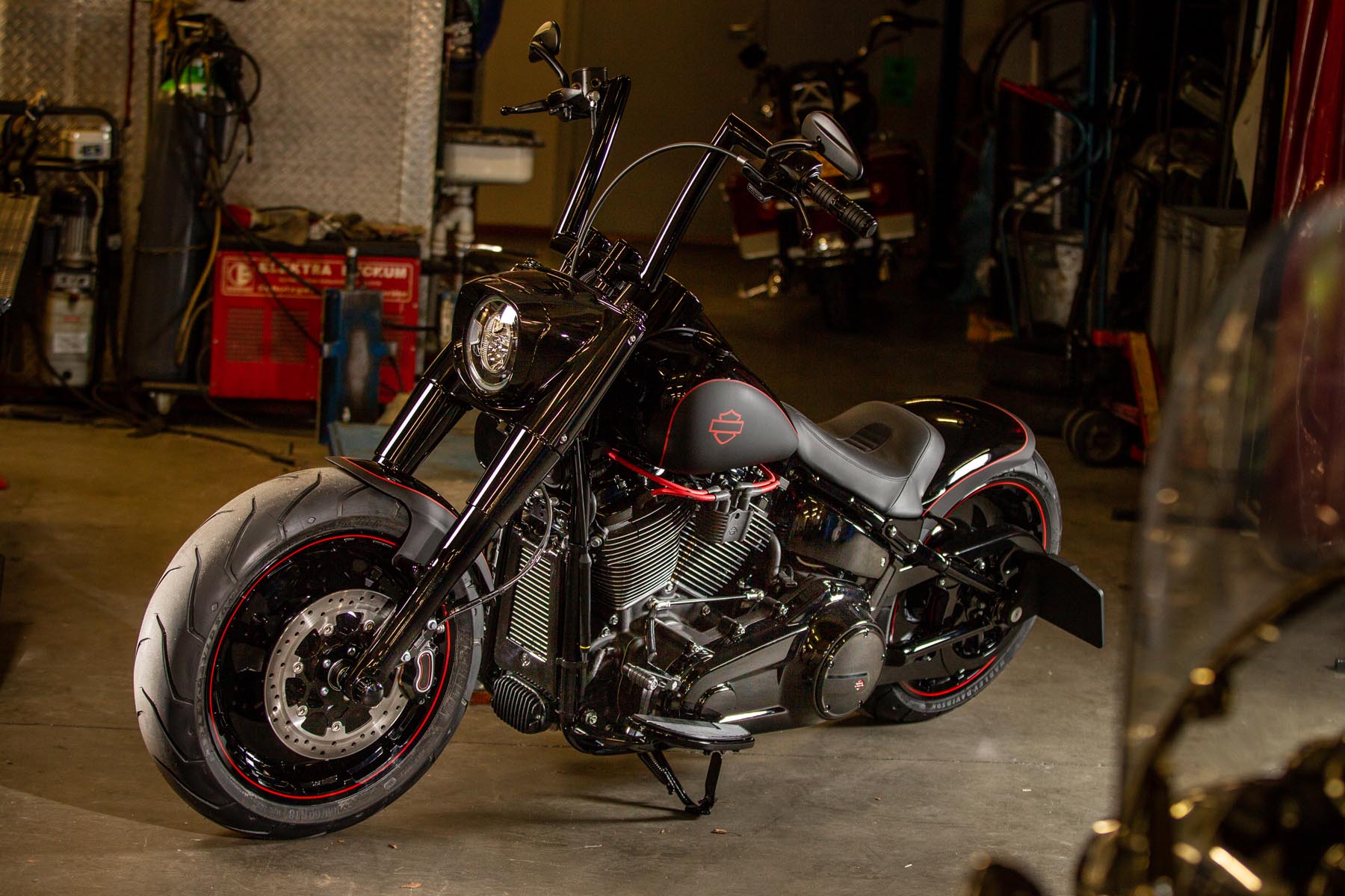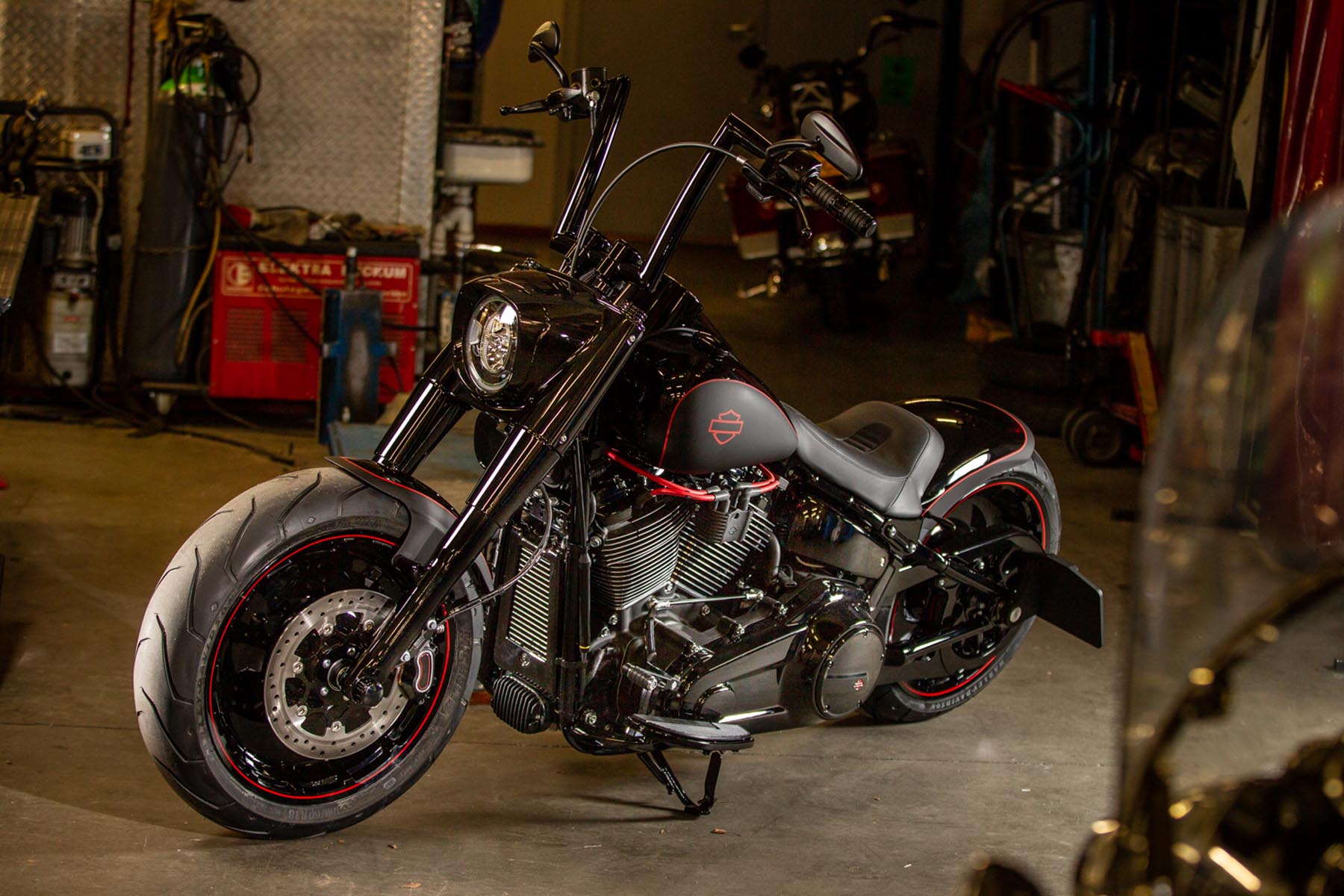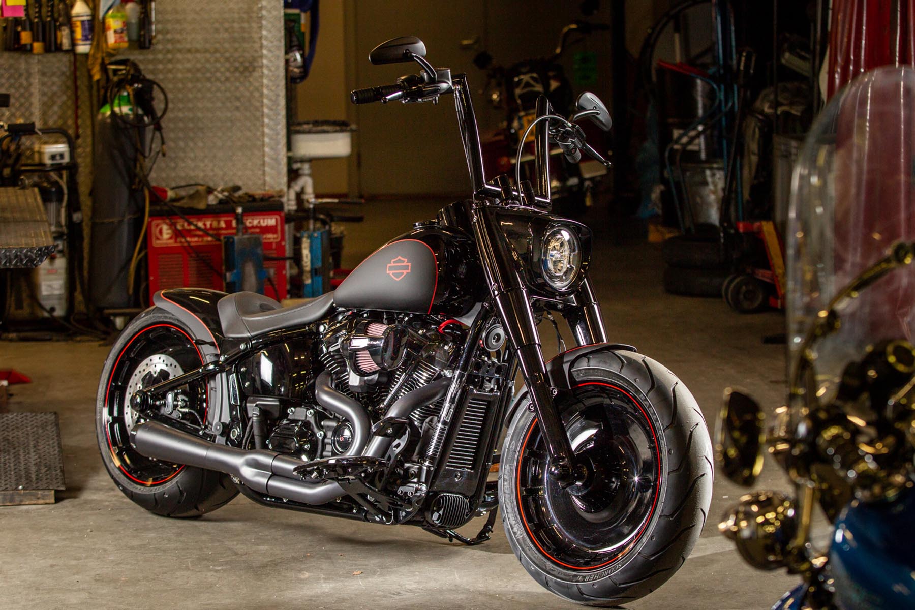 De Amersfoortse H-D dealer Motor Saloon is van de partij met hun ‘Fat & Black’. De custom is gebouwd op basis van een Harley-Davidson Fat Boy Special. Motor Saloon verwacht hoge ogen te gooien. Eigenaar Marco van Velzen vertelt: ‘We hadden al snel de naam ‘Fat & Black’ in ons hoofd en dat is precies wat we gebouwd hebben.’ Nou is de Fat Boy Special van zichzelf al geen bescheiden motorfiets, maar Van Velzen en zijn team bestaande uit Koen Wijgergangs en Mark van der Laar hebben er nog een paar flinke scheppen bovenop gedaan. Zo zijn zowel voor als achter de spatborden flink gechopt, kreeg de machine een ‘fat-mini-apehanger’ stuur en een custom Bassani 2-in-1 uitlaat. Voor wat extra f*ck you kreeg hij een Heavy Breather luchtfilter en werd er aan de achterkant luchtvering geïnstalleerd, waardoor de motorfiets bij stilstand extreem laag op het achterwiel zakt. Vervolgens werd alles (‘echt, alles!’) diep, donker zwart gemaakt. Het resultaat: een indrukwekkende zwarte bruut, die zijn naam Fat & Black dubbel en dwars eer aan doet. Marco van Velzen: ‘We zijn heel trots op het resultaat en hebben veel vertrouwen in een succesvolle Battle. Laat de concurrentie maar komen!’