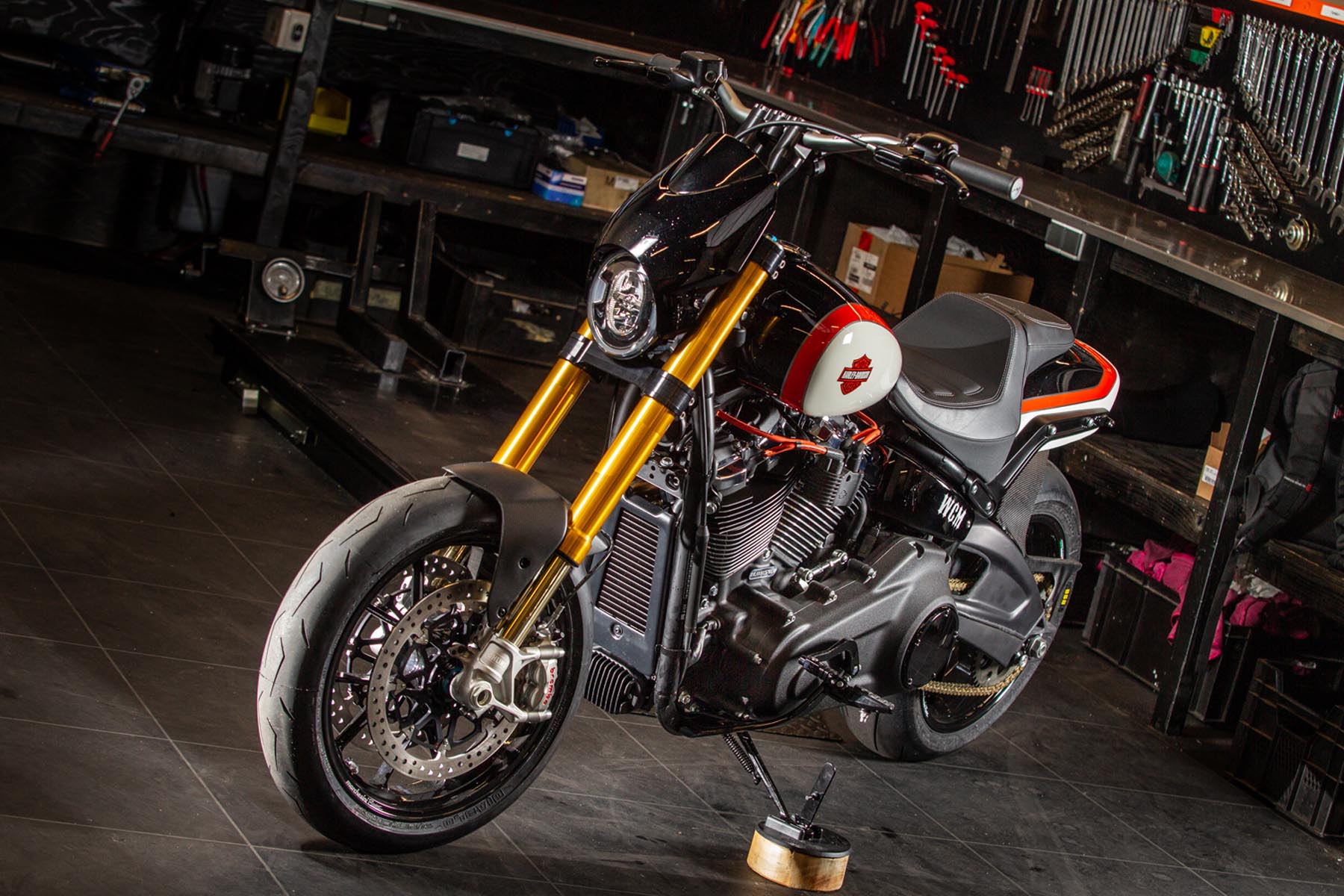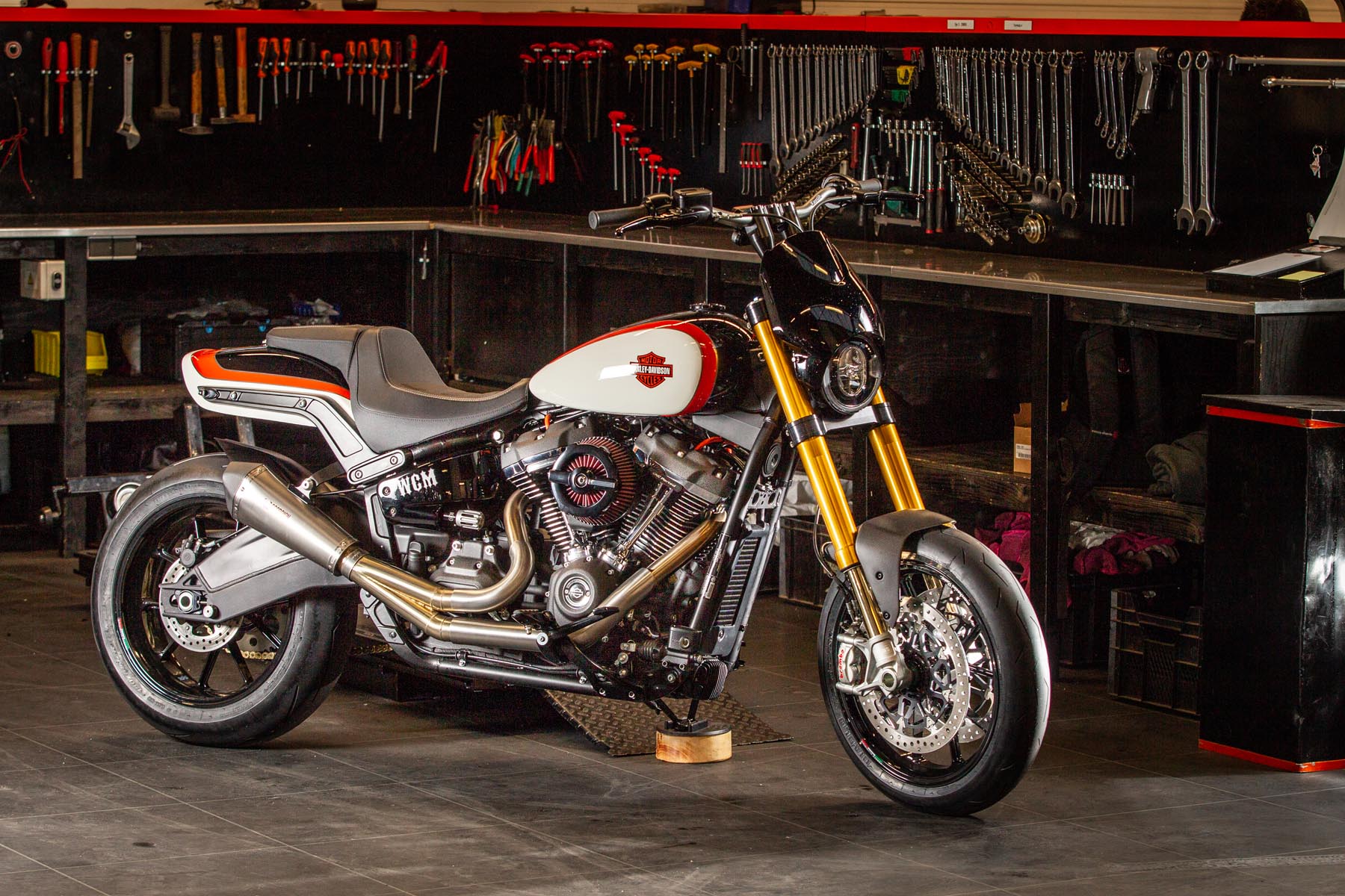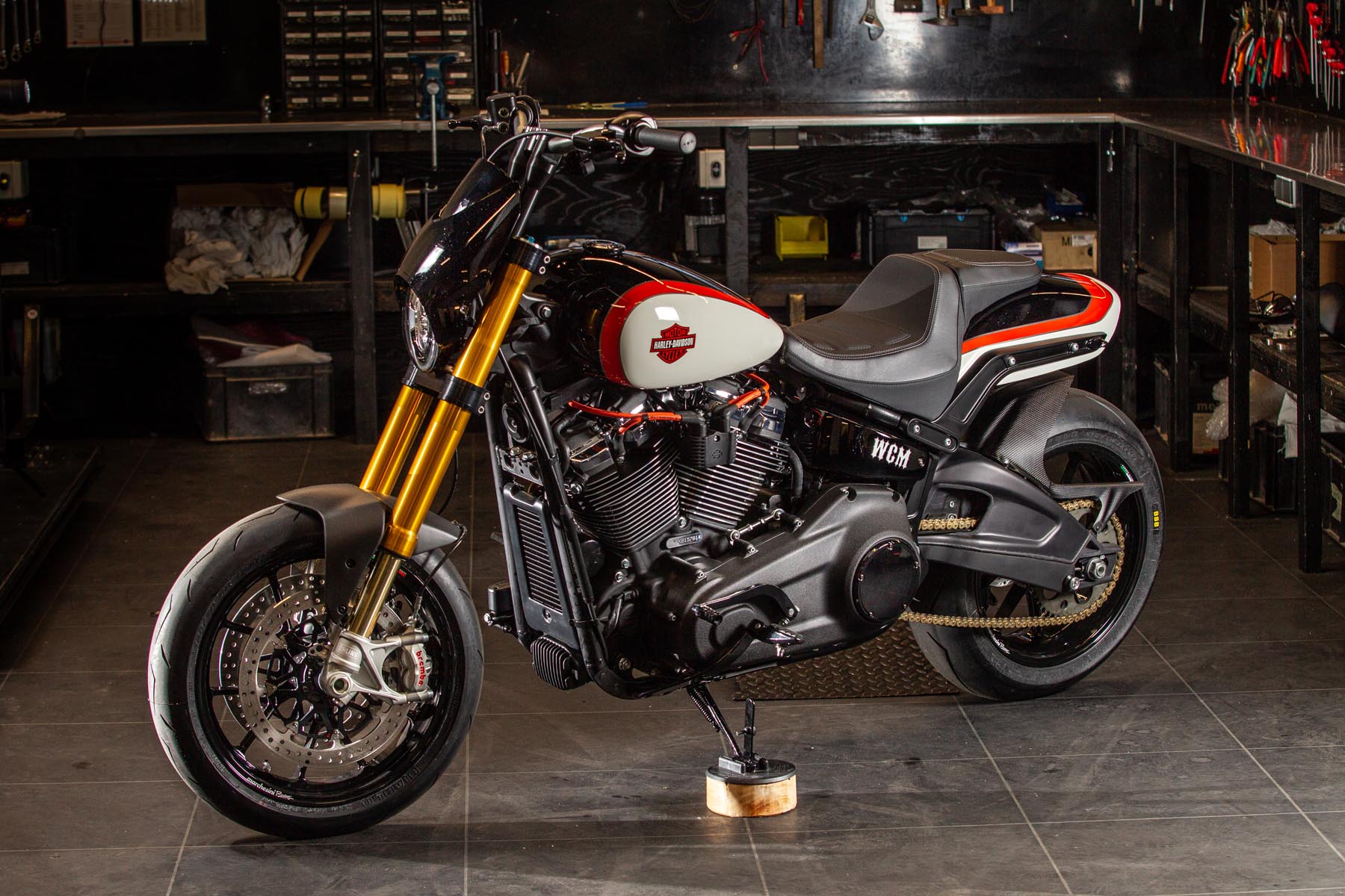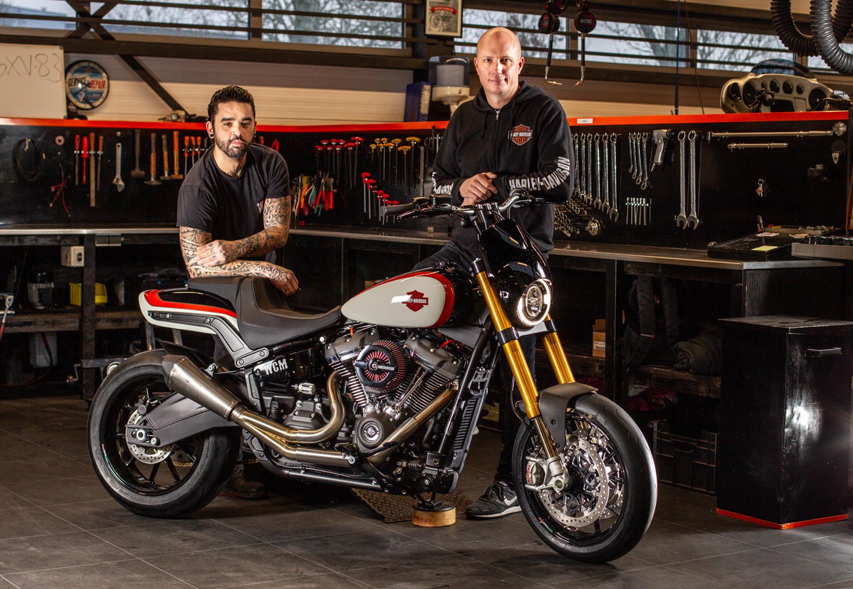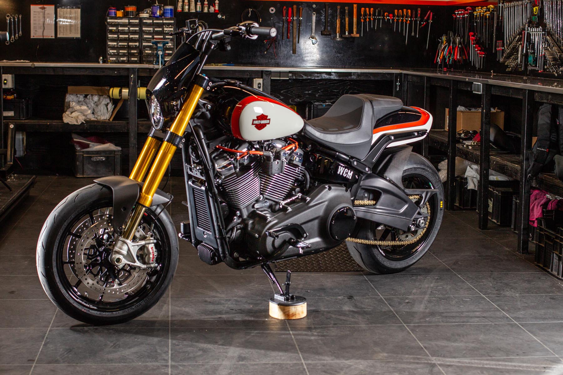 Vervolgens pakte Master Technician Gideon Schüssler het rijwielgedeelte flink aan, waarbij – met behoud van de Fat Bob-lijnen – de grondspeling toenam, het gewicht omlaag ging en er verschillende onderdelen vervangen werden. Zo kreeg de machine een Öhlins upside-down voorvork, een achterbrug van een Superbike en lichtgewicht Marchesini velgen. Om al dat geweld tot stilstand te brengen zetten Brembo Monoblocks hun tanden in 320mm remschijven. De machine kreeg een custom 2-in1-uitlaatsysteem en werd gespoten in de klassieke oranje-wit-zwarte Harley-racekleuren. Bas Leek, met nauwelijks verholen trots: ‘Al met al staat er een beest van een motor waar ik heel veel plezier van ga hebben en waarvan ik overtuigd ben dat mijn klanten hem ook geweldig vinden. En als het publiek en de jury van de Battle of the Kings hem ook op waarde weten te schatten moeten we weer een heel eind kunnen komen dit jaar!’