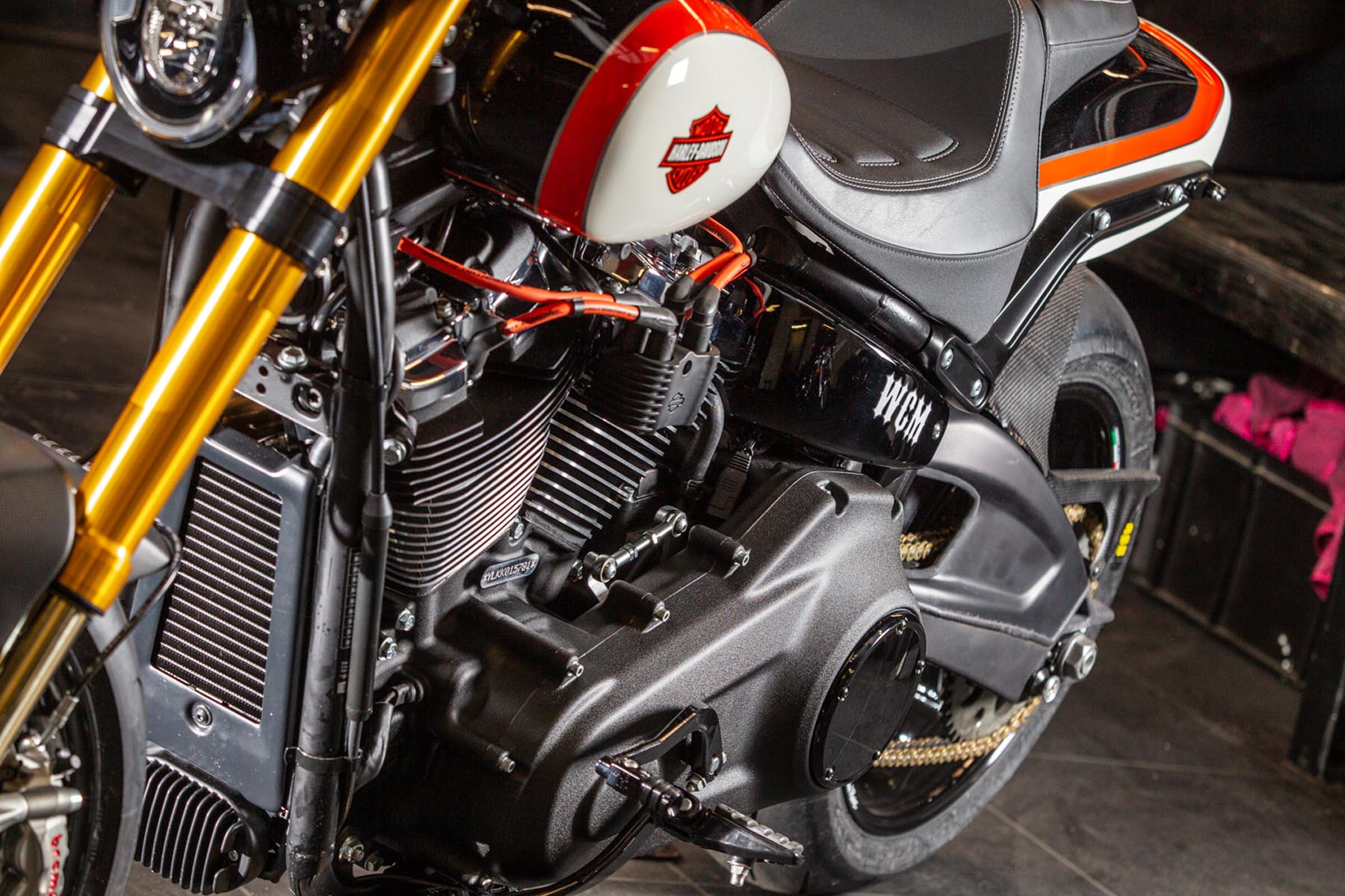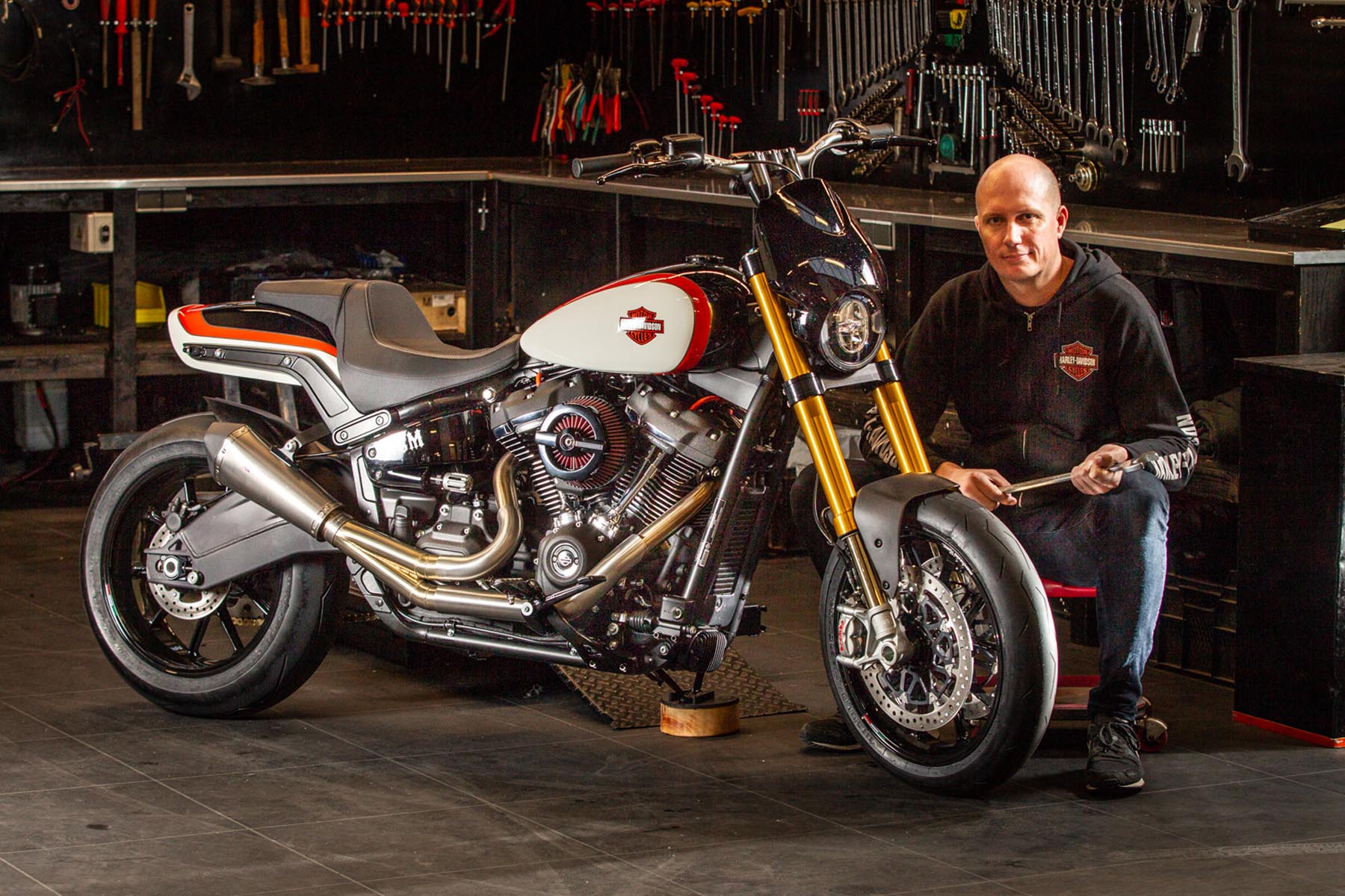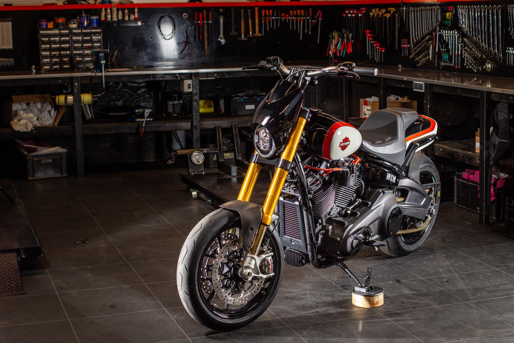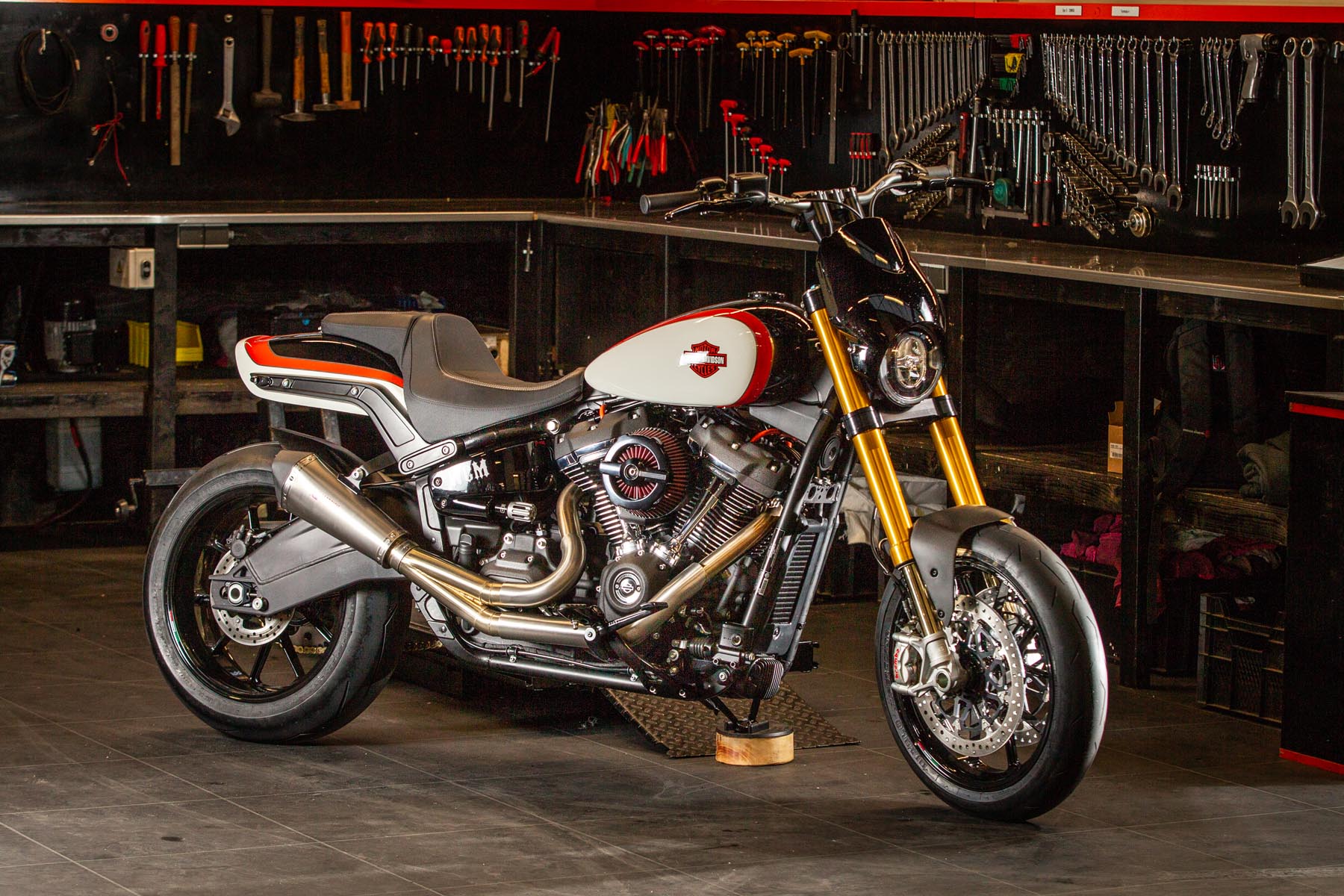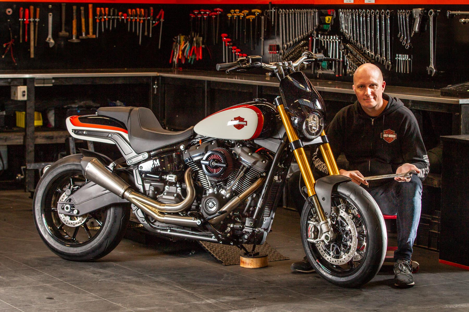 Vervolgens pakte Master Technician Gideon Schüssler het rijwielgedeelte flink aan, waarbij – met behoud van de Fat Bob-lijnen – de grondspeling toenam, het gewicht omlaag ging en er verschillende onderdelen vervangen werden. Zo kreeg de machine een Öhlins upside-down voorvork, een achterbrug van een Superbike en lichtgewicht Marchesini velgen. Om al dat geweld tot stilstand te brengen zetten Brembo Monoblocks hun tanden in 320mm remschijven. De machine kreeg een custom 2-in1-uitlaatsysteem en werd gespoten in de klassieke oranje-wit-zwarte Harley-racekleuren. Bas Leek, met nauwelijks verholen trots: ‘Al met al staat er een beest van een motor waar ik heel veel plezier van ga hebben en waarvan ik overtuigd ben dat mijn klanten hem ook geweldig vinden. En als het publiek en de jury van de Battle of the Kings hem ook op waarde weten te schatten moeten we weer een heel eind kunnen komen dit jaar!’