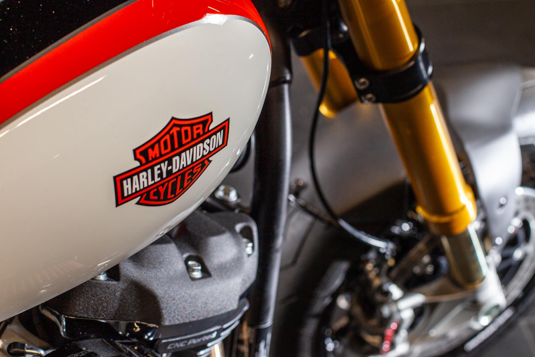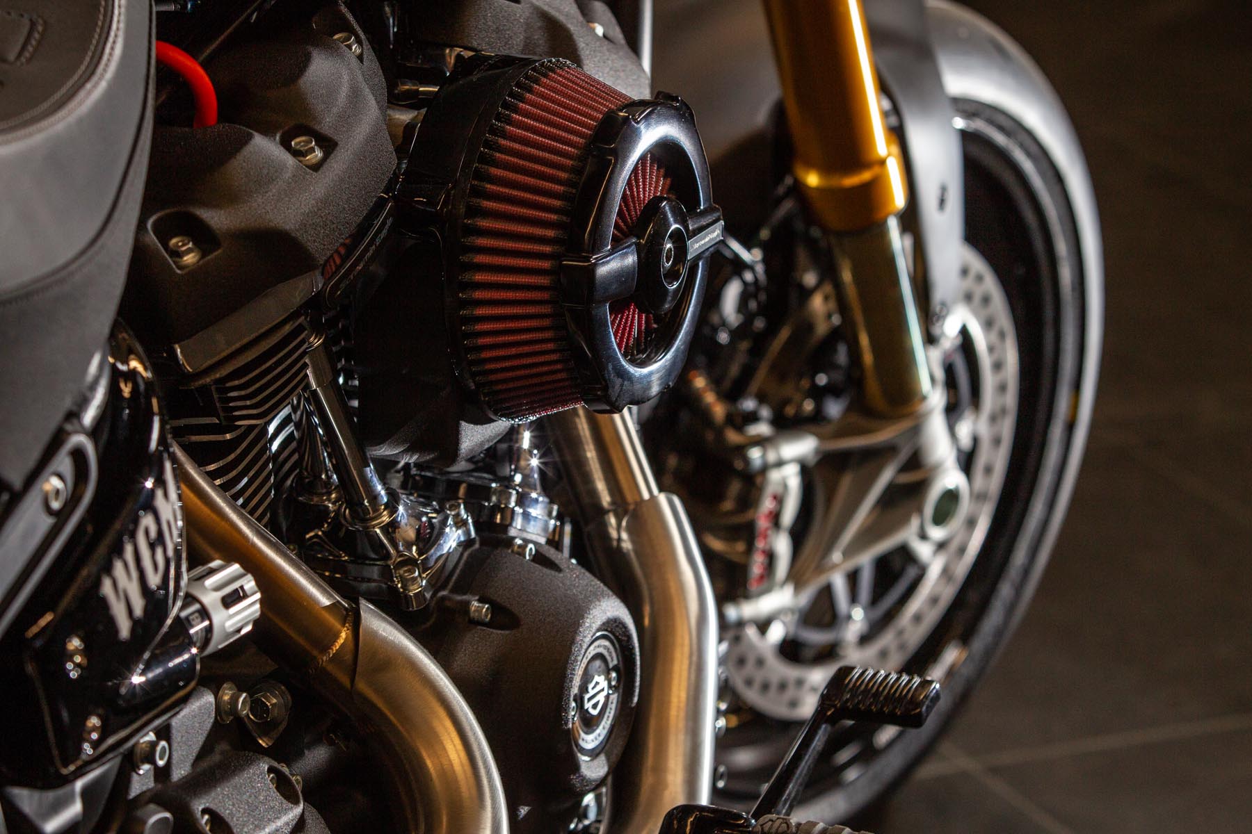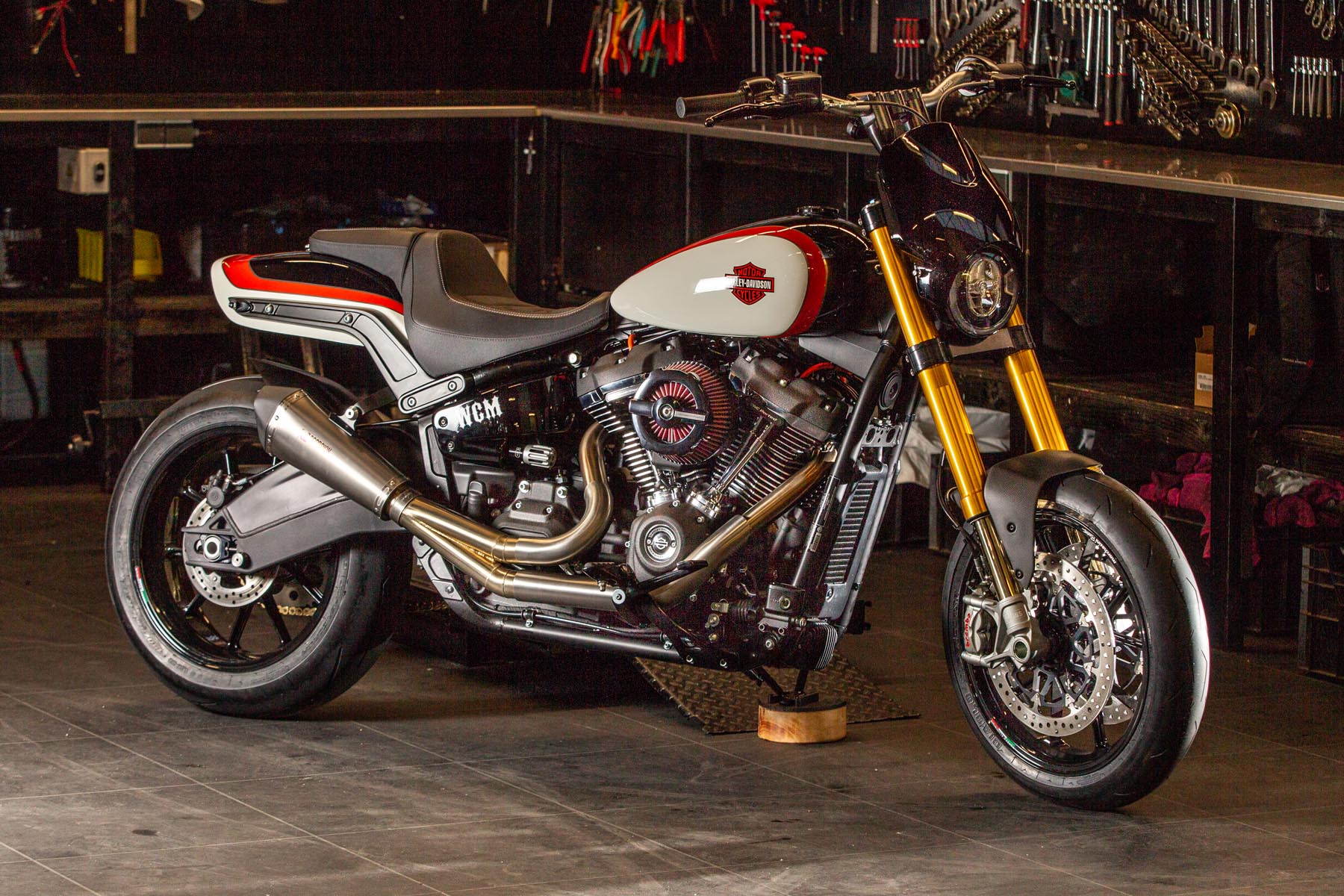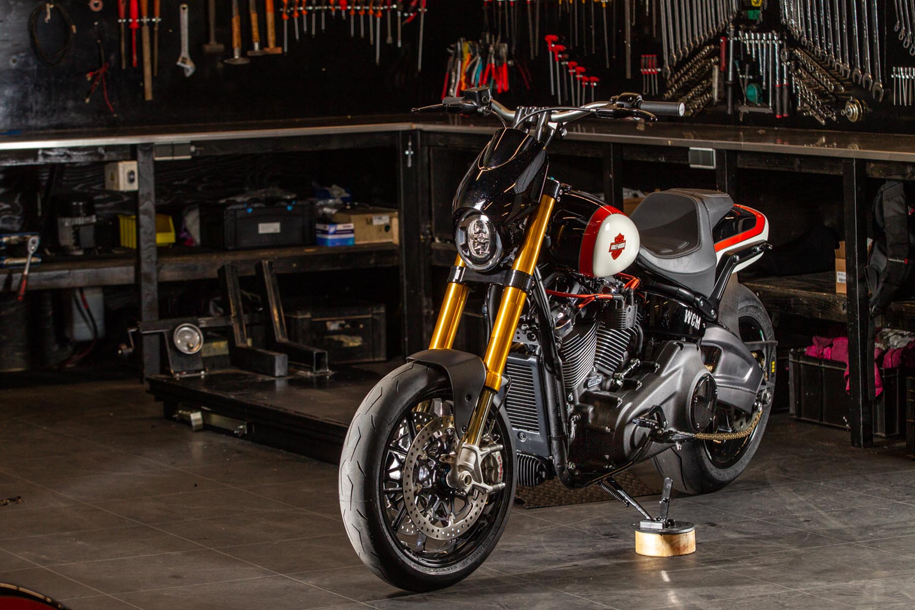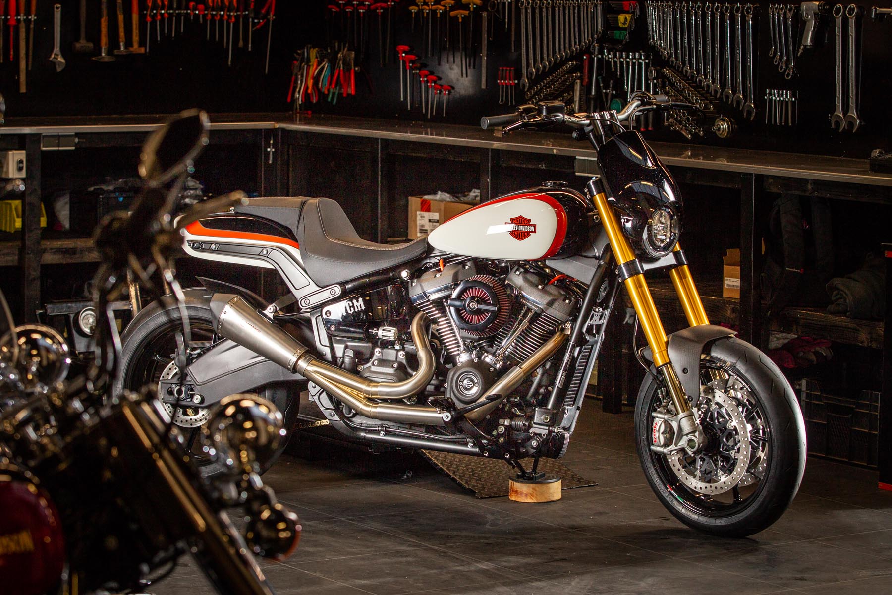 Vervolgens pakte Master Technician Gideon Schüssler het rijwielgedeelte flink aan, waarbij – met behoud van de Fat Bob-lijnen – de grondspeling toenam, het gewicht omlaag ging en er verschillende onderdelen vervangen werden. Zo kreeg de machine een Öhlins upside-down voorvork, een achterbrug van een Superbike en lichtgewicht Marchesini velgen. Om al dat geweld tot stilstand te brengen zetten Brembo Monoblocks hun tanden in 320mm remschijven. De machine kreeg een custom 2-in1-uitlaatsysteem en werd gespoten in de klassieke oranje-wit-zwarte Harley-racekleuren. Bas Leek, met nauwelijks verholen trots: ‘Al met al staat er een beest van een motor waar ik heel veel plezier van ga hebben en waarvan ik overtuigd ben dat mijn klanten hem ook geweldig vinden. En als het publiek en de jury van de Battle of the Kings hem ook op waarde weten te schatten moeten we weer een heel eind kunnen komen dit jaar!’