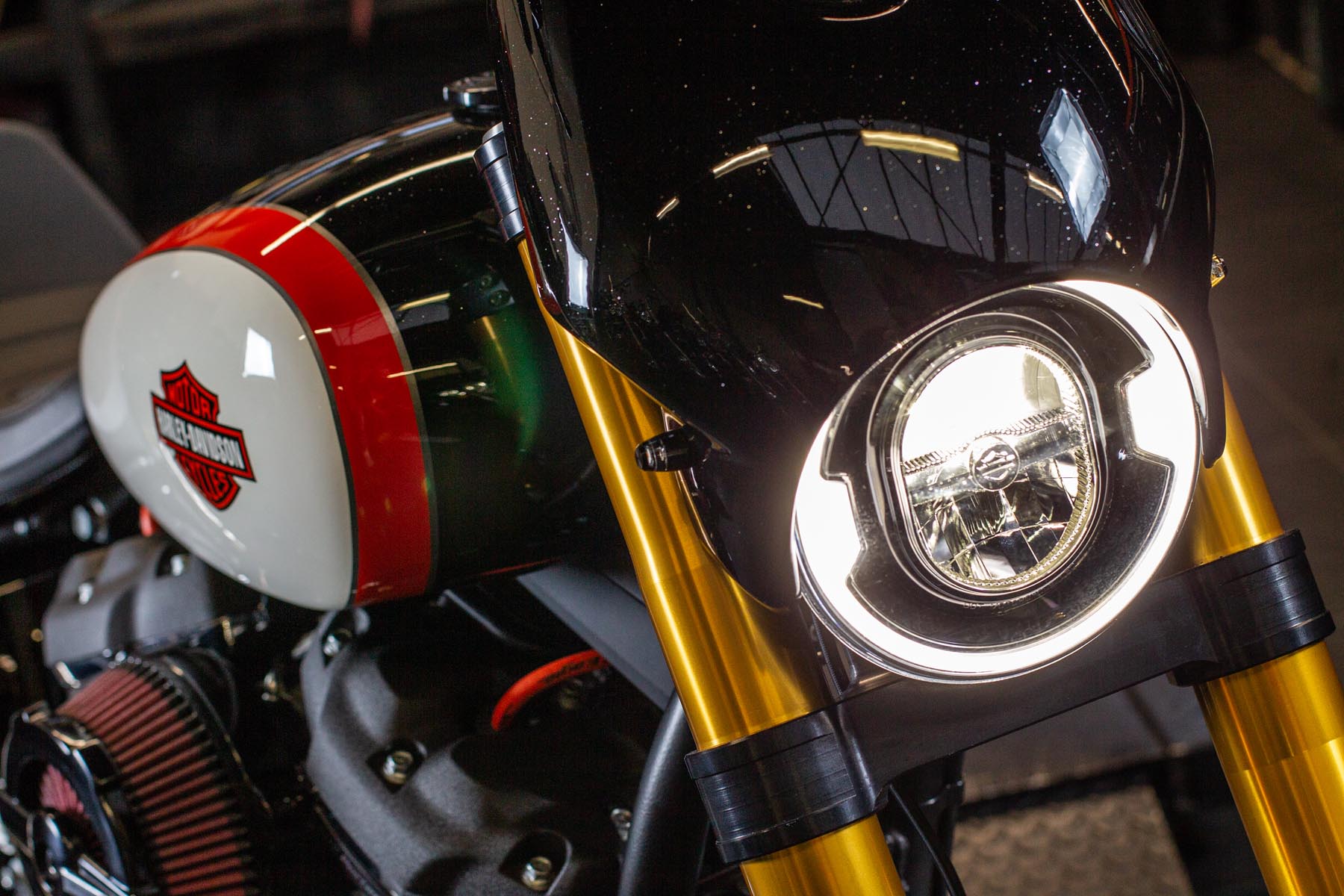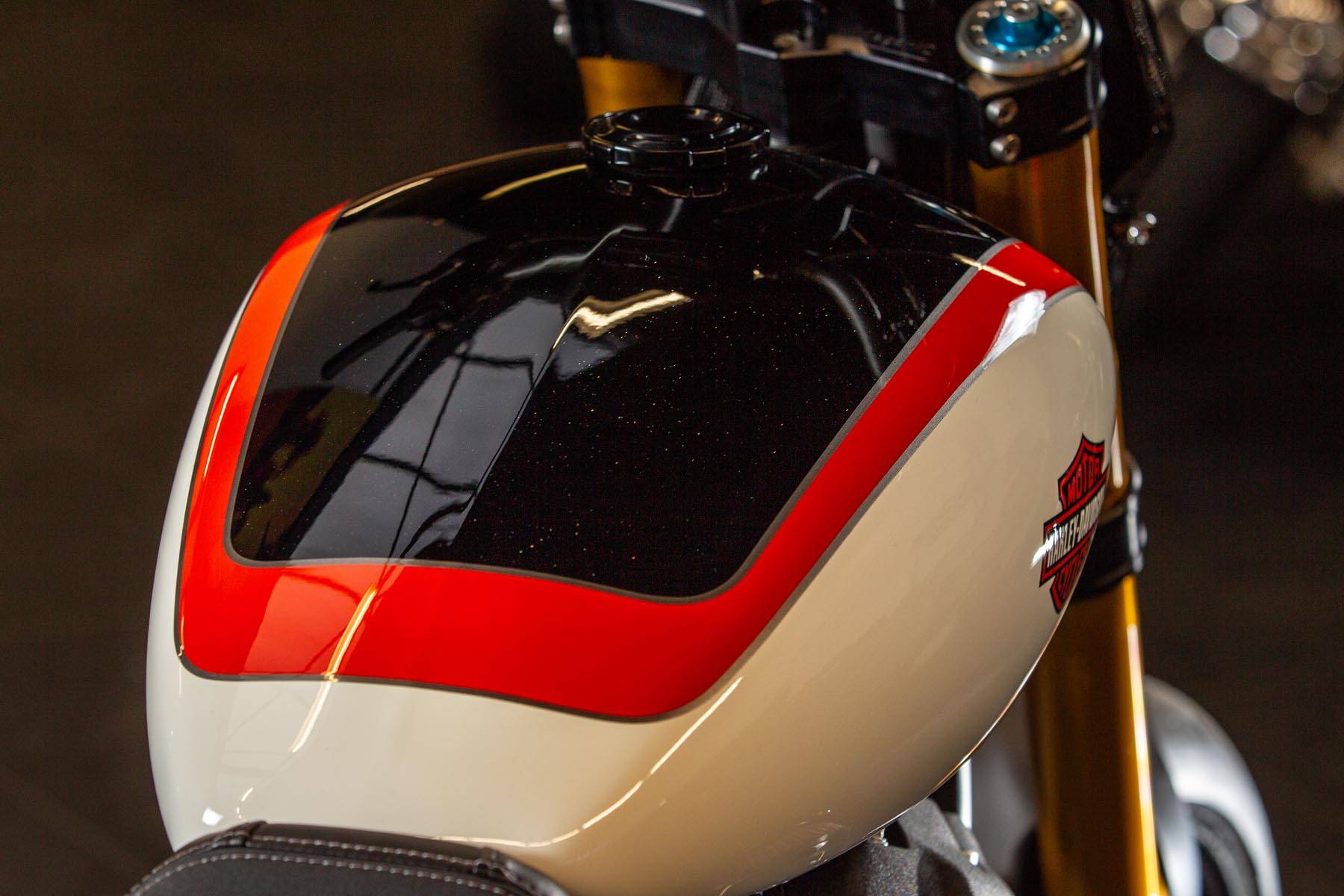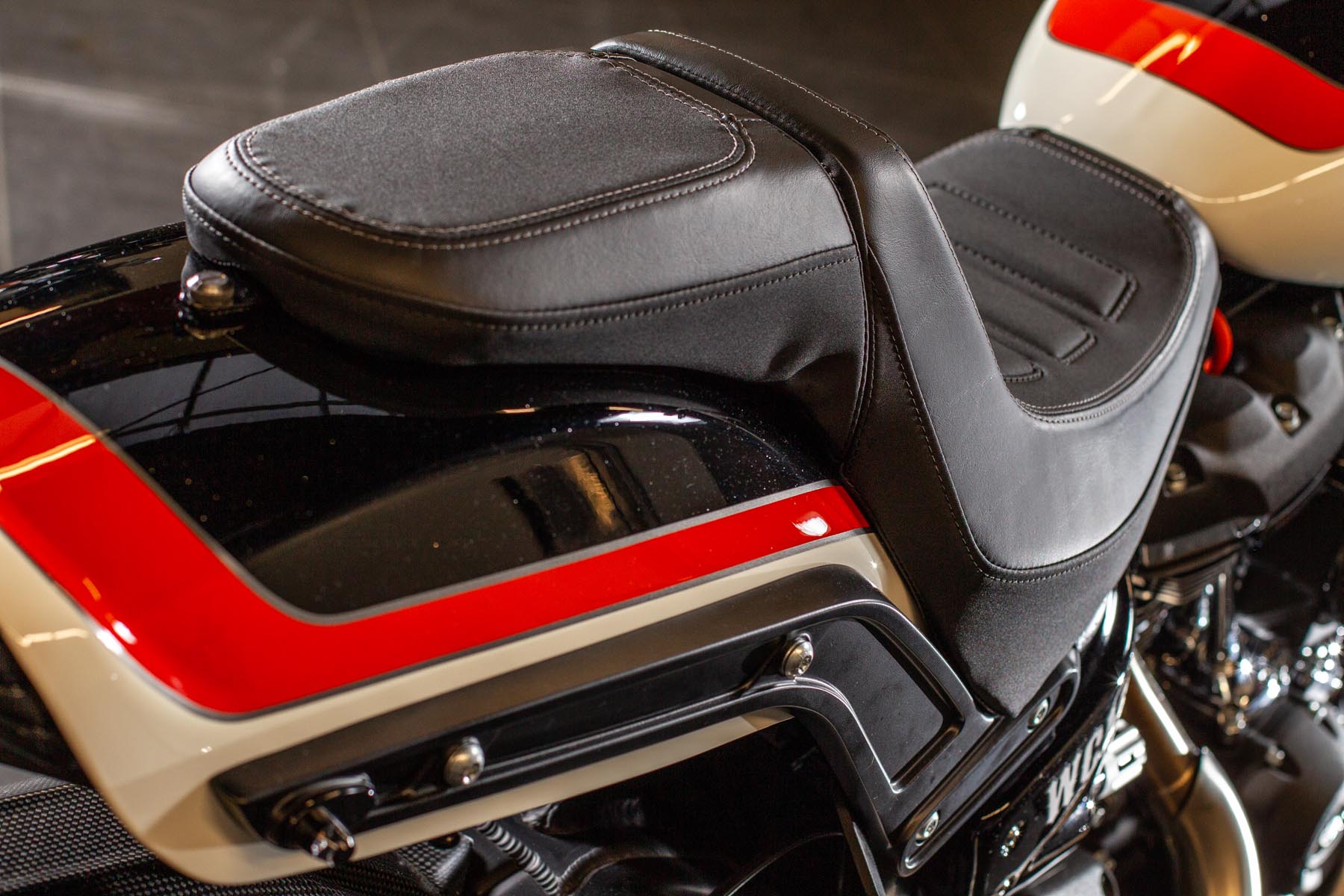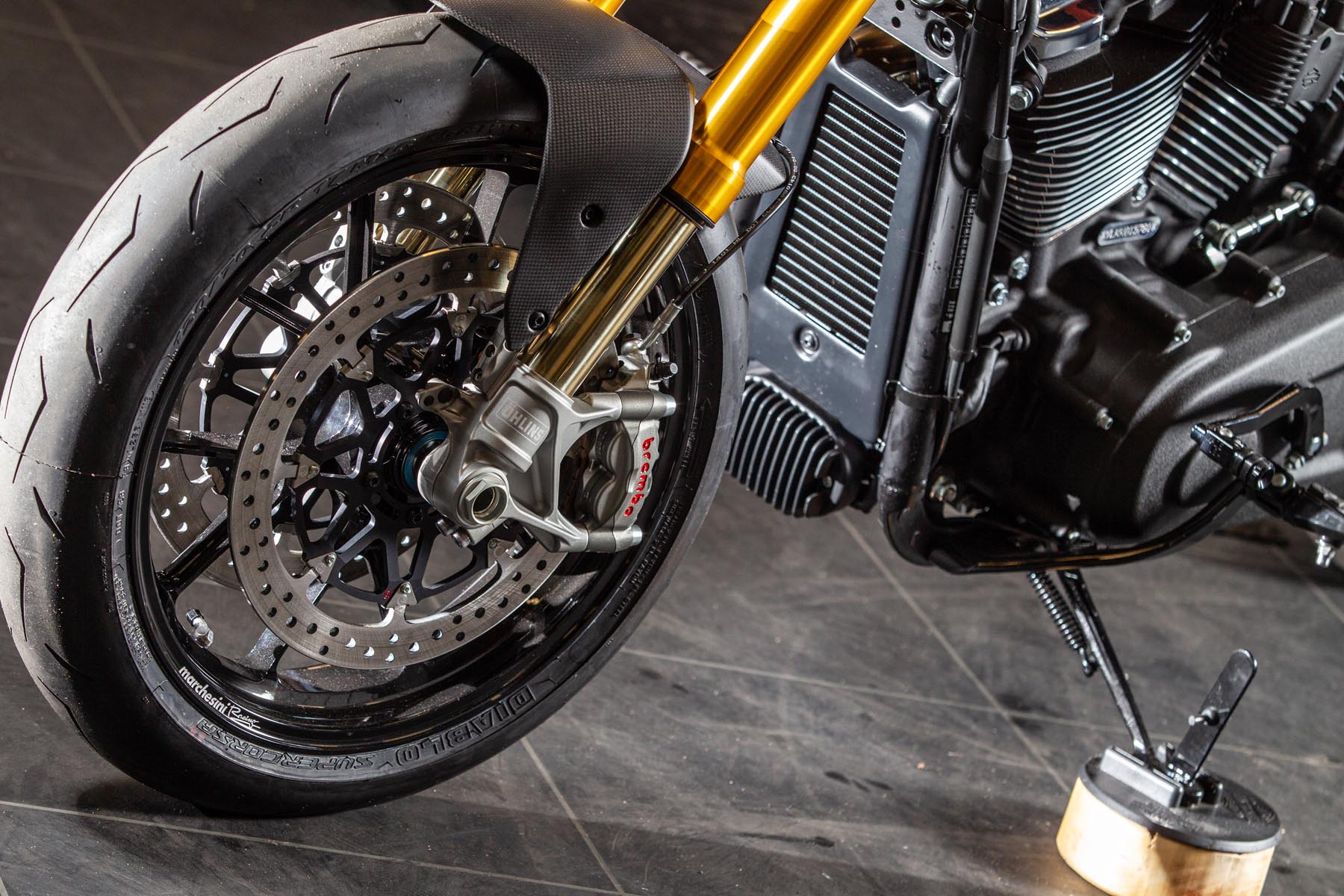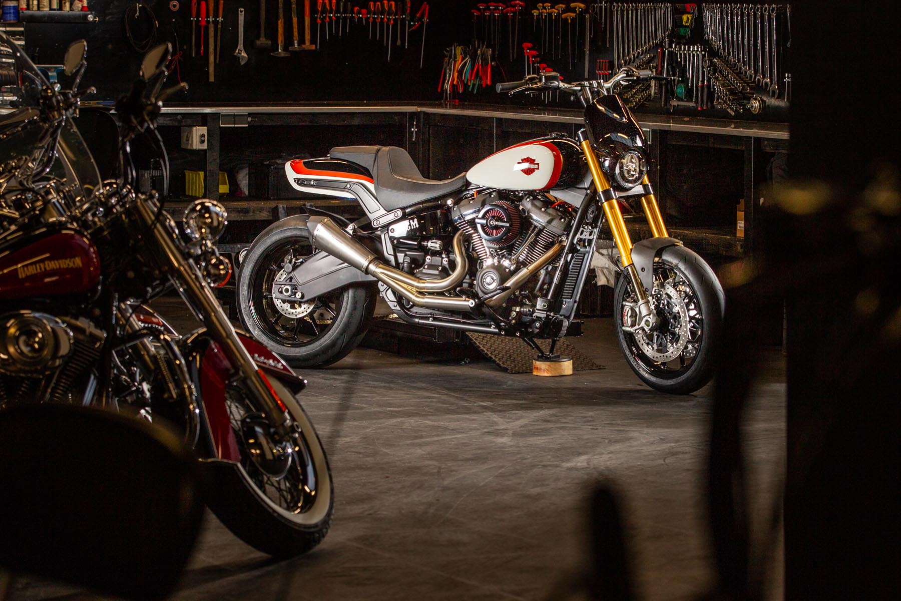 Vervolgens pakte Master Technician Gideon Schüssler het rijwielgedeelte flink aan, waarbij – met behoud van de Fat Bob-lijnen – de grondspeling toenam, het gewicht omlaag ging en er verschillende onderdelen vervangen werden. Zo kreeg de machine een Öhlins upside-down voorvork, een achterbrug van een Superbike en lichtgewicht Marchesini velgen. Om al dat geweld tot stilstand te brengen zetten Brembo Monoblocks hun tanden in 320mm remschijven. De machine kreeg een custom 2-in1-uitlaatsysteem en werd gespoten in de klassieke oranje-wit-zwarte Harley-racekleuren. Bas Leek, met nauwelijks verholen trots: ‘Al met al staat er een beest van een motor waar ik heel veel plezier van ga hebben en waarvan ik overtuigd ben dat mijn klanten hem ook geweldig vinden. En als het publiek en de jury van de Battle of the Kings hem ook op waarde weten te schatten moeten we weer een heel eind kunnen komen dit jaar!’