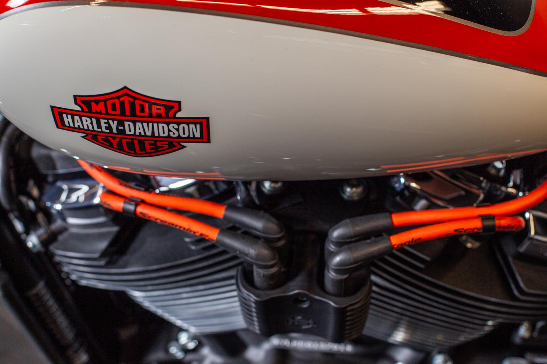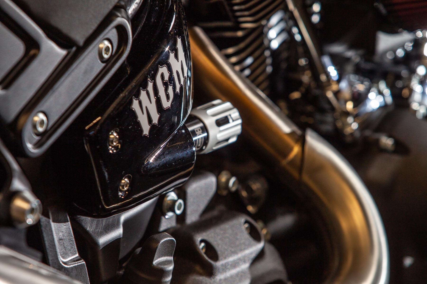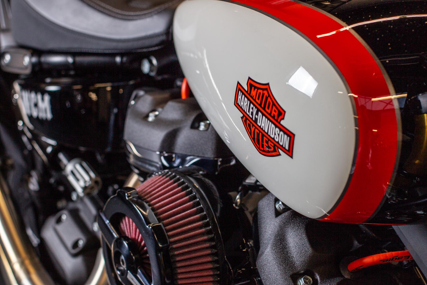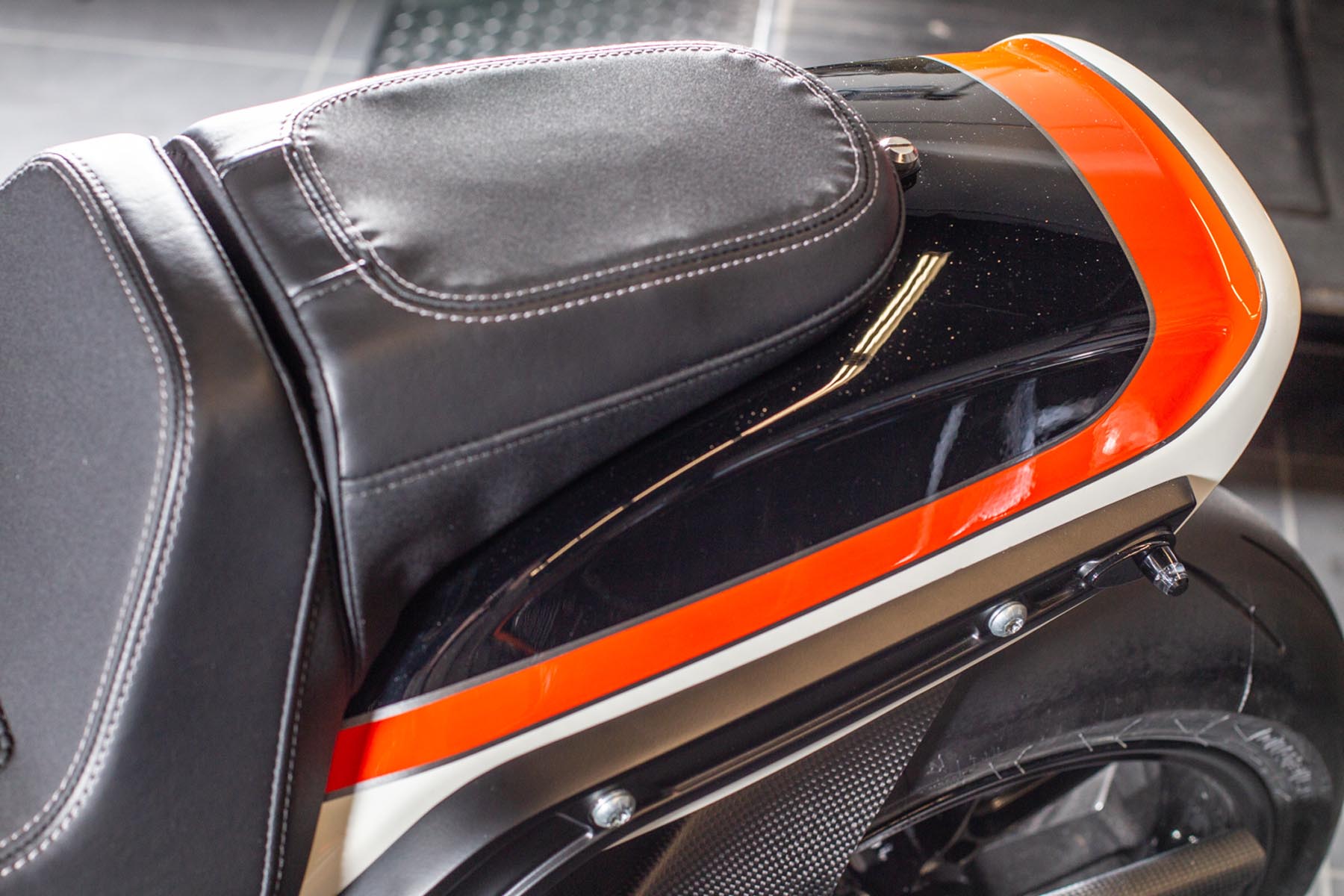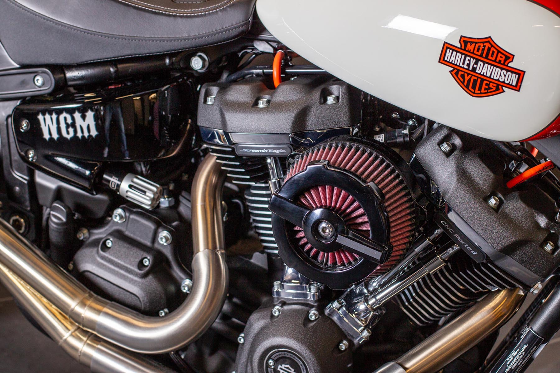 Vervolgens pakte Master Technician Gideon Schüssler het rijwielgedeelte flink aan, waarbij – met behoud van de Fat Bob-lijnen – de grondspeling toenam, het gewicht omlaag ging en er verschillende onderdelen vervangen werden. Zo kreeg de machine een Öhlins upside-down voorvork, een achterbrug van een Superbike en lichtgewicht Marchesini velgen. Om al dat geweld tot stilstand te brengen zetten Brembo Monoblocks hun tanden in 320mm remschijven. De machine kreeg een custom 2-in1-uitlaatsysteem en werd gespoten in de klassieke oranje-wit-zwarte Harley-racekleuren. Bas Leek, met nauwelijks verholen trots: ‘Al met al staat er een beest van een motor waar ik heel veel plezier van ga hebben en waarvan ik overtuigd ben dat mijn klanten hem ook geweldig vinden. En als het publiek en de jury van de Battle of the Kings hem ook op waarde weten te schatten moeten we weer een heel eind kunnen komen dit jaar!’
