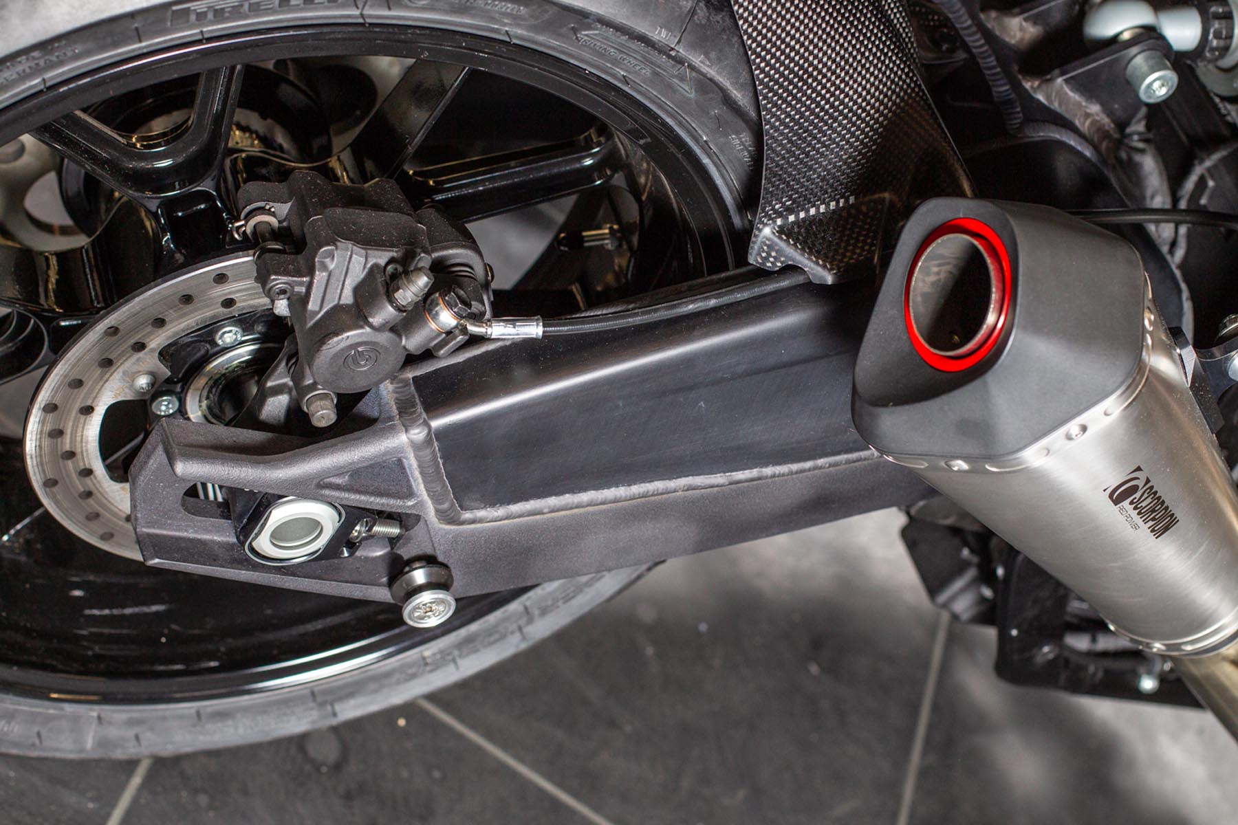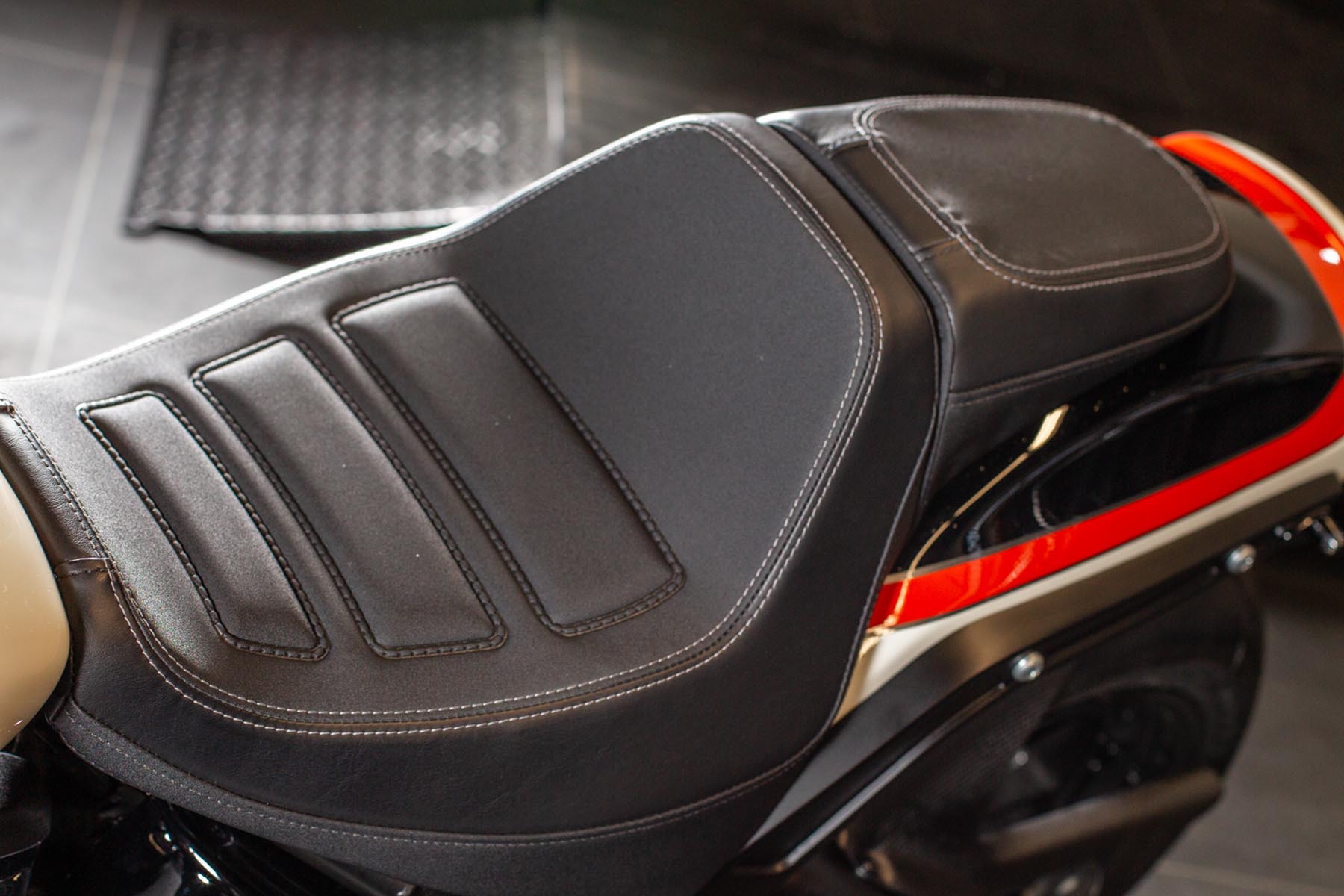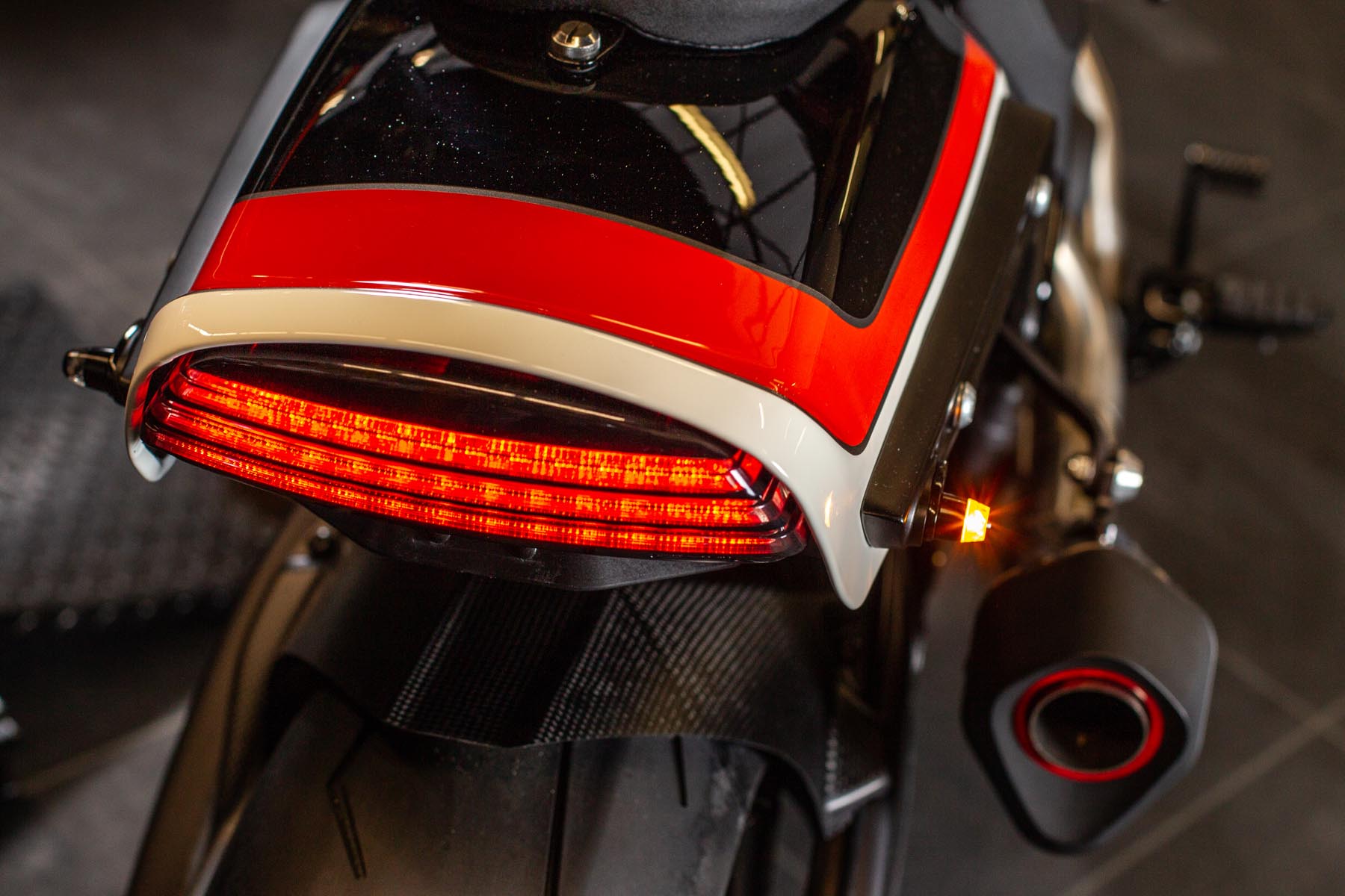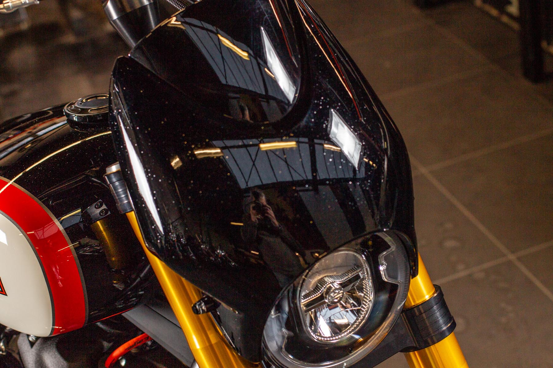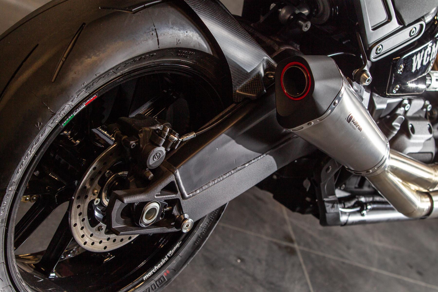 Vervolgens pakte Master Technician Gideon Schüssler het rijwielgedeelte flink aan, waarbij – met behoud van de Fat Bob-lijnen – de grondspeling toenam, het gewicht omlaag ging en er verschillende onderdelen vervangen werden. Zo kreeg de machine een Öhlins upside-down voorvork, een achterbrug van een Superbike en lichtgewicht Marchesini velgen. Om al dat geweld tot stilstand te brengen zetten Brembo Monoblocks hun tanden in 320mm remschijven. De machine kreeg een custom 2-in1-uitlaatsysteem en werd gespoten in de klassieke oranje-wit-zwarte Harley-racekleuren. Bas Leek, met nauwelijks verholen trots: ‘Al met al staat er een beest van een motor waar ik heel veel plezier van ga hebben en waarvan ik overtuigd ben dat mijn klanten hem ook geweldig vinden. En als het publiek en de jury van de Battle of the Kings hem ook op waarde weten te schatten moeten we weer een heel eind kunnen komen dit jaar!’