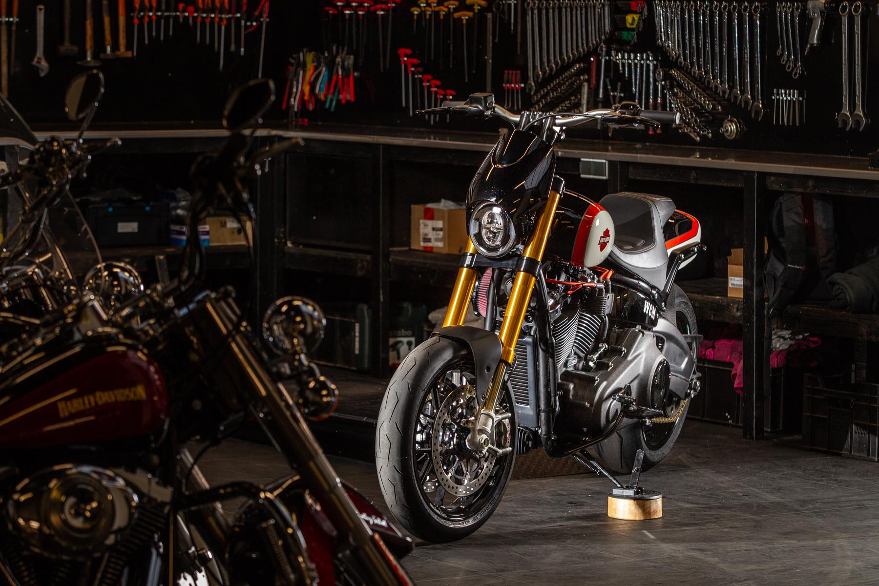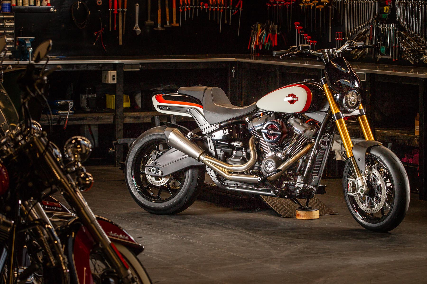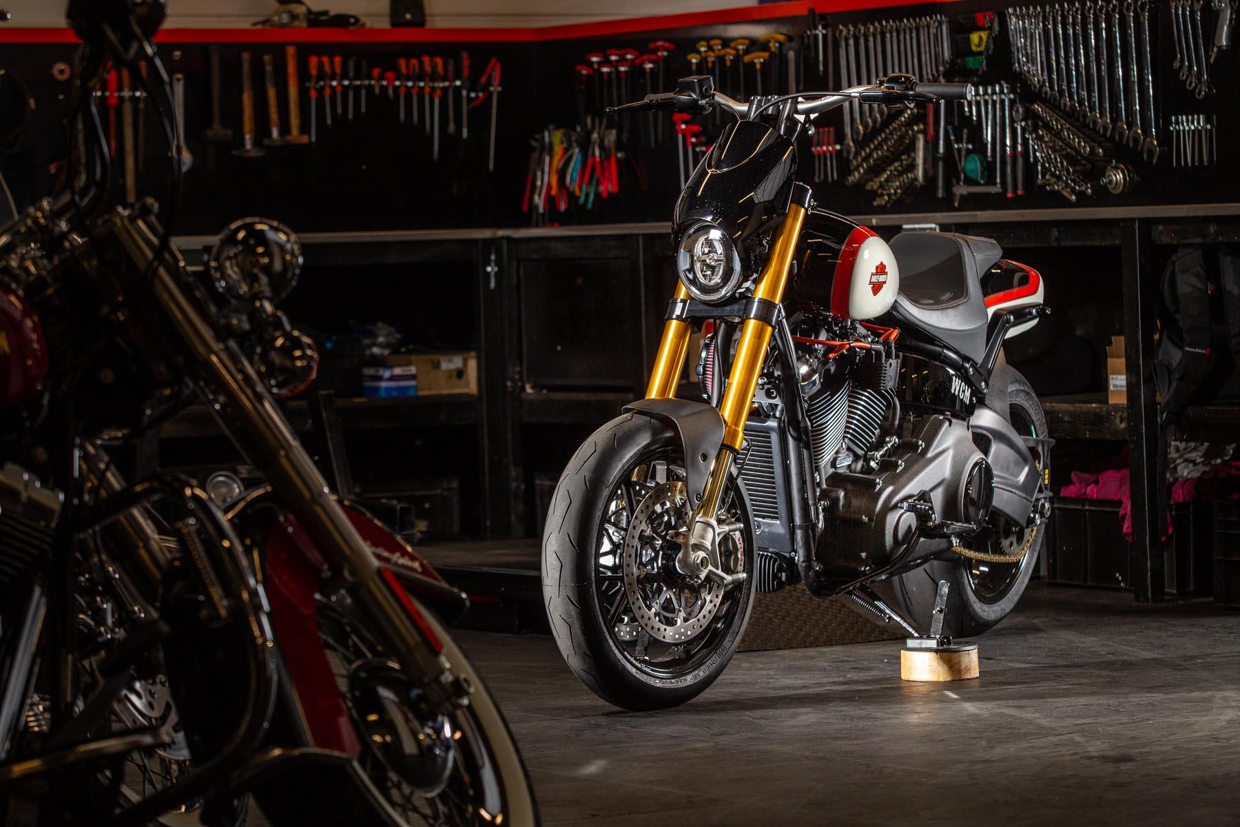 De Alkmaarse H-D dealer West Coast Motors doet een poging voor de eerste plaats met de ‘FXGP’, een custom op basis van een Harley-Davidson Fat Bob 114. Voor het team van West Coast begon het proces met de gedroomde daily driver van eigenaar Bas Leek. Hij vertelt: ‘Ik liep al een tijdje met het plan om voor mezelf een zeer sportieve Fat Bob te bouwen. Het moest een motorfiets worden waarop je zowel comfortabel kilometers kan maken, als waarmee je op het circuit serieus je mannetje kan staan. Die ambitie kon ik mooi combineren met de Battle of the Kings.’ Als basis koos hij voor een Fat Bob 114, die onderhuids een flinke upgrade kreeg tot 128 cubic inch (2097cc). Het blok levert 152pk op het achterwiel en 220 Nm koppel.