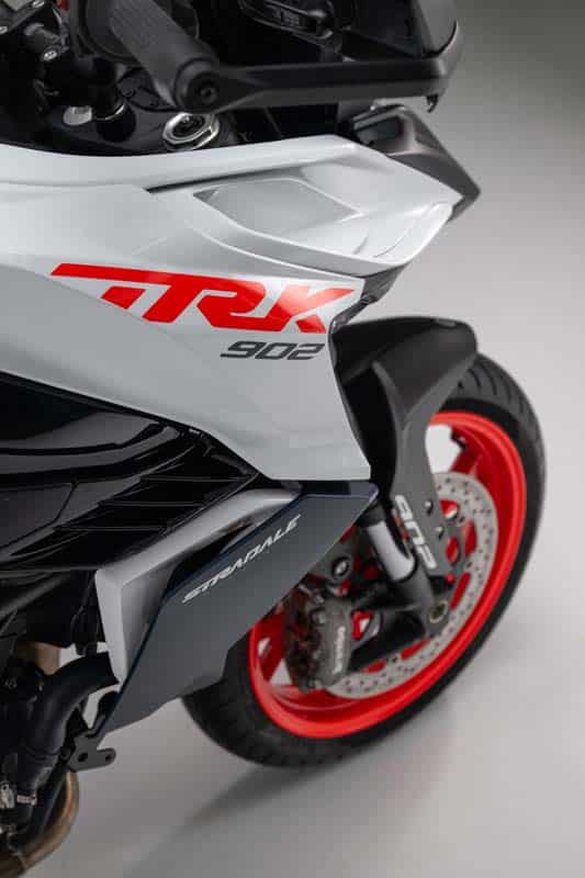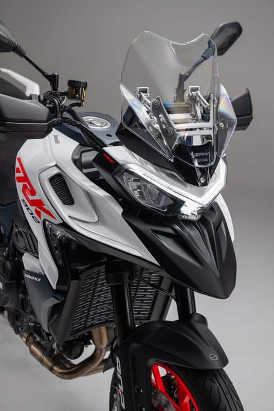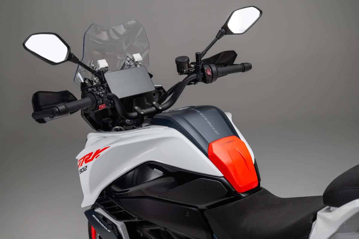 De TRK 902 Stradale deelt zijn technische basis met de Xplorer, maar is volledig afgestemd op de langeafstandrijder die asfalt verkiest boven grind. De 904 cc twin levert 95 pk en 90 Nm koppel, goedgekeurd volgens Euro 5+ norm. Met een elektrisch verstelbaar windscherm, 17-inch lichtmetalen velgen met Pirelli Angel GT II-banden en een lagere zithoogte van 805 mm combineert deze machine comfort met verfijnde sportiviteit. Extra overtuigend: elektronische snufjes zoals een 7-inch TFT-display, cruise control, quickshifter en verwarmde handvatten en zadel maken elke reis aangenamer. Dit is de expressie van moeiteloze elegantie op twee wielen.