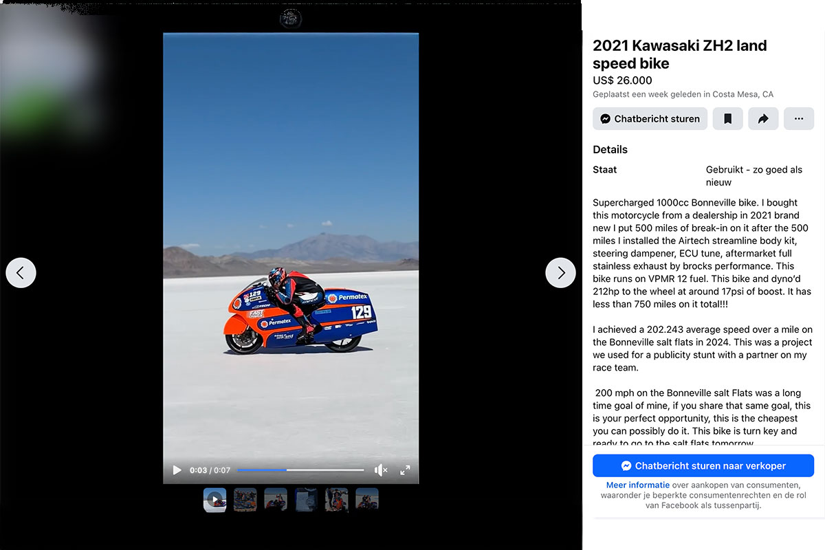 Op Facebook Marketplace (gesloten groep) verschijnt niet dagelijks een motorfiets die snelheidsgeschiedenis heeft geschreven. Toch staat daar sinds 14 januari 2026 een Kawasaki ZH2 te koop die tijdens de Bonneville Speed Week van 2024 een gemiddelde snelheid van 202,243 mph – omgerekend 325 km/u – over één mijl wist te halen. De vraagprijs: $26.000, wat neerkomt op circa €22.500. De kilometerstand: amper 1.200 kilometer. Voor wie een doorsnee tweedehands motor zoekt, is dit natuurlijk niet de juiste advertentie. Maar voor verzamelaars, snelheidsfreaks of liefhebbers van technische buitenbeentjes opent zich hier een zeldzame kans. De vraag die zich opdringt is niet zozeer óf deze machine bijzonder is – dat staat buiten kijf – maar eerder waarom iemand zo’n gedocumenteerd stukje motorgeschiedenis zou willen verkopen. En belangrijker nog: rechtvaardigt een recordprestatie op zout een meerprijs van pakweg €10.000 ten opzichte van een vergelijkbare gebruikte ZH2?