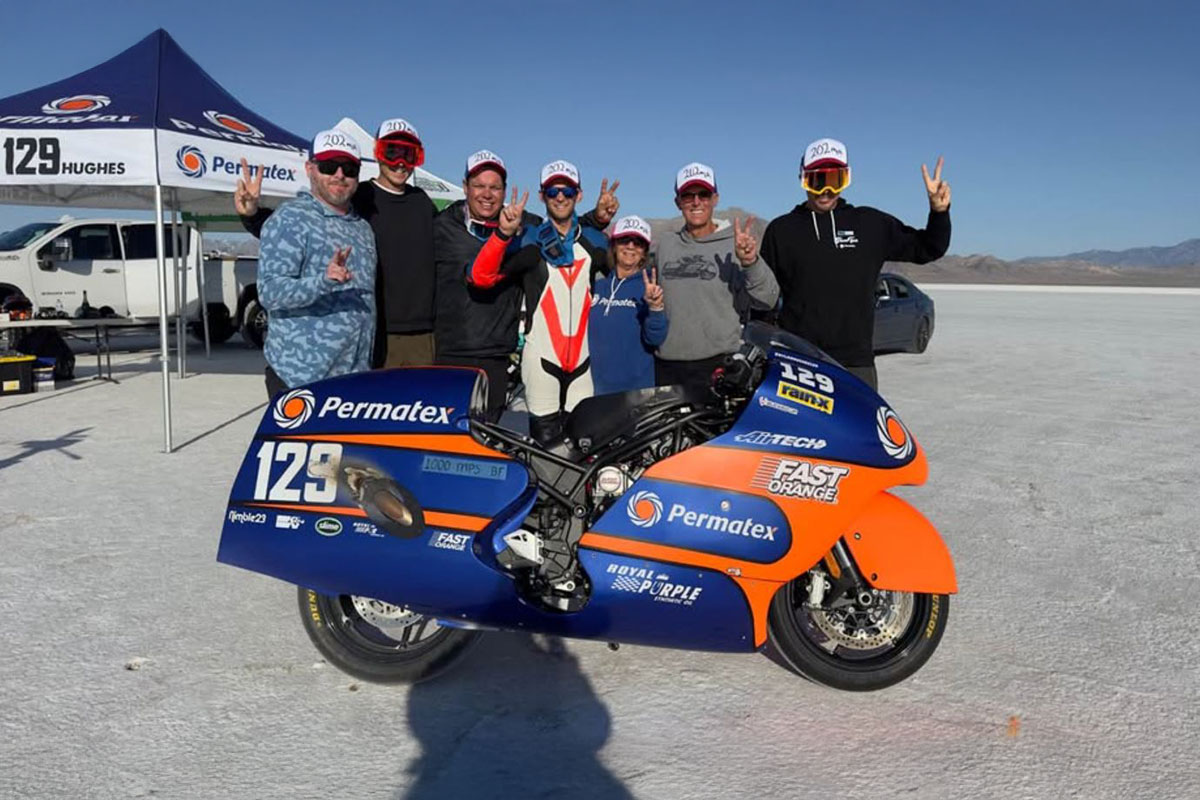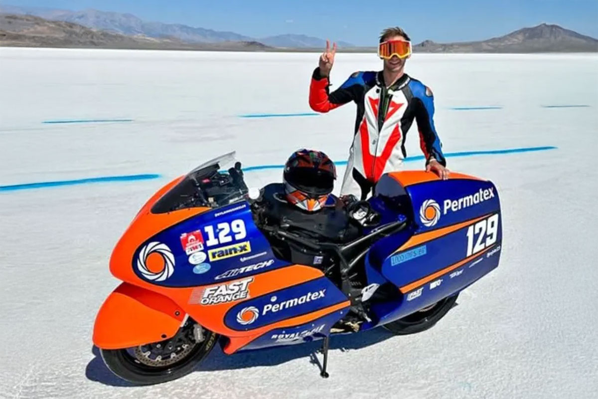 Daarnaast werd een stuurdemper geïnstalleerd – onmisbaar bij snelheden waar zelfs de kleinste instabiliteit fataal kan zijn – samen met een volledig uitlaatsysteem van Brock’s Performance, een merk dat zijn sporen heeft verdiend in de dragrace- en landspeedwereld. Brock’s Performance, opgericht door de bekende dragrace-specialist Brock Davidson, staat bekend om uitlaatsystemen die niet alleen vermogen vrijmaken maar ook betrouwbaar blijven onder extreme belasting. ECU kreeg vervolgens een op maat gemaakte tuning, specifiek afgestemd op de belasting en het verbruik tijdens recordpogingen. Dit is geen generieke flashtuning via een website, maar maatwerk dat rekening houdt met brandstofkwaliteit, luchtdichtheid op 1.286 meter hoogte – Bonneville ligt niet op zeeniveau – en de specifieke belasting van langdurige vollastlooppunten.