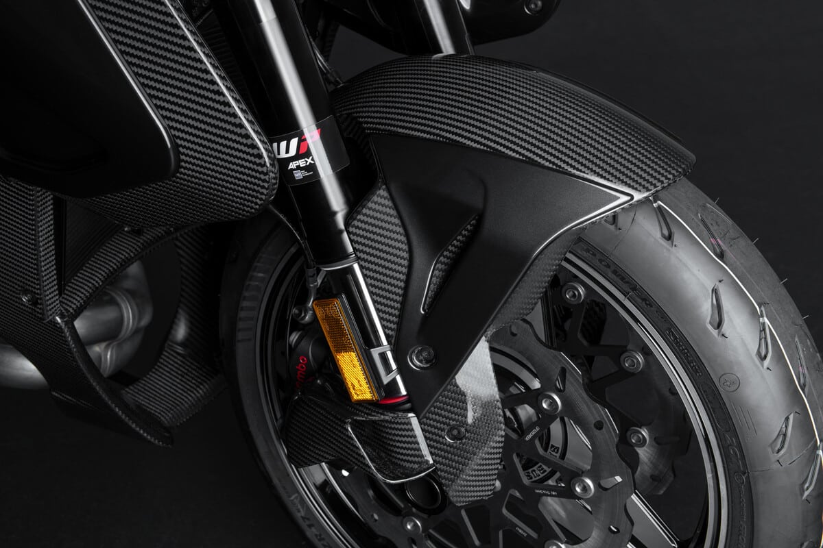 De BRABUS 1400 R maakt gebruik van de 1.350cc LC8 V-twin van KTM, goed voor 190 pk en 145 Nm koppel. De dubbele uitlaat onder het zadel draagt bij aan zowel het uiterlijk als het geluid van de motor. De 17-inch BRABUS Monoblock II EVO ‘Platinum Edition’-velgen zijn vervaardigd via CNC-techniek en zorgen volgens de fabrikant voor een laag gewicht en verbeterde stabiliteit.