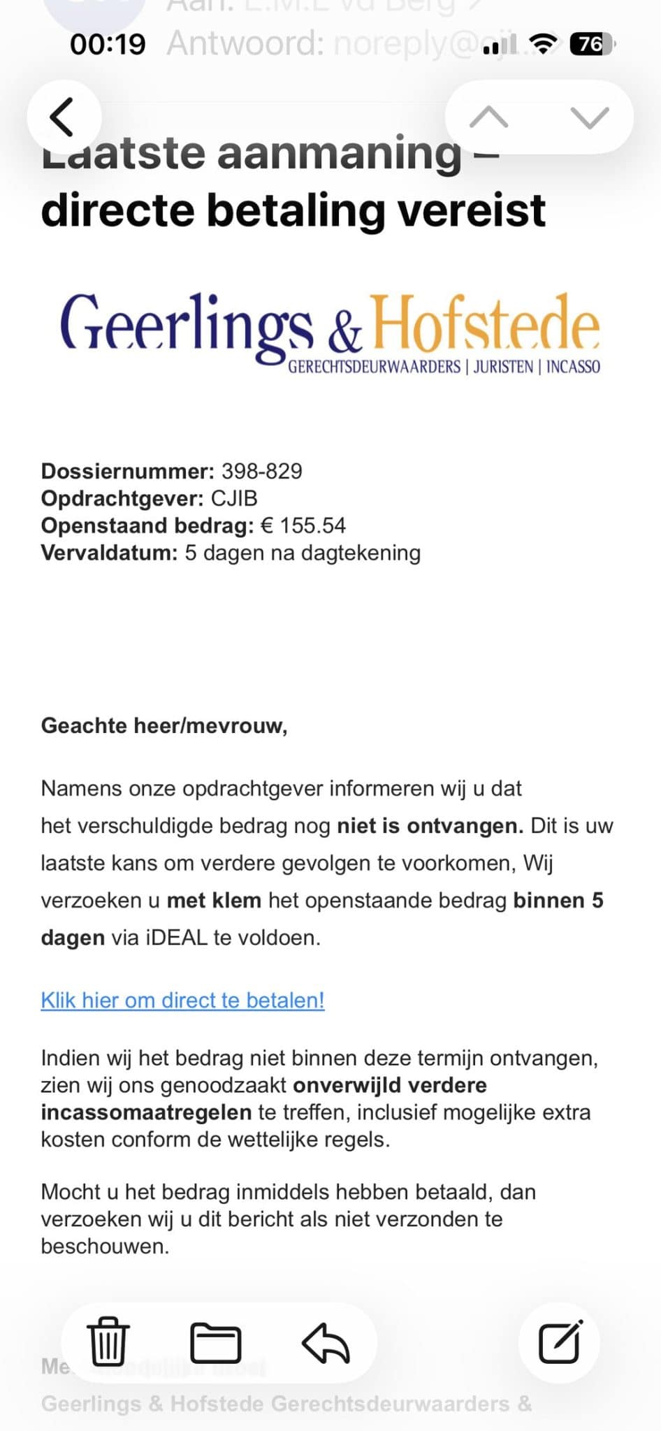 In de mail wordt dringend gevraagd om binnen vijf dagen 155,54 euro over te maken. Maar net als een onbekende bocht in de regen, is dit er eentje om met beleid te nemen. De echte Geerlings & Hofstede waarschuwt op hun website zelf: dit is nep.
