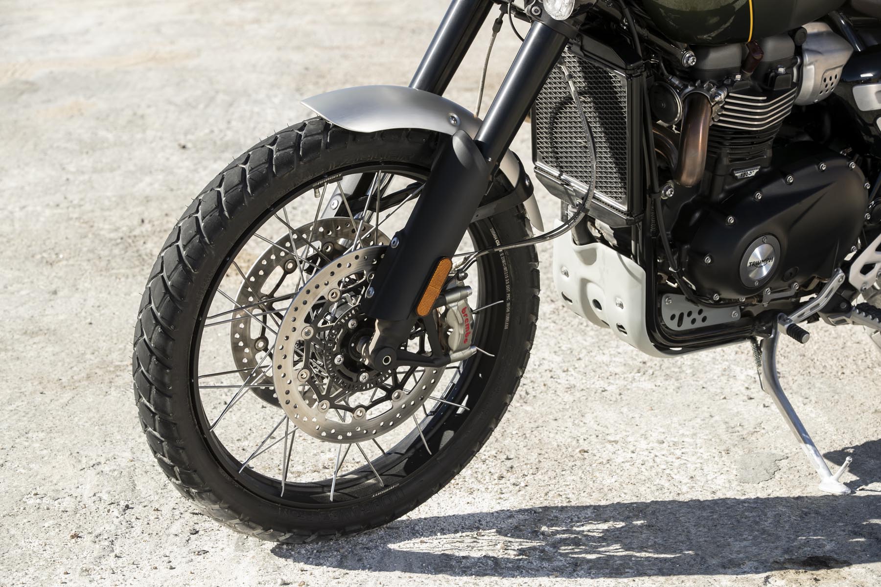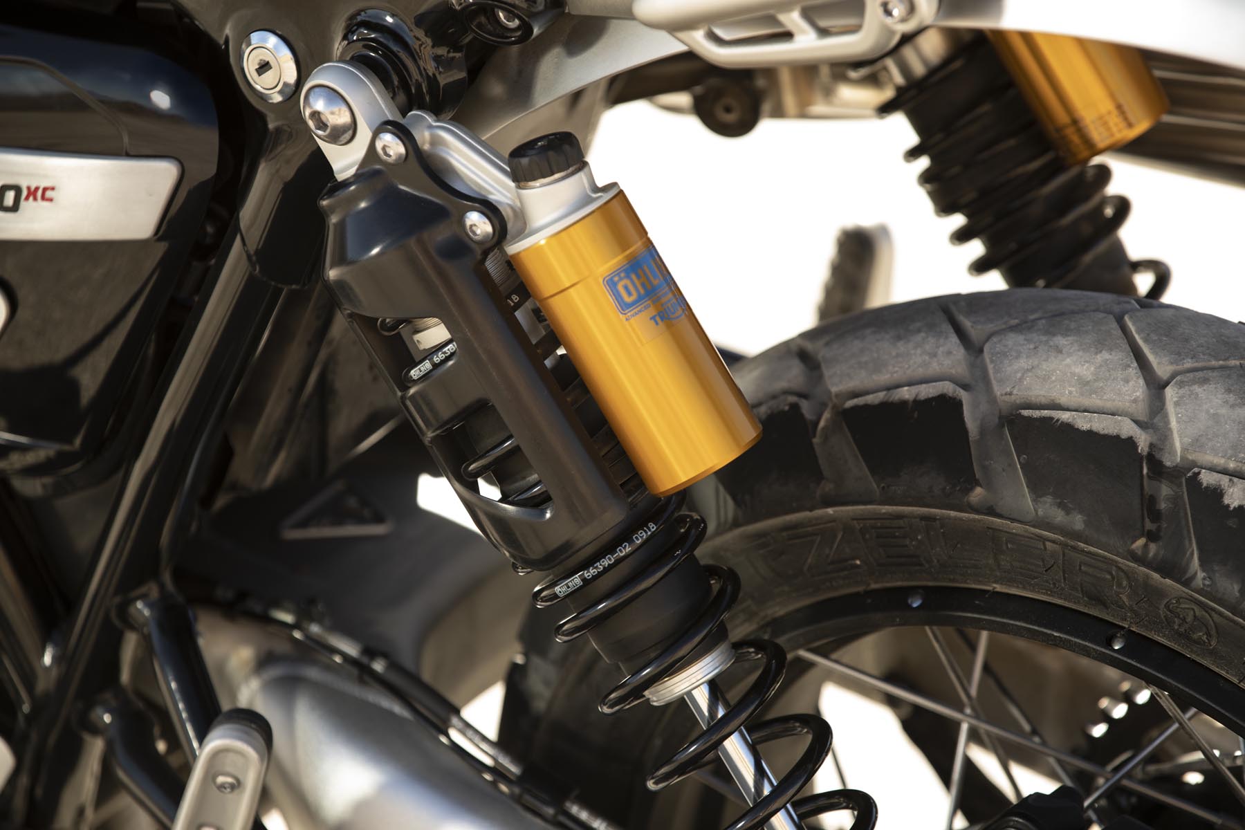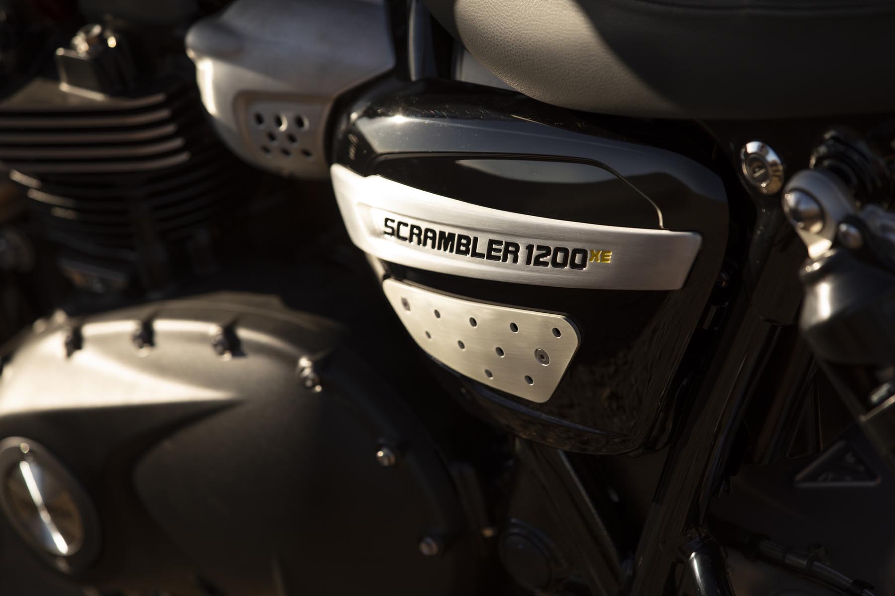 Ook het rijwielgedeelte mag er zijn. De achtervering is in handen van volledig instelbare Öhlins achterschokbrekers. Aan de voorzijde is een volledig instelbare Showa voorvork met lange veerwegen aan het werk. En wat te denken van de remmen: dubbele, radiale M50 Monobloc remklauwen van Brembo. De aluminium swingarm heeft een lange veerweg en de opklapbare voetsteunen zijn op de XE versie – optie – verder in te stellen. Beide modellen hebben gespaakte wielen. En voor zit een – opzienbarend! – 21 inch velg. De Scramblers zijn geschoeid met Pirelli Scorpion Rally banden.