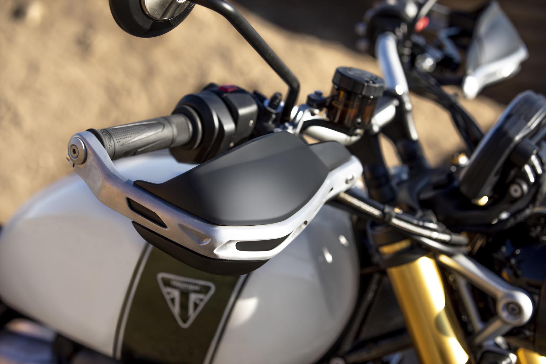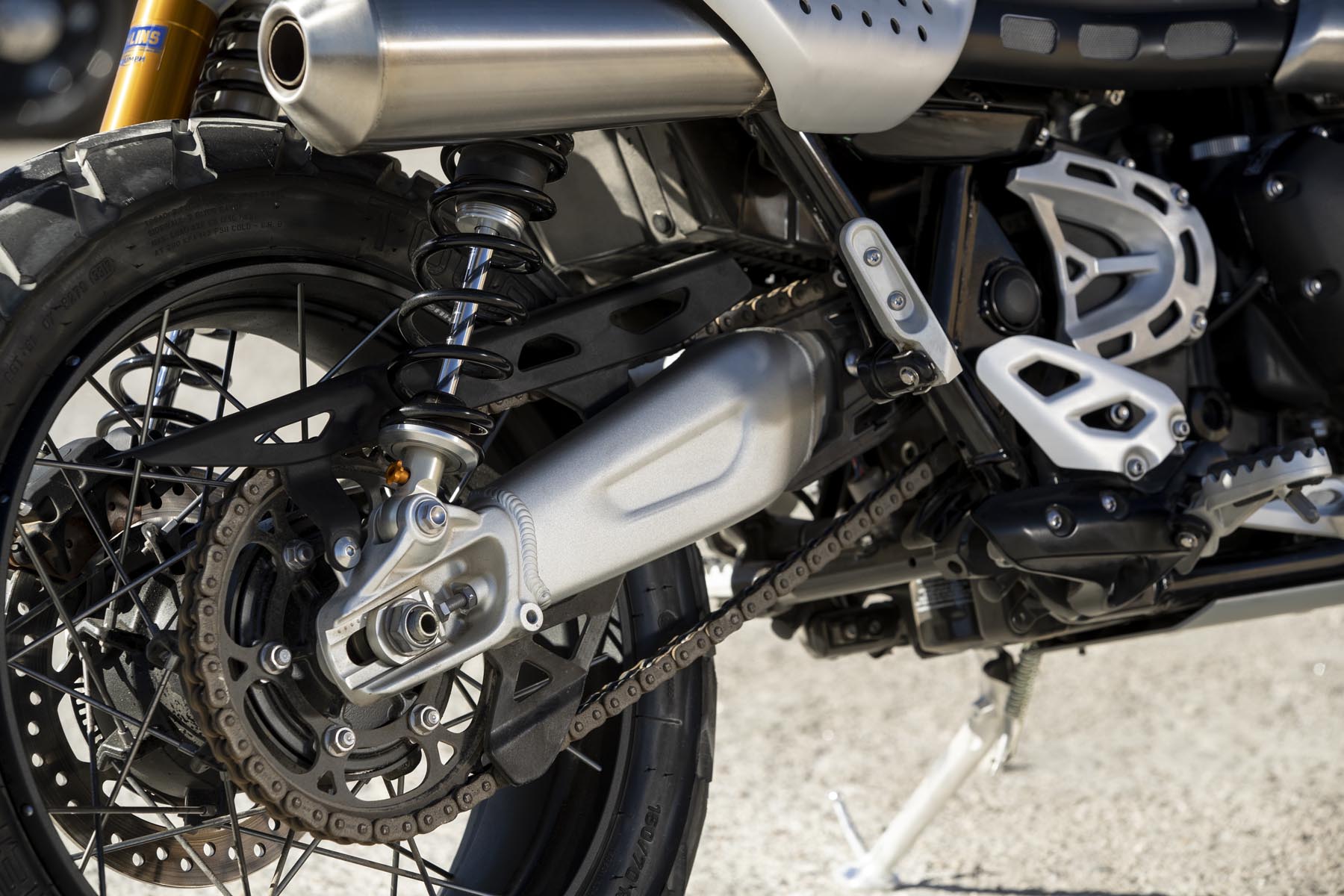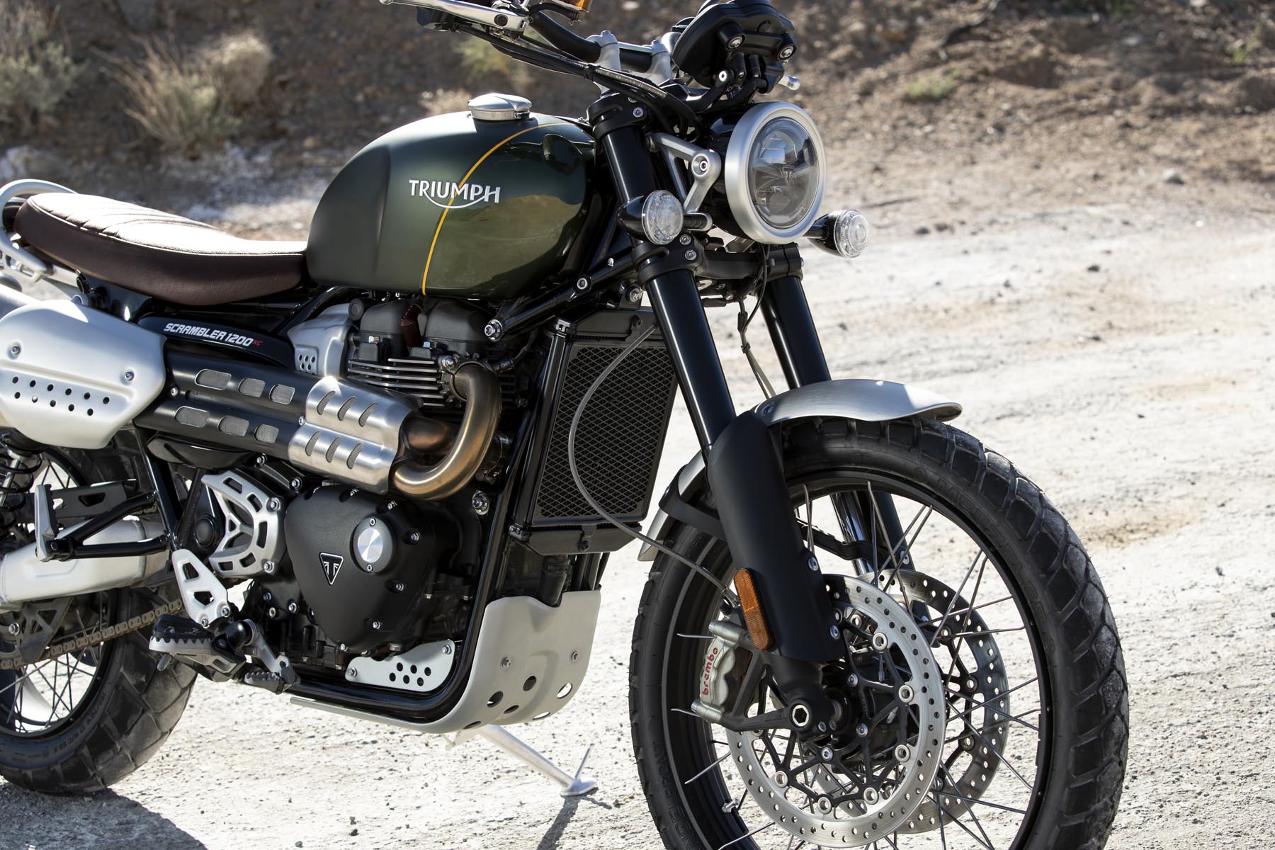 Ook het rijwielgedeelte mag er zijn. De achtervering is in handen van volledig instelbare Öhlins achterschokbrekers. Aan de voorzijde is een volledig instelbare Showa voorvork met lange veerwegen aan het werk. En wat te denken van de remmen: dubbele, radiale M50 Monobloc remklauwen van Brembo. De aluminium swingarm heeft een lange veerweg en de opklapbare voetsteunen zijn op de XE versie – optie – verder in te stellen. Beide modellen hebben gespaakte wielen. En voor zit een – opzienbarend! – 21 inch velg. De Scramblers zijn geschoeid met Pirelli Scorpion Rally banden.