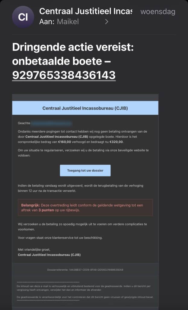 Na eerdere valse CJIB-mails uit naam van ‘Geerlings & Hofstede’ zijn er opnieuw oplichtingspogingen. Veel mensen, waaronder onze collega Maikel, hebben de afgelopen dagen een valse e-mail ontvangen over een achterstallige betaling. Dit keer zou het CJIB ‘zelf’ een aanmaning hebben gestuurd. Ook het programma Opgelicht?! heeft meerdere meldingen ontvangen en besteedt aandacht aan dit probleem, inclusief handige tips.