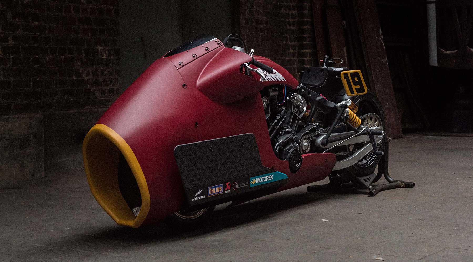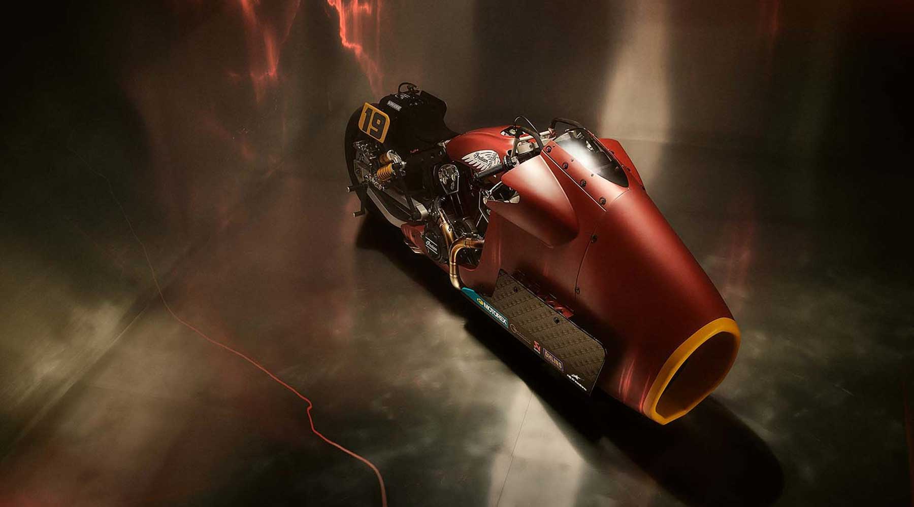 Andere interessante zaken om bij stil te staan: de gewijzigde brandstoftank. Die is smaller gemaakt zonder de originele vorm aan te tasten. De tank bevat nu slechts 2,5 liter brandstof. Da’s genoeg voor een snelle dragrace. De extra lange swingarm is gekoppeld aan Öhlins-veringsonerdelen, met STX 36 piggyback achterschokdempers en Retro 43-vorken. Dankzij een Akrapovič-uitlaat, een race-ECU, Power Commander, directe inlaat en een kleine NOS, zet de Indian Scout 130 pk op het achterwiel. Om die vermogenstoename te verweken, is de riemaandrijving ingeruild voor een ketting. Ook is er een quickshifter geïnstalleerd om tijdens de race snel te kunnen schakelen. Het remsysteem van Beringer rondt het pakket af, met vier schijven in totaal. Dit helpt om van de IndianxWorkhorse Appaloosa een behoorlijk unieke motorfiets te maken. En met Mamola aan boord mag je verwachten dat de motor vrij snel zal zijn.