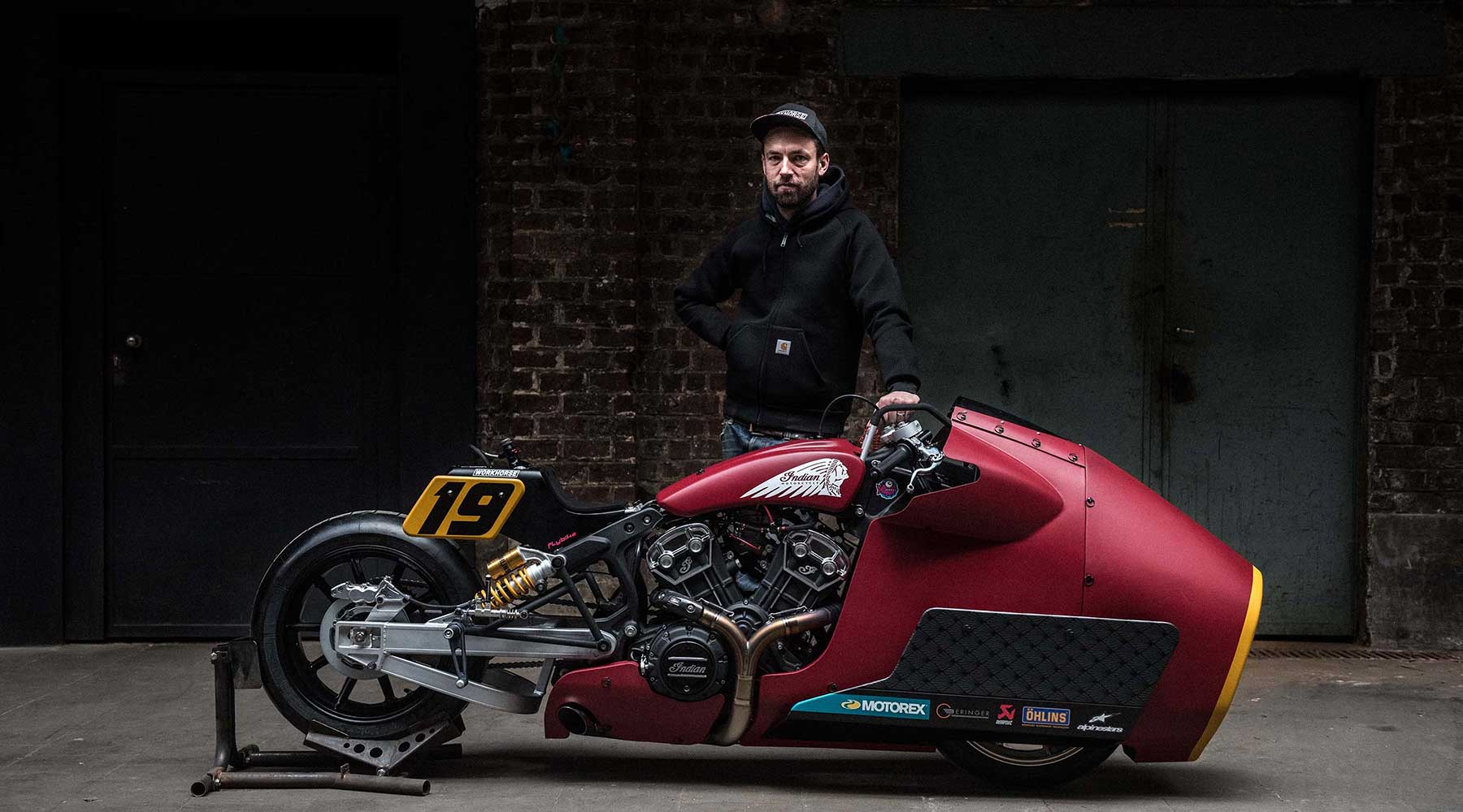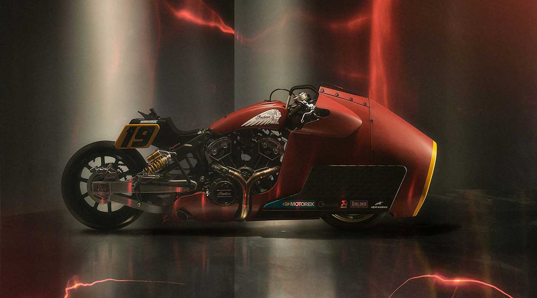 Op de IndianxWorkhorse Scout Bobber dus. Zoals de naam al aangeeft, is het een samenwerking tussen Indian Motorcycle en Workhorse Speedshop. Beide memoreren hiermee dat de Indian Scout 100 jaar geleden werd geïntroduceerd. De motor met de naam Appaloosa zal racen op de komende Sultans of Sprint Series. Met Randy Mamola dus aan het stuur. De custom begon ooit als een gewone Indian Scout Bobber. Daarvan werd de achterbrug afgehakt en ingeruild voor een langere. Rond wat er toen nog stond, werd een enorme vuilnisbak als stroomlijn gehangen.