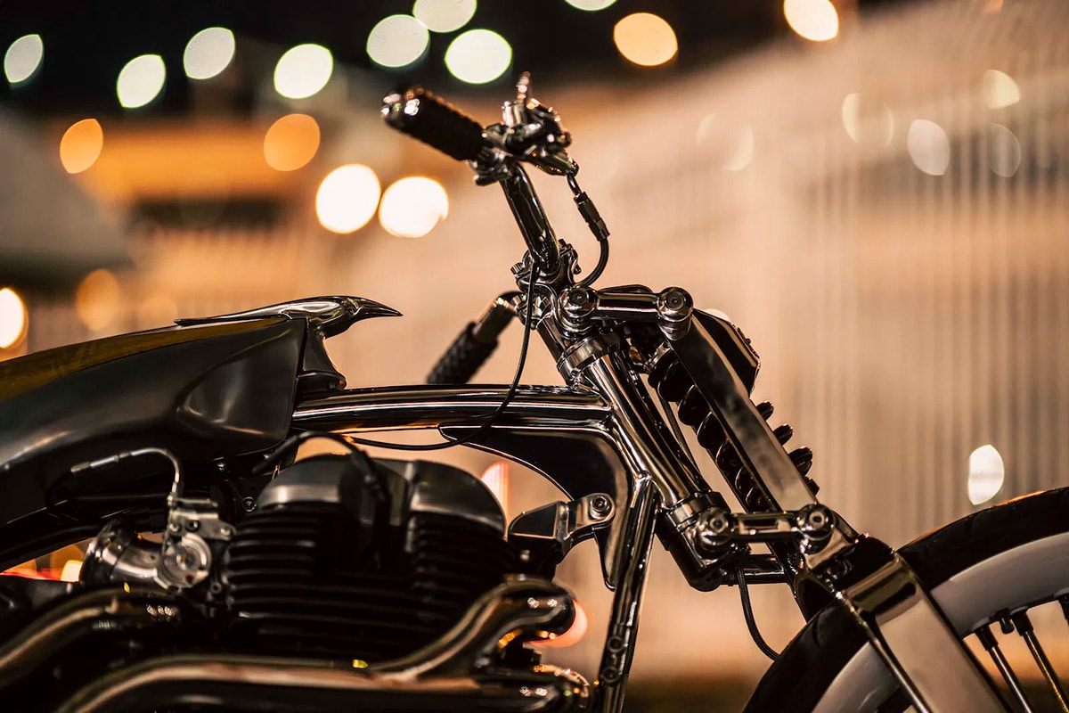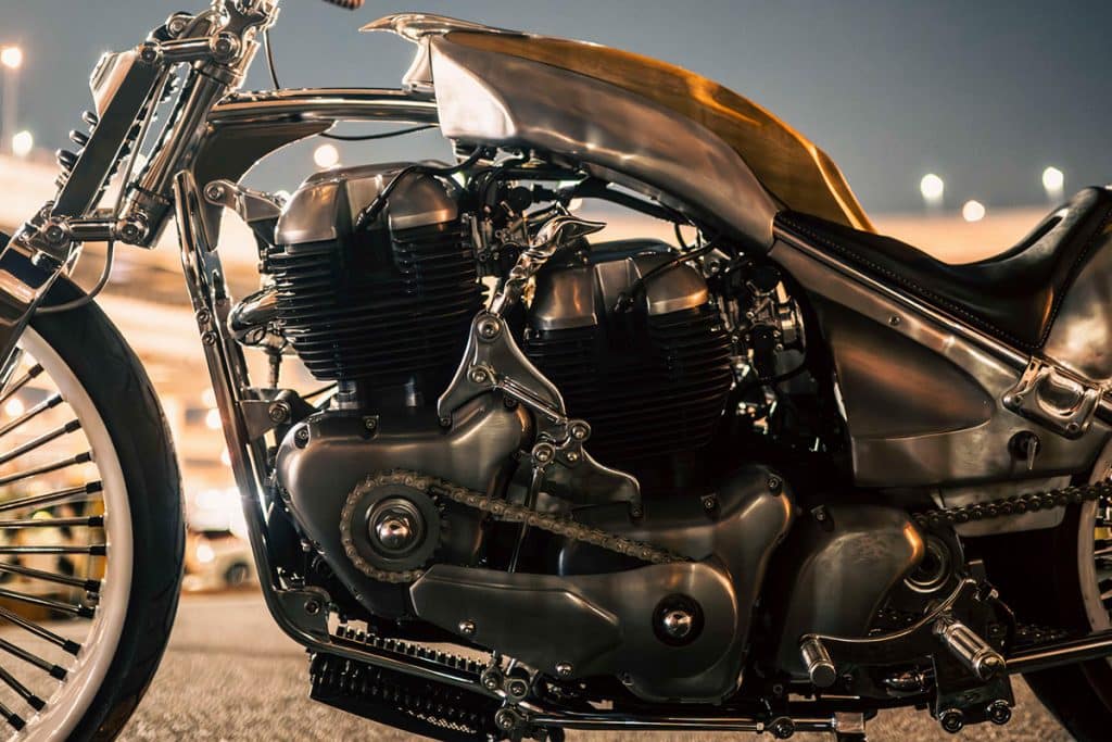 Omdat Royal Enfield’s 650 een 270-graden krukas gebruikt, draait geen enkele zuiger exact tegelijk – dat levert die typische roffel op. Combineer er twee, en je creëert een vibratiecocktail die om absolute precisie schreeuwt. Hoe Custom Works Zon dat heeft getemd, is niet bekend. Geen technische fiches, geen testdata – alleen een verleidelijke chopper met veel vragen en nul antwoorden.