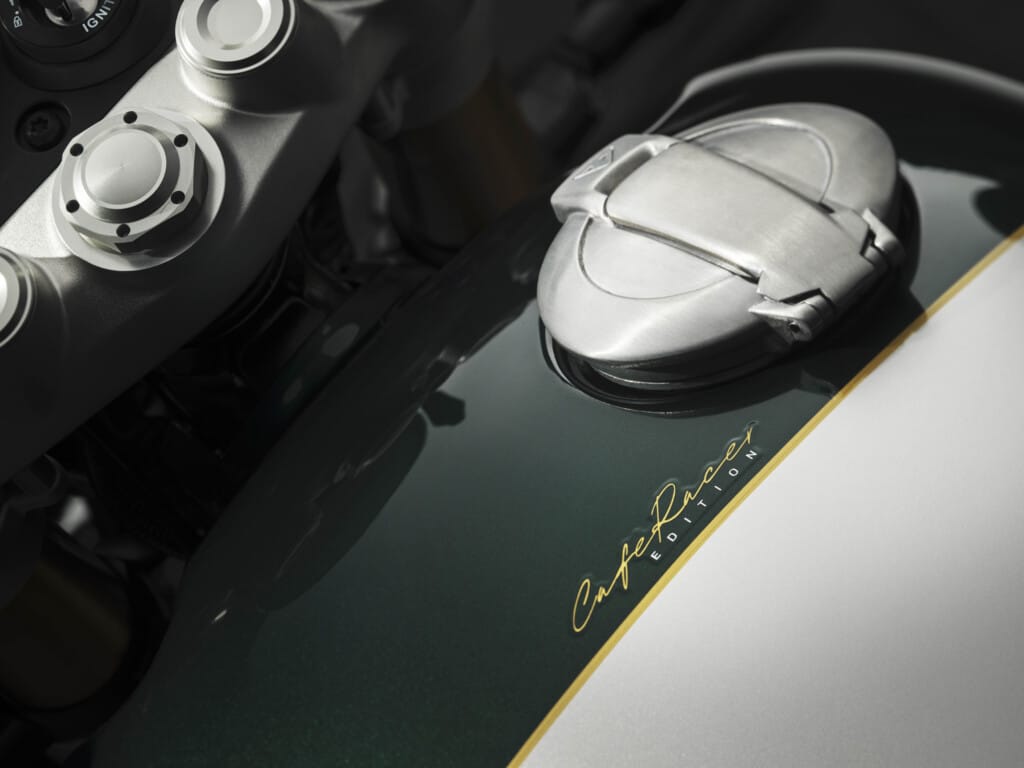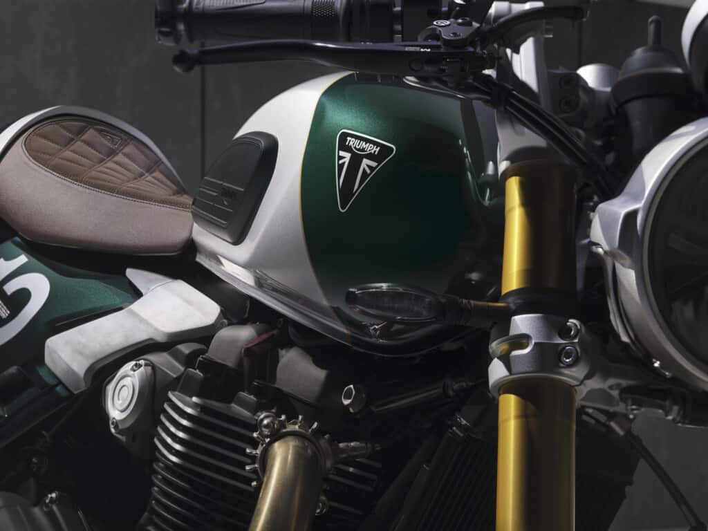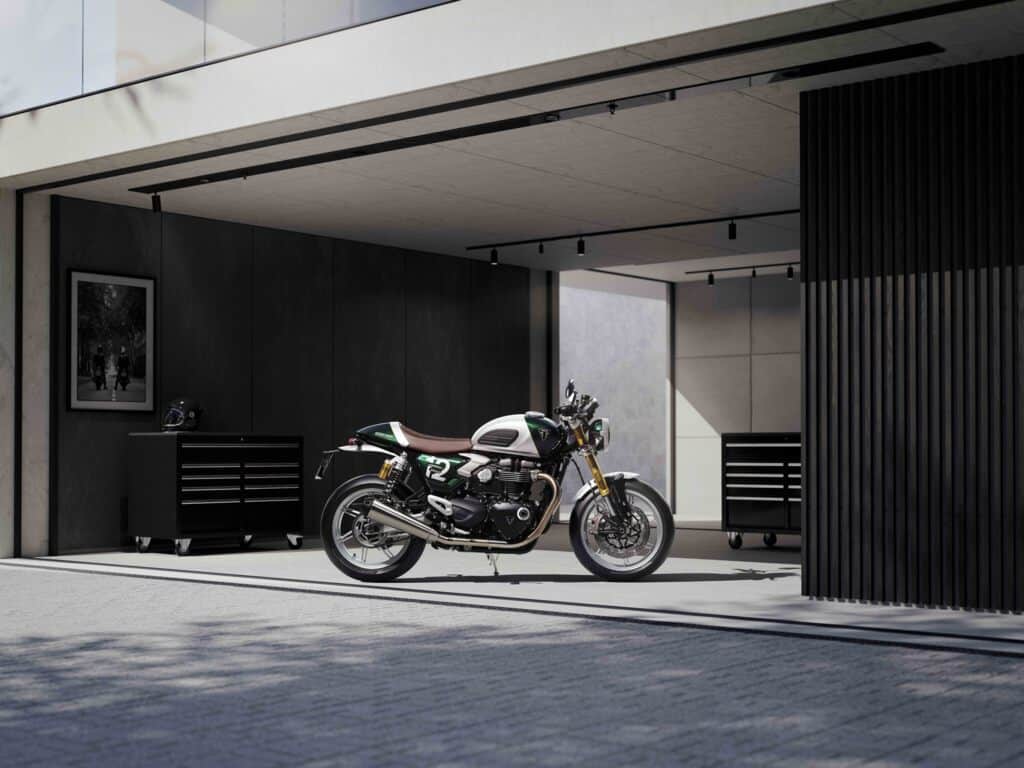 De motor heeft een uitgesproken sportieve geometrie met lage clip-ons en een smal, oplopend achterdeel, wat zorgt voor een agressieve rijhouding. De kleurafwerking – Competition Green met Aluminium Silver – verwijst naar Triumphs raceverleden.